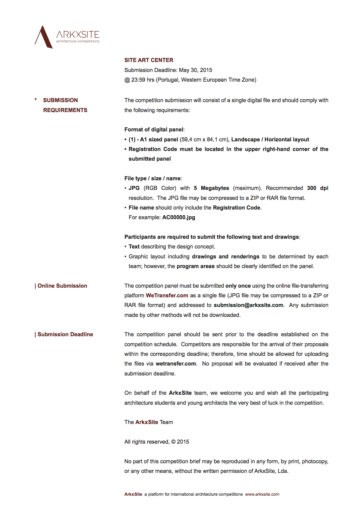 Note: All competition submissions are to remain anonymous throughout the competition phase and will only be identified using the registration code assigned by ArkxSite during the registration process. No entry will be reviewed or evaluated that contains any mark, logo or other indication of the identity of the team members located on the competition panel.