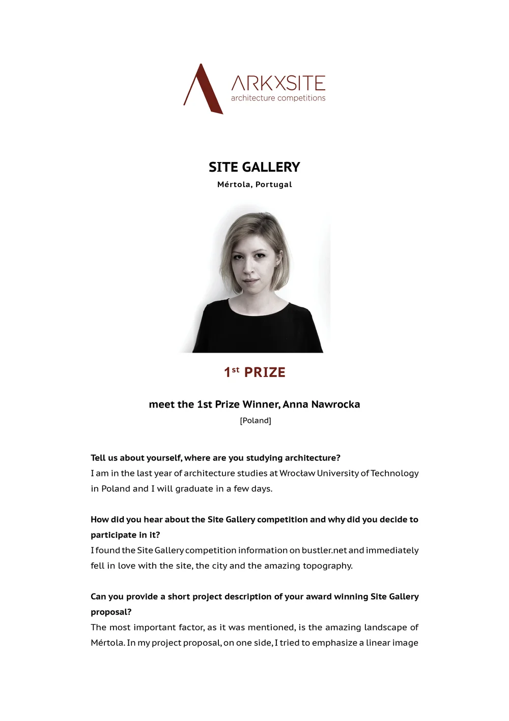 1st, 2nd and 3rd Prizes will be published on the Media Partner's websites, on the ArkxSite gallery page and related social media.