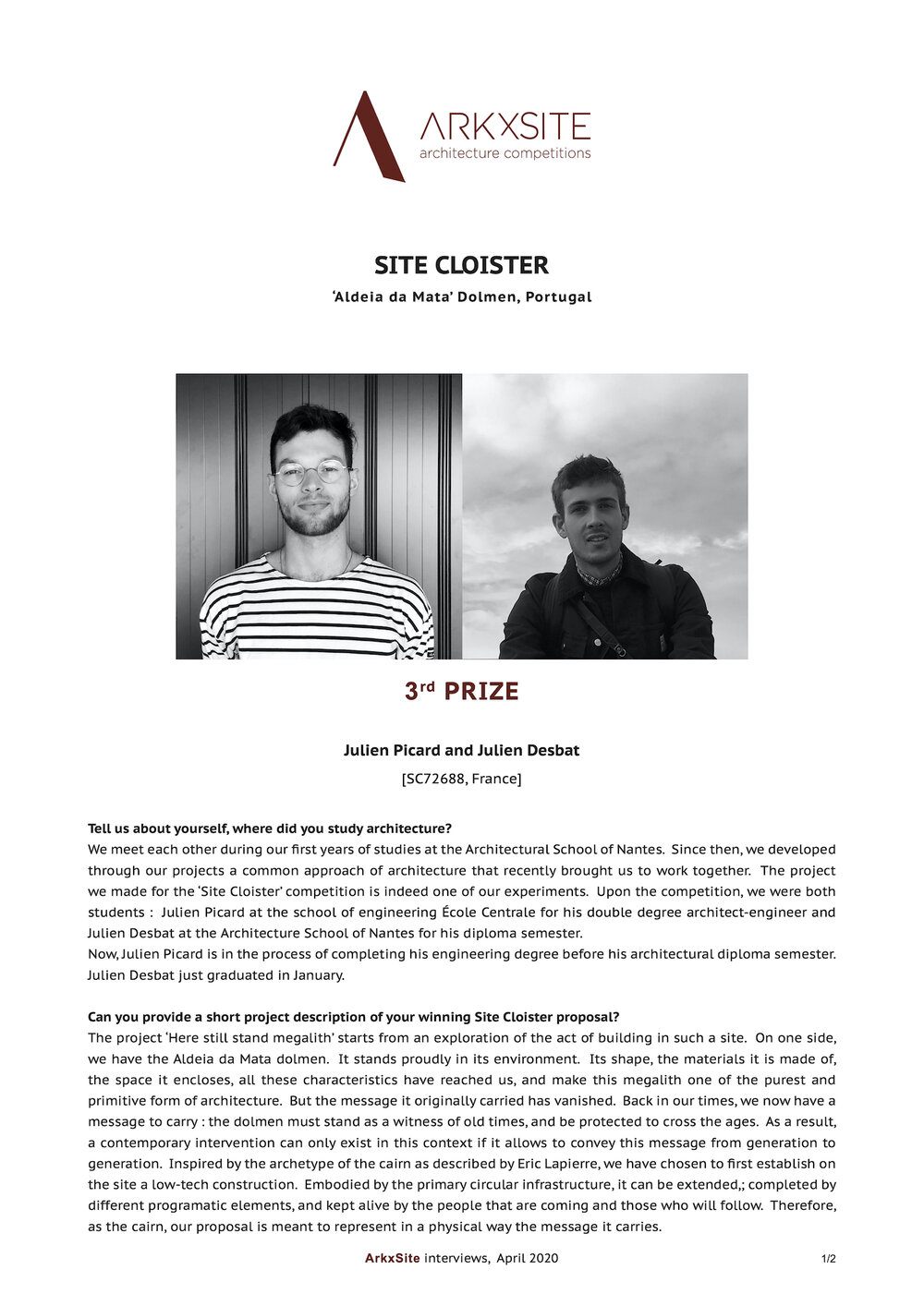 Past Competition SITE CLOISTER _ Say Hello To The 3rd Prize Winners _ Julien Picard + Julien Desbat (France) !