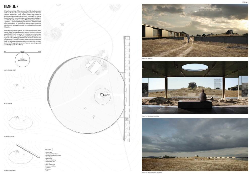 This proposal takes the circular reference of the traditional cloister and creates a fluid experience for the user without enclosing the dolmen; the exploration of the site now is diverse; the new construction is transparent and provides different frames to experience the area, from the structure and from the ground.