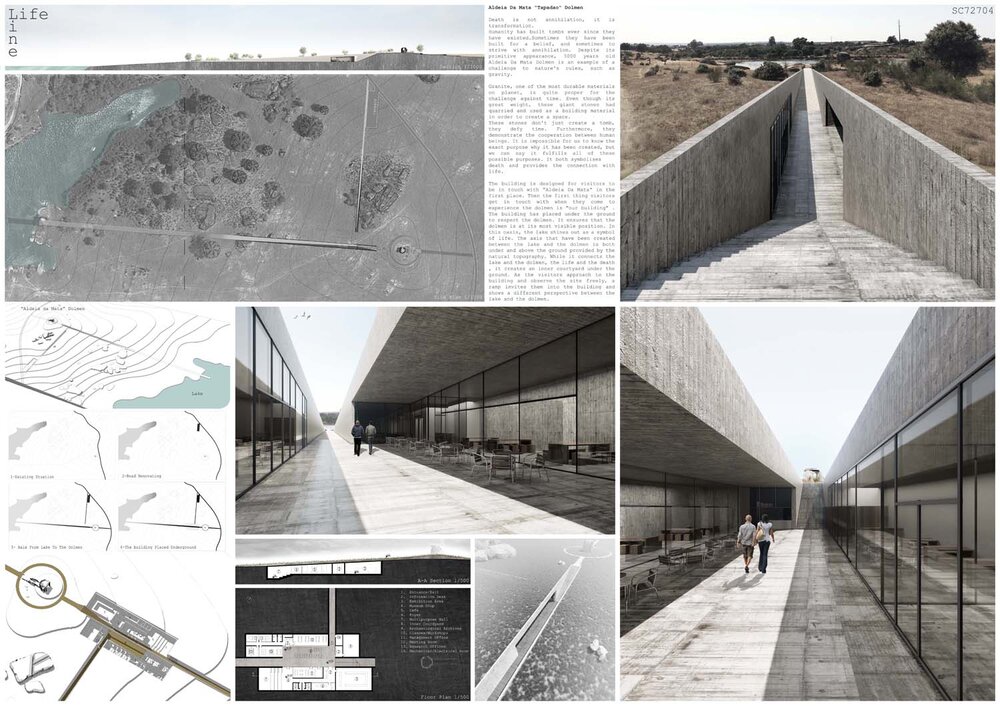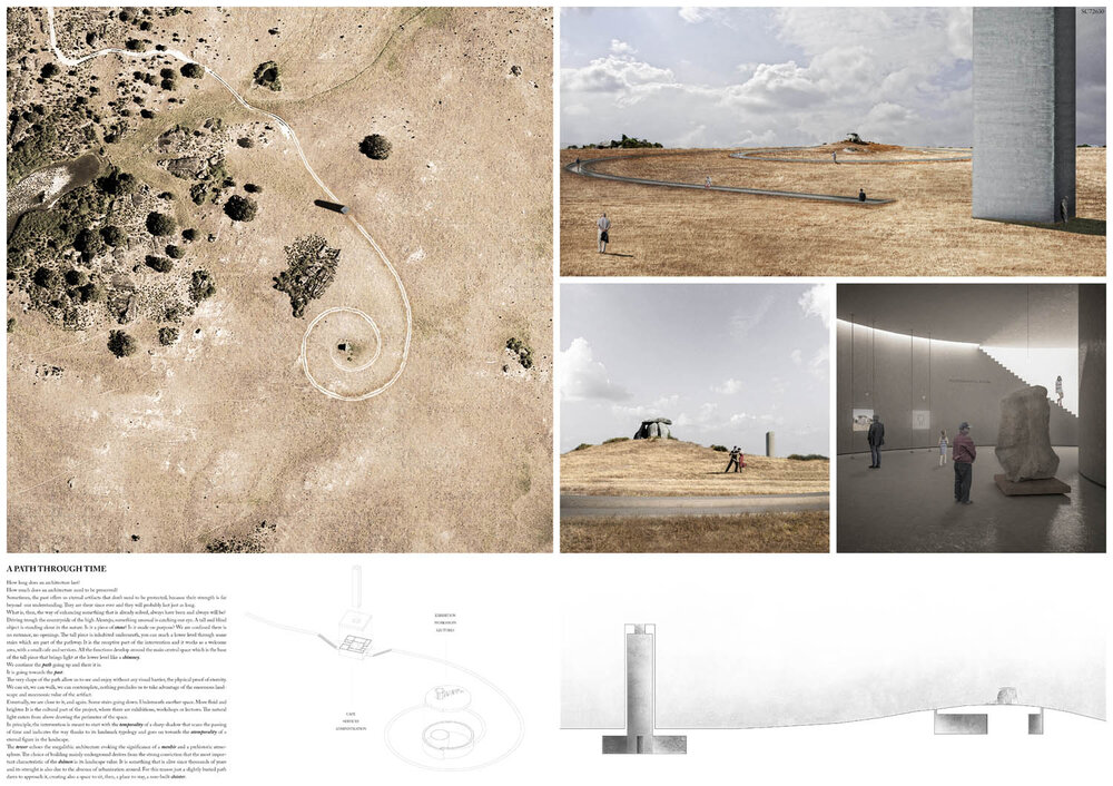 This proposal demonstrates a subtle but powerful gesture over the site. It doesn’t compete with the dolmen; it allows the visitors to choose between following the new path or visiting the dolmen as it has always been. The representation is simple and congruent, showing a sensitive understanding on the use of materials for the contemporary presence of the building.