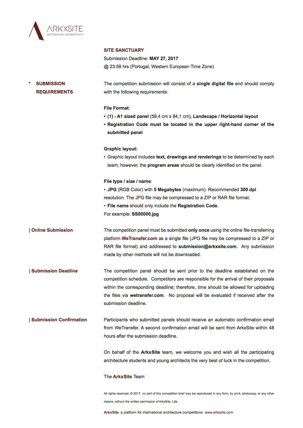 Note: All competition submissions are to remain anonymous throughout the competition phase and will only be identified using the registration code assigned by ArkxSite during the registration process.  No entry will be reviewed or evaluated that contains any mark, logo or other indication of the identity of the team members located on the competition panel.