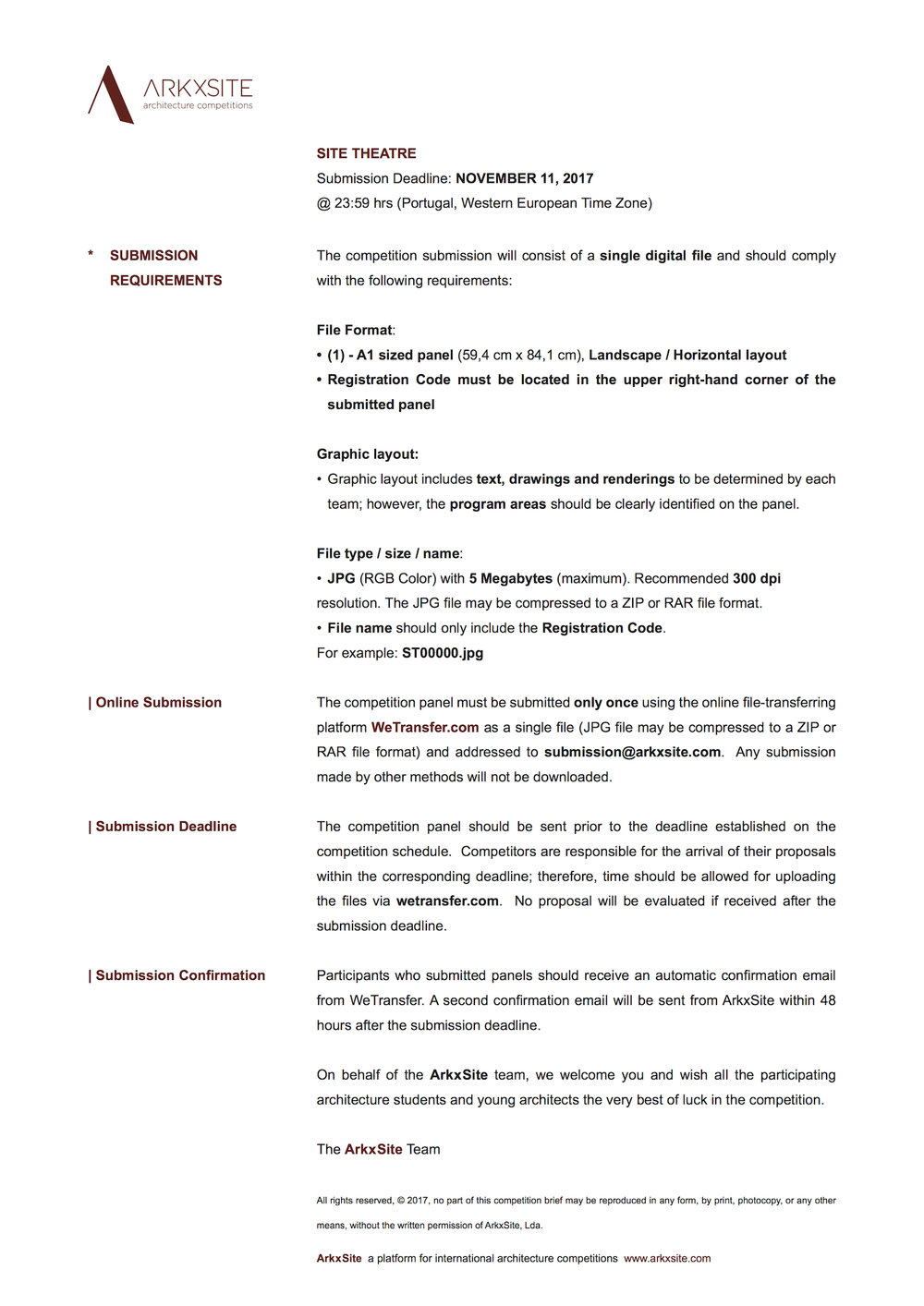 Note: All competition submissions are to remain anonymous throughout the competition phase and will only be identified using the registration code assigned by ArkxSite during the registration process. No entry will be reviewed or evaluated that contains any mark, logo or other indication of the identity of the team members located on the competition panel.