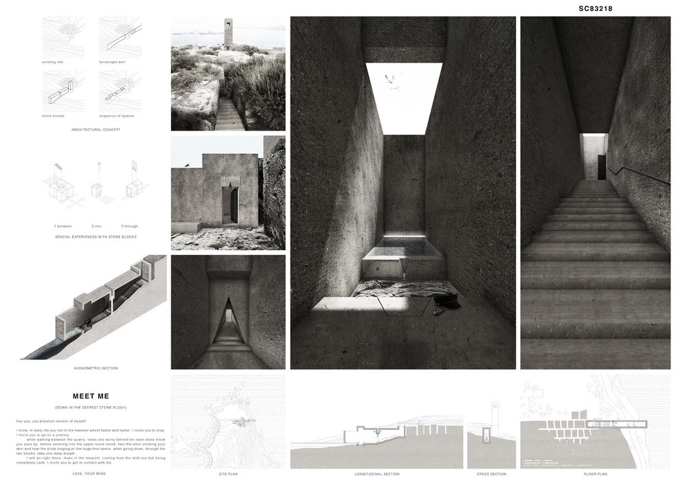 The project proposes a linear path of meditation, which invites the visitor to a personal meditation. The transition from light to shadow generates different atmospheres. The tower that looks towards the ocean represents a landmark but also a symbol of connection with the absolute.