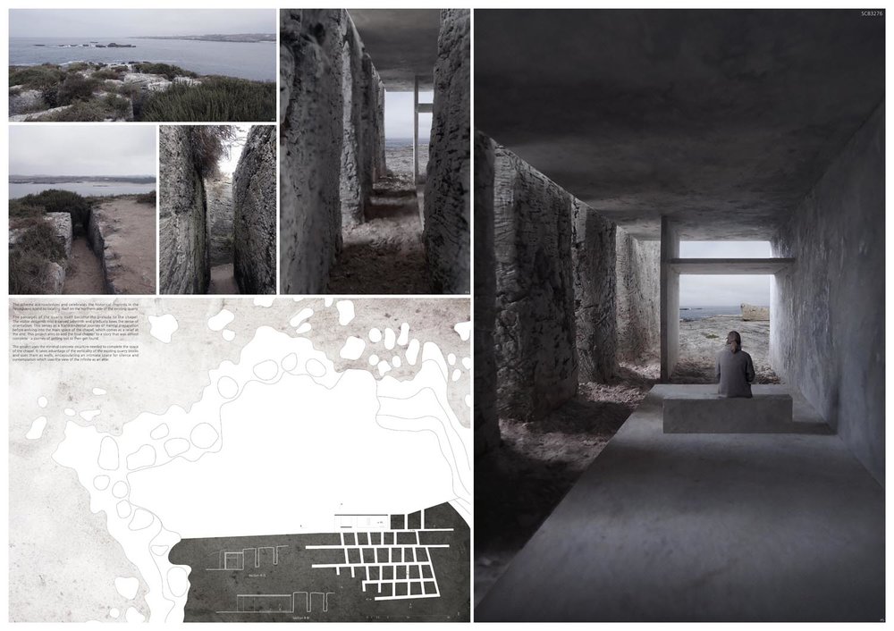 Although the idea of interposing the space of the chapel in the path between the monoliths is debatable, the fact of diverting attention to a new direction, towards the open sea, allows the visitor to be stopped and confronted with a landscape that leads to contemplation.