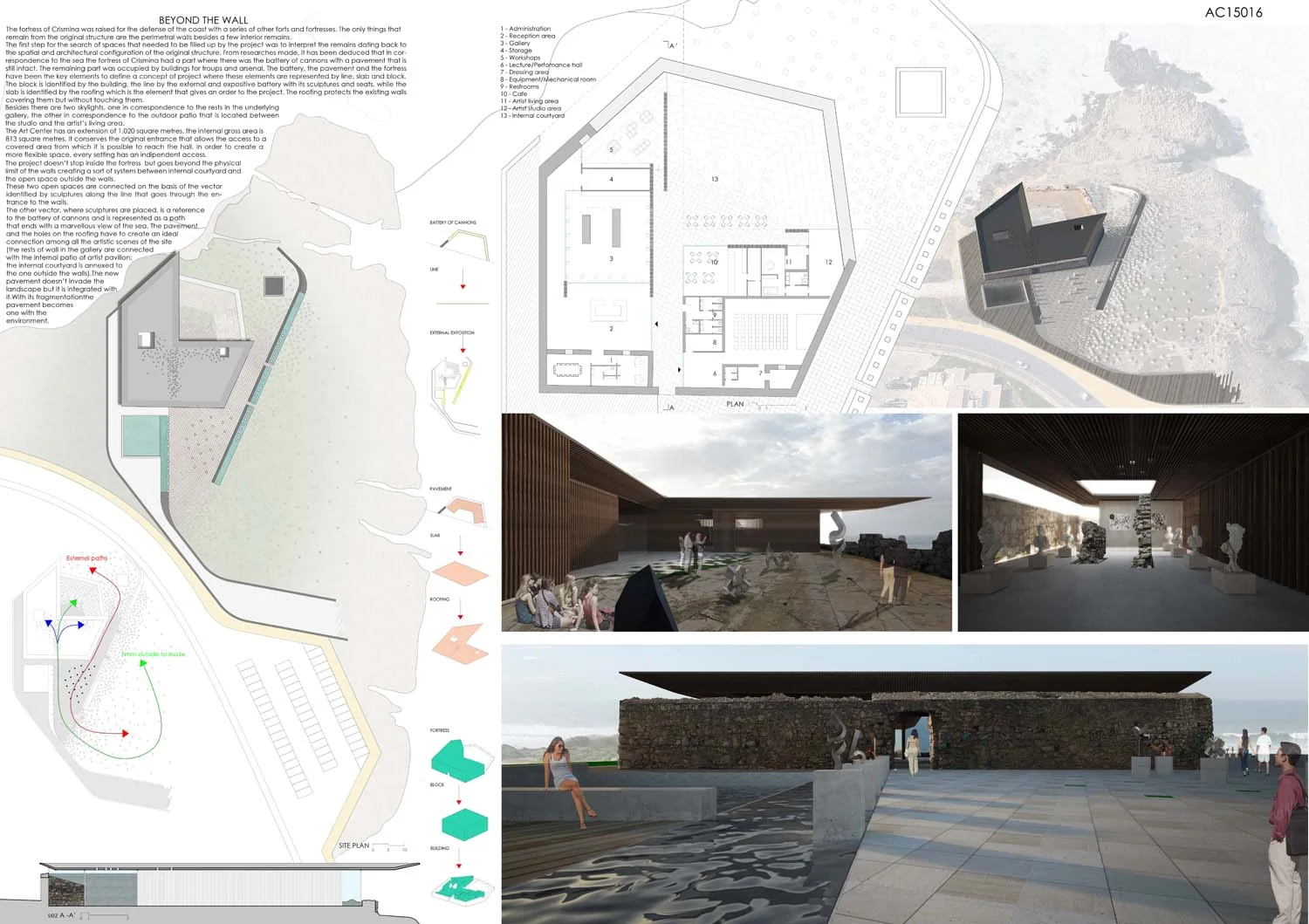 In this case the fortress becomes the main entrance for the Art Centre while the three underground spaces open towards the ocean and in that way generate a new coastal skyline.
