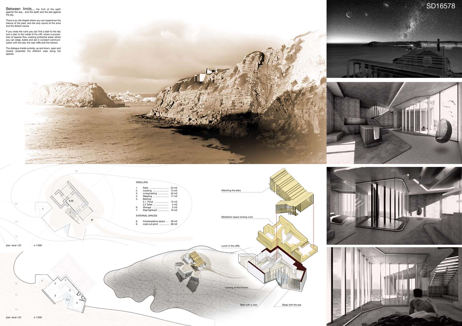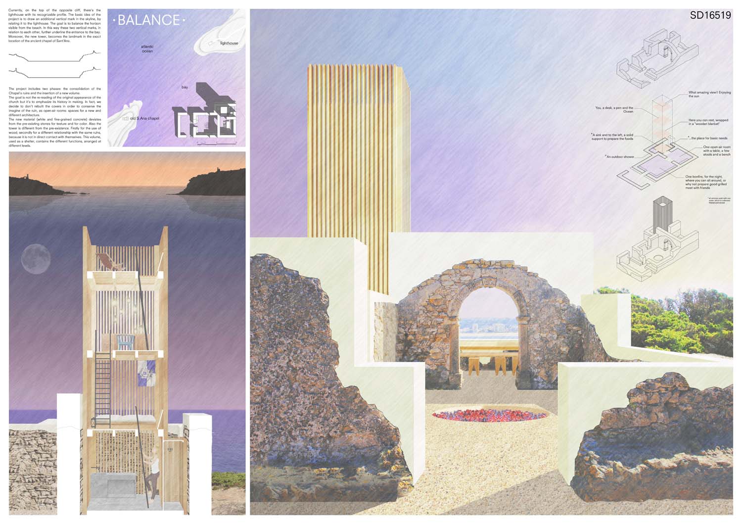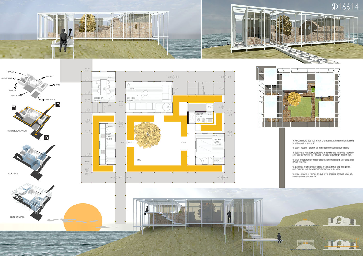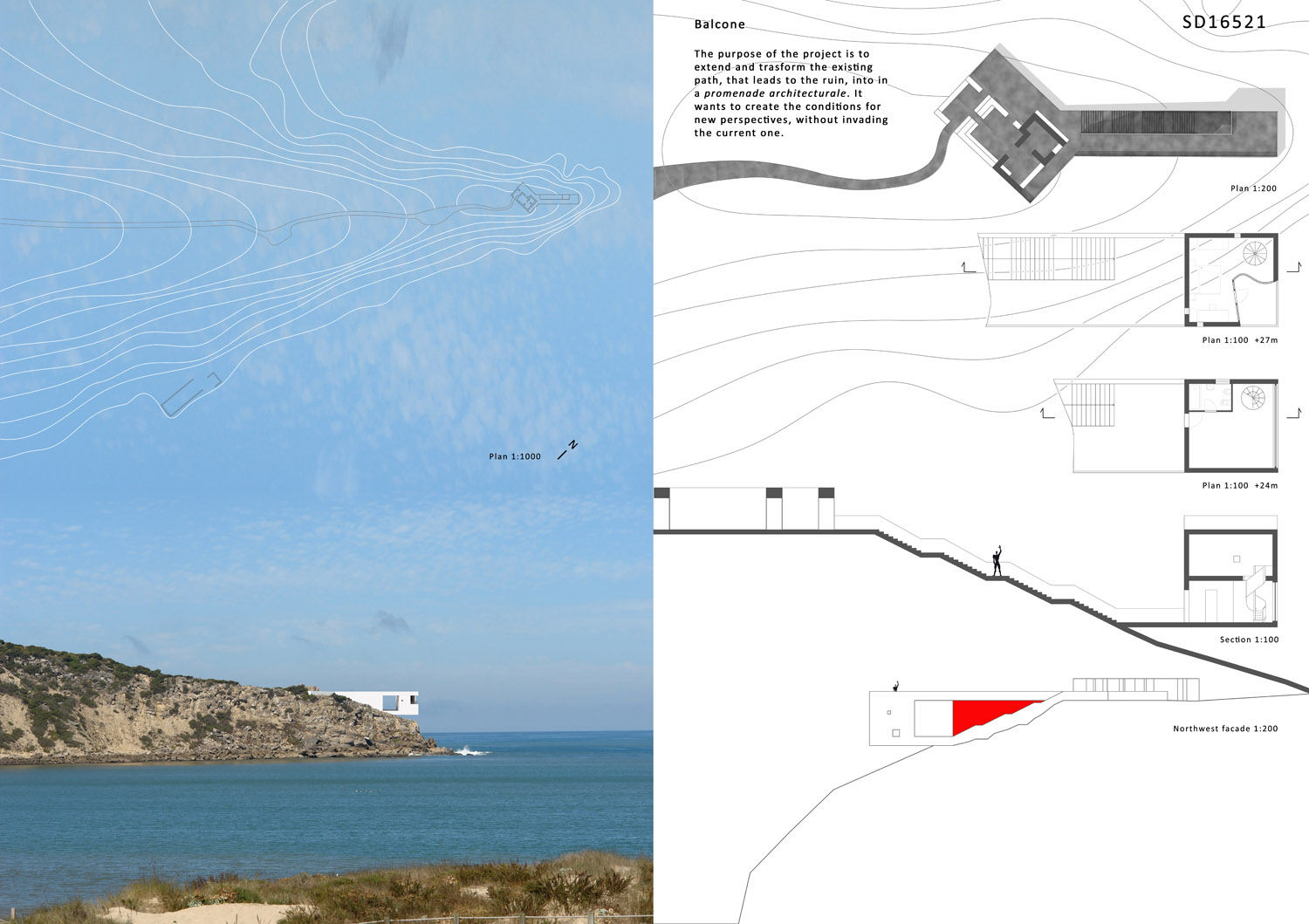 The project does not give up to work and interact with the ruins. The contrast between the horizontal axis of the look-out point open to the beach, and the vertical axis of a new space over the ruins, but closed to the landscape, is quite interesting.