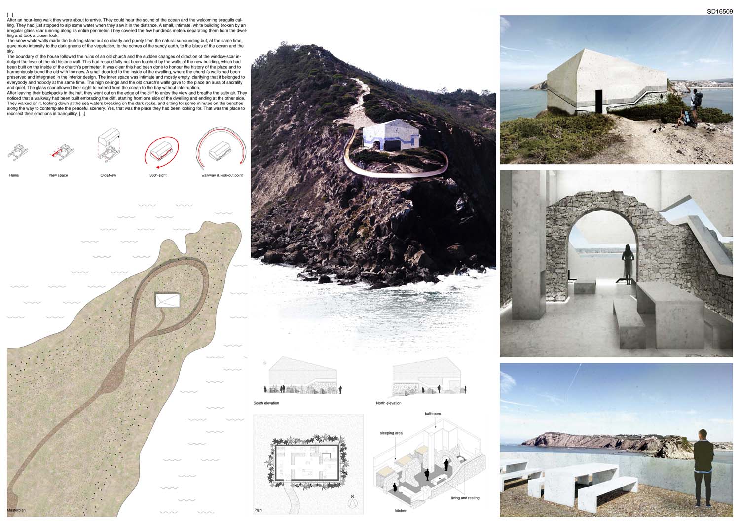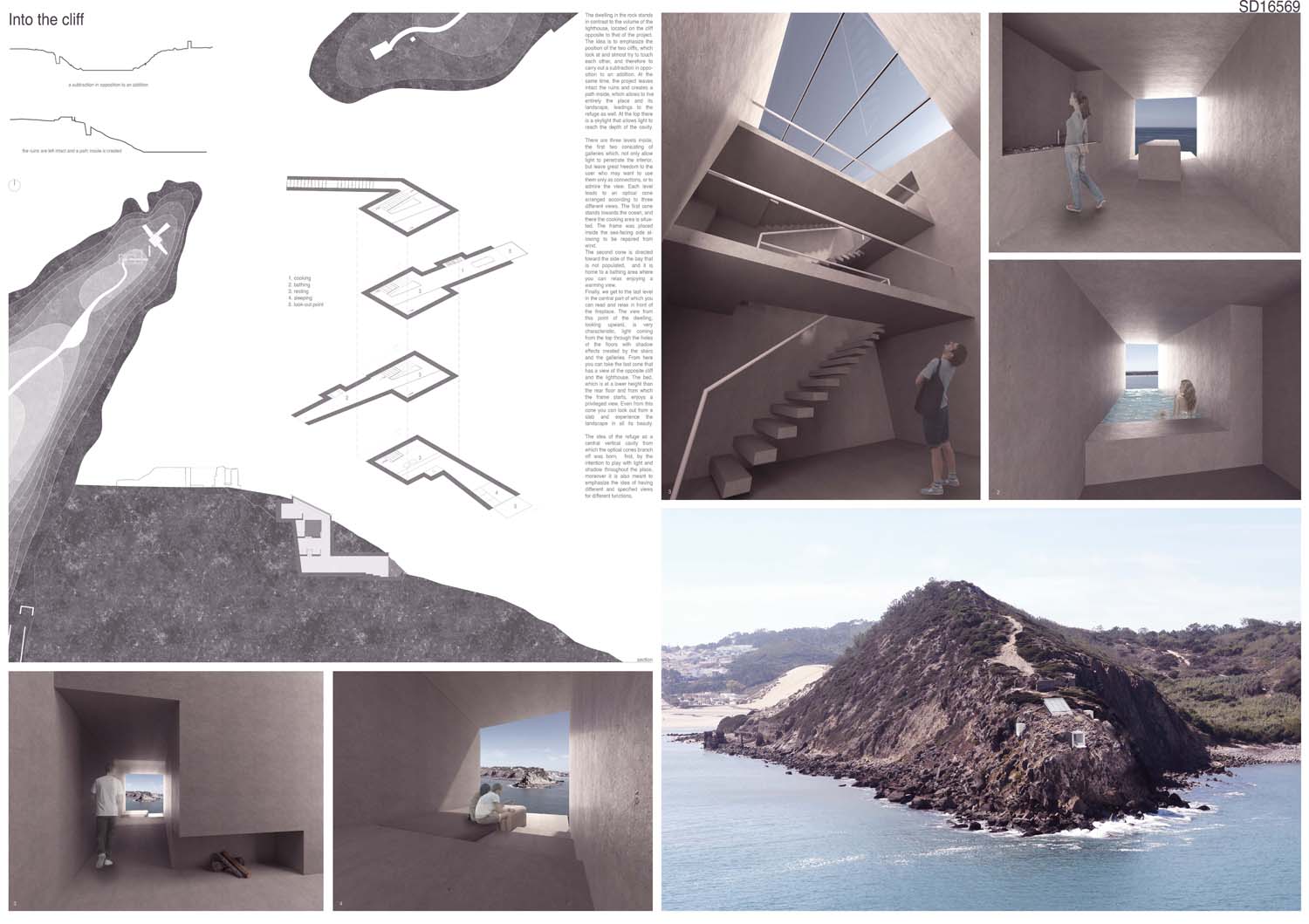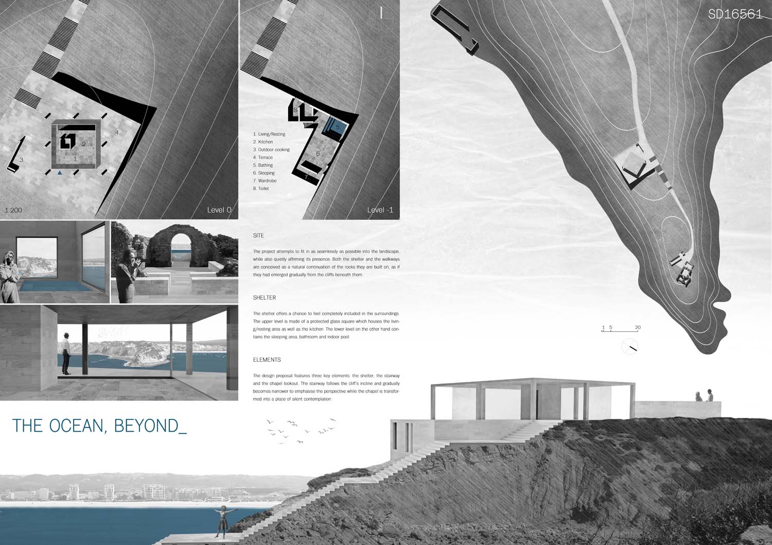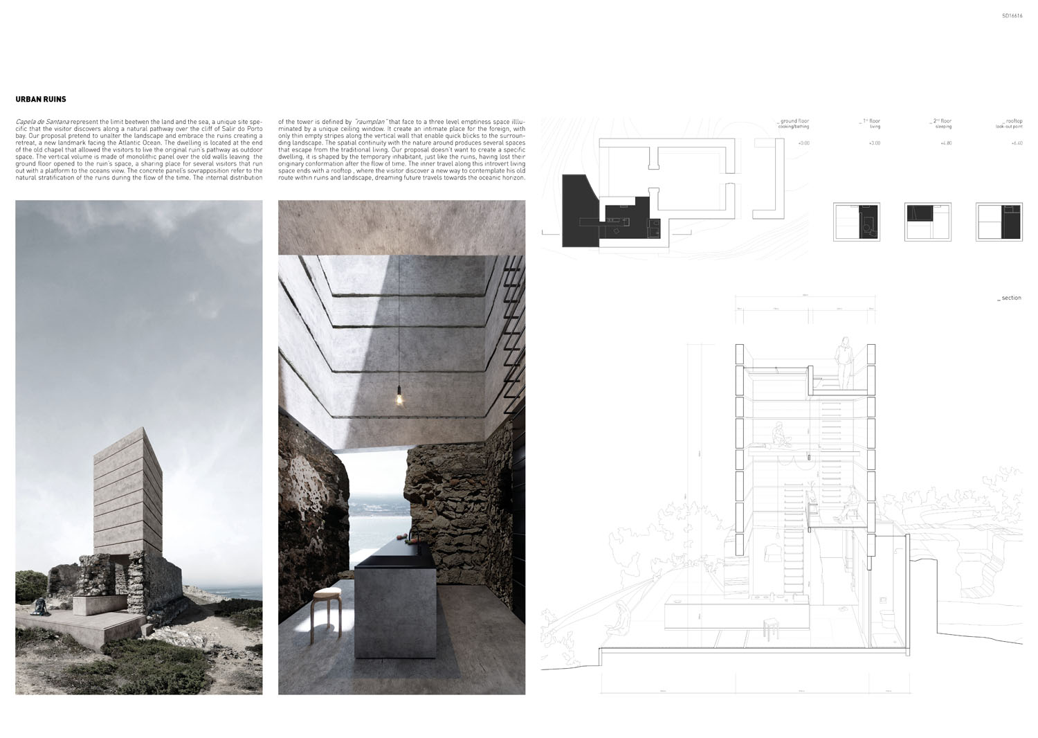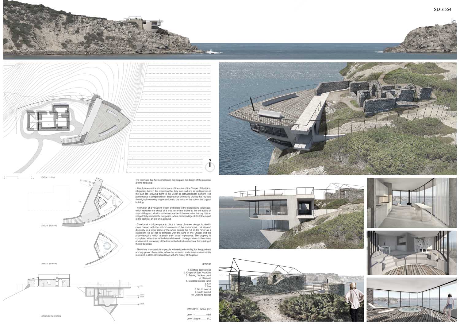 The project does not give up to work and interact with the ruins. The contrast between the horizontal axis of the look-out point open to the beach, and the vertical axis of a new space over the ruins, but closed to the landscape, is quite interesting.