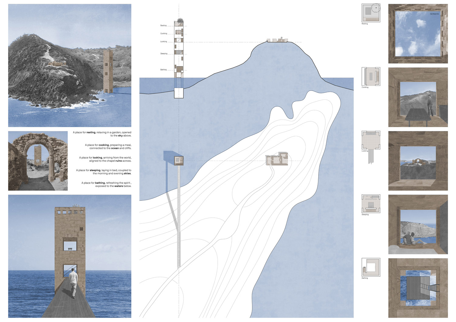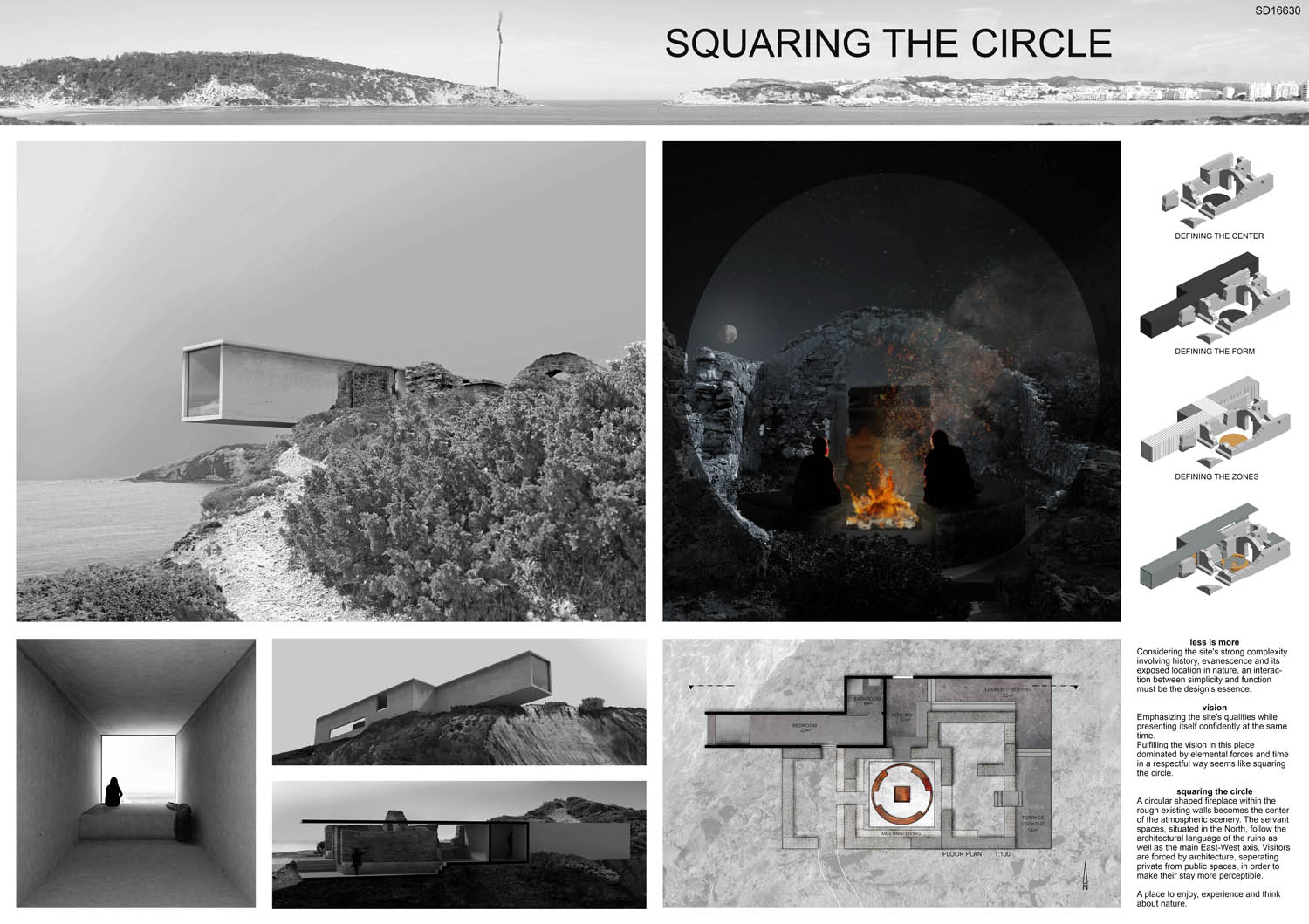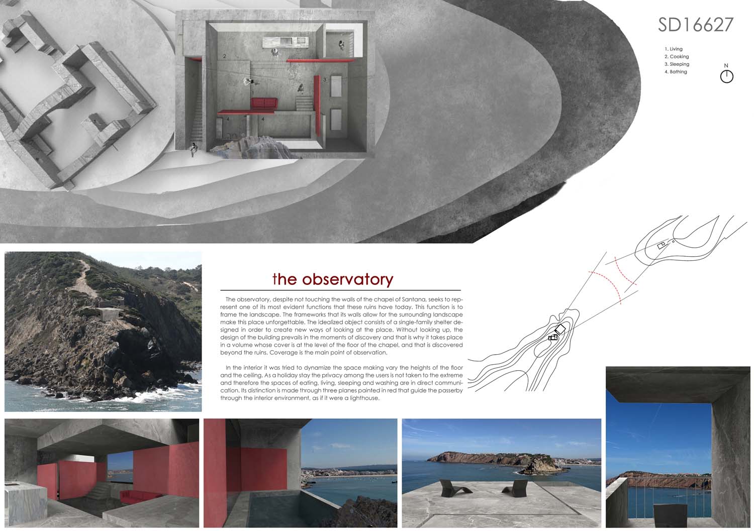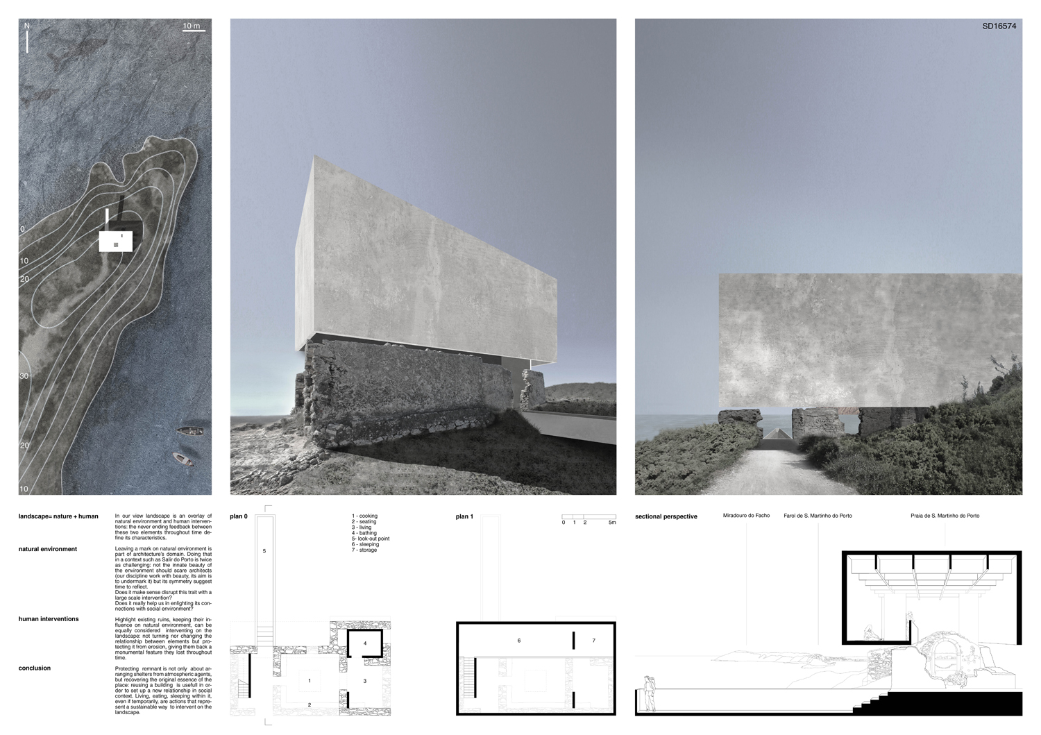 The project does not give up to work and interact with the ruins. The contrast between the horizontal axis of the look-out point open to the beach, and the vertical axis of a new space over the ruins, but closed to the landscape, is quite interesting.