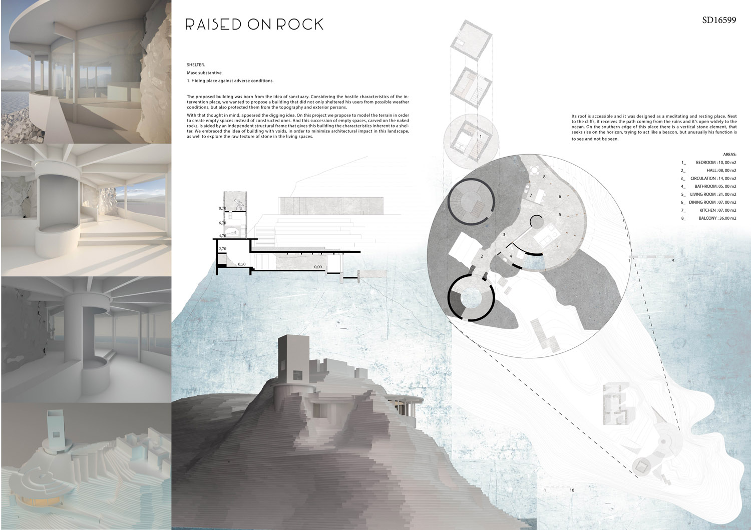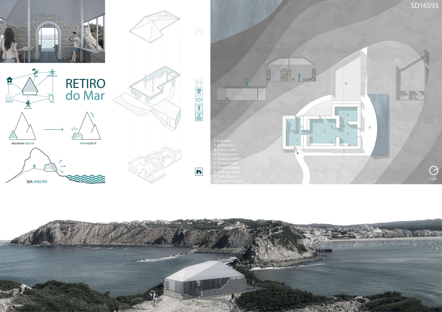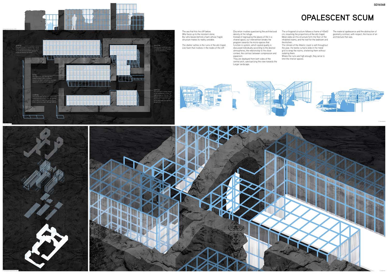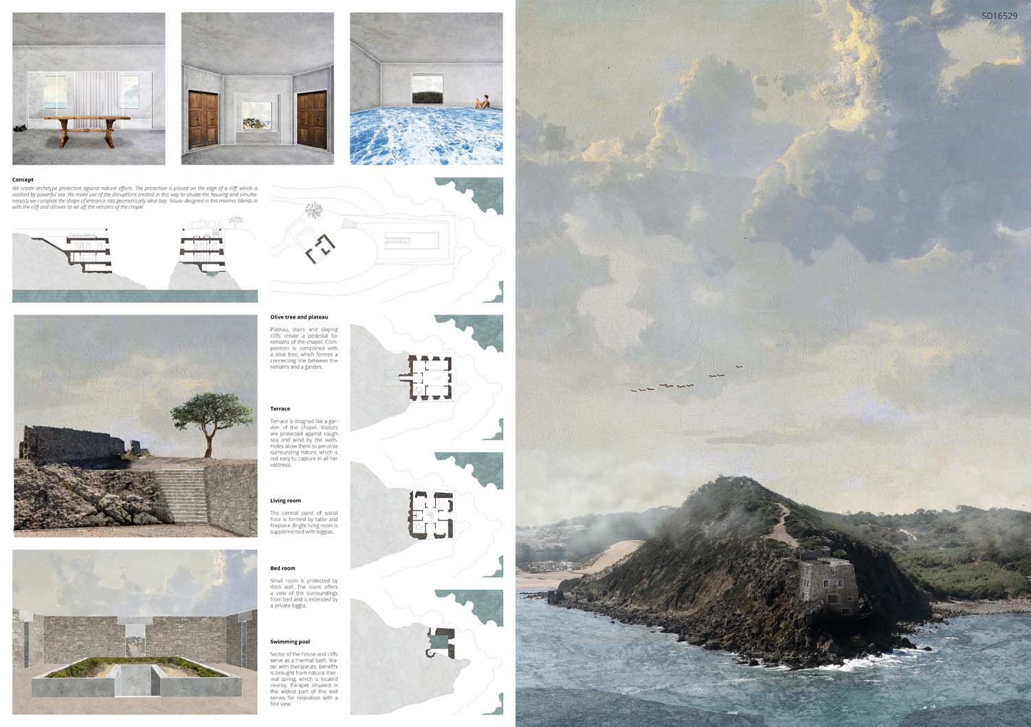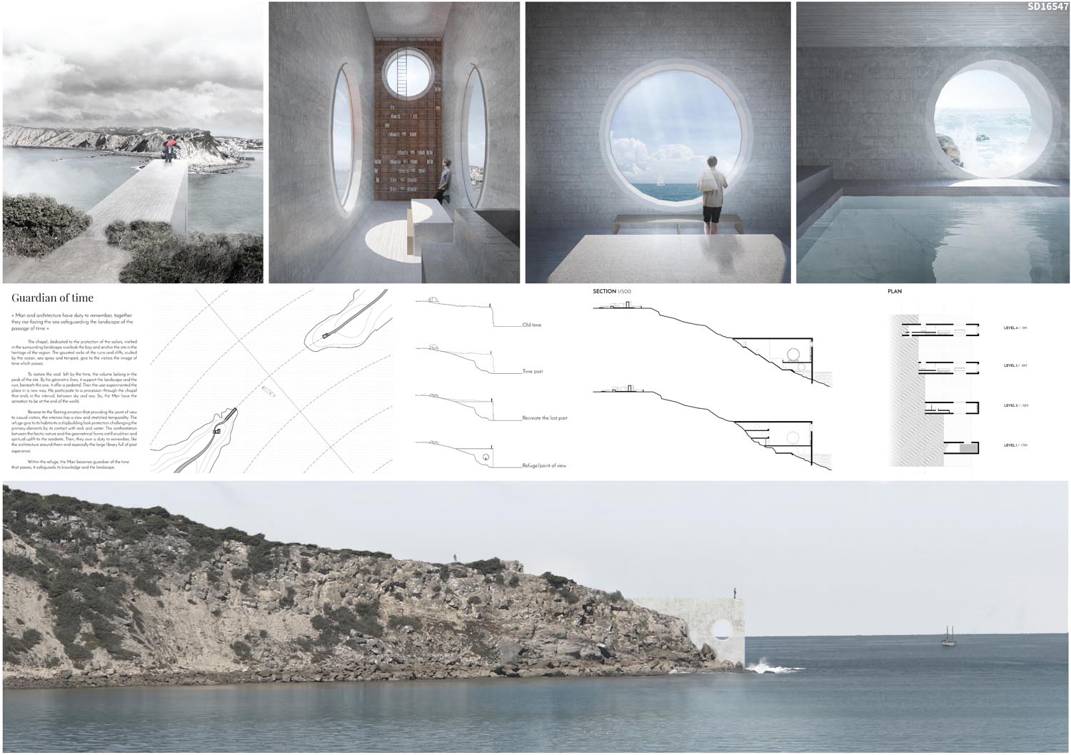 The project does not give up to work and interact with the ruins. The contrast between the horizontal axis of the look-out point open to the beach, and the vertical axis of a new space over the ruins, but closed to the landscape, is quite interesting.