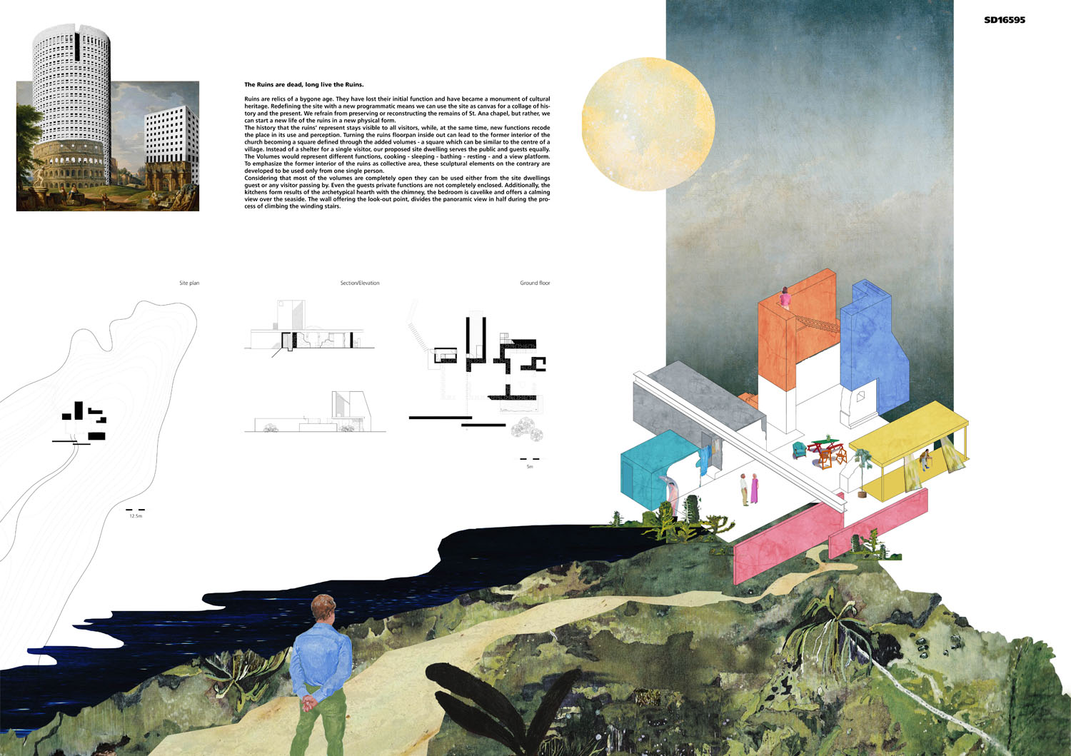 The approach is simple and elegant. The intervention is carefully placed above the ruins, creating an interesting balance between new and old, at the same time as it creates interesting spaces. The proposal turns the ruins into a new attraction, maintaining the ruins as the main part and adding just the necessary structure to fulfill the program. The presentation is solid and clear, and is without a doubt the best proposal in the competition.