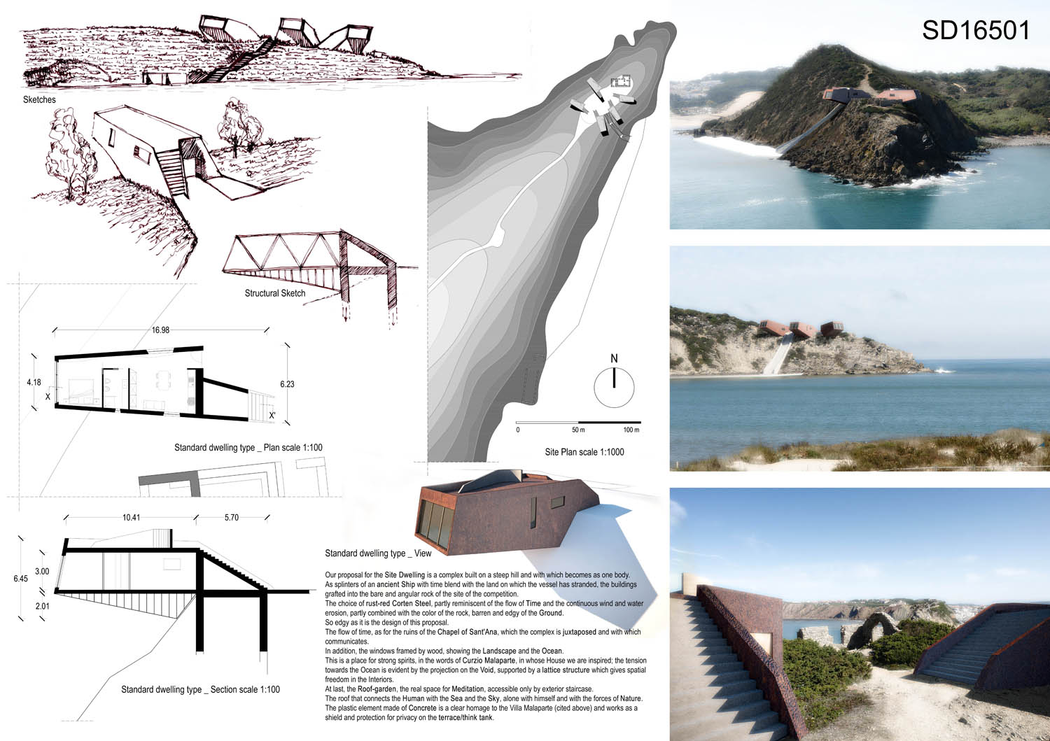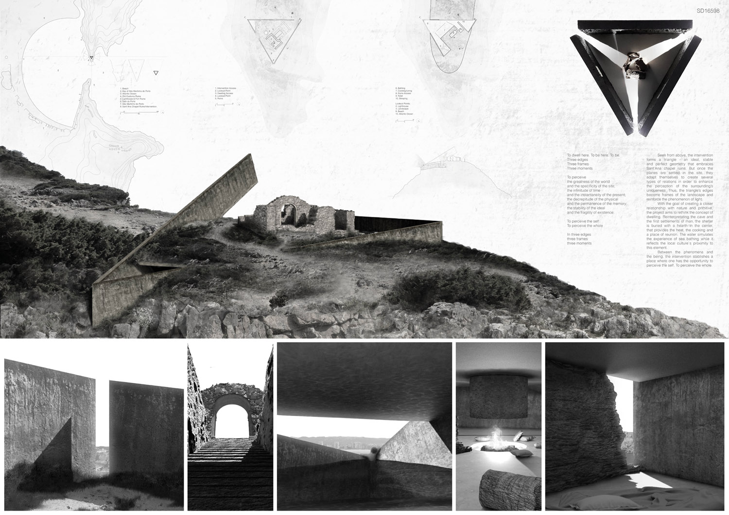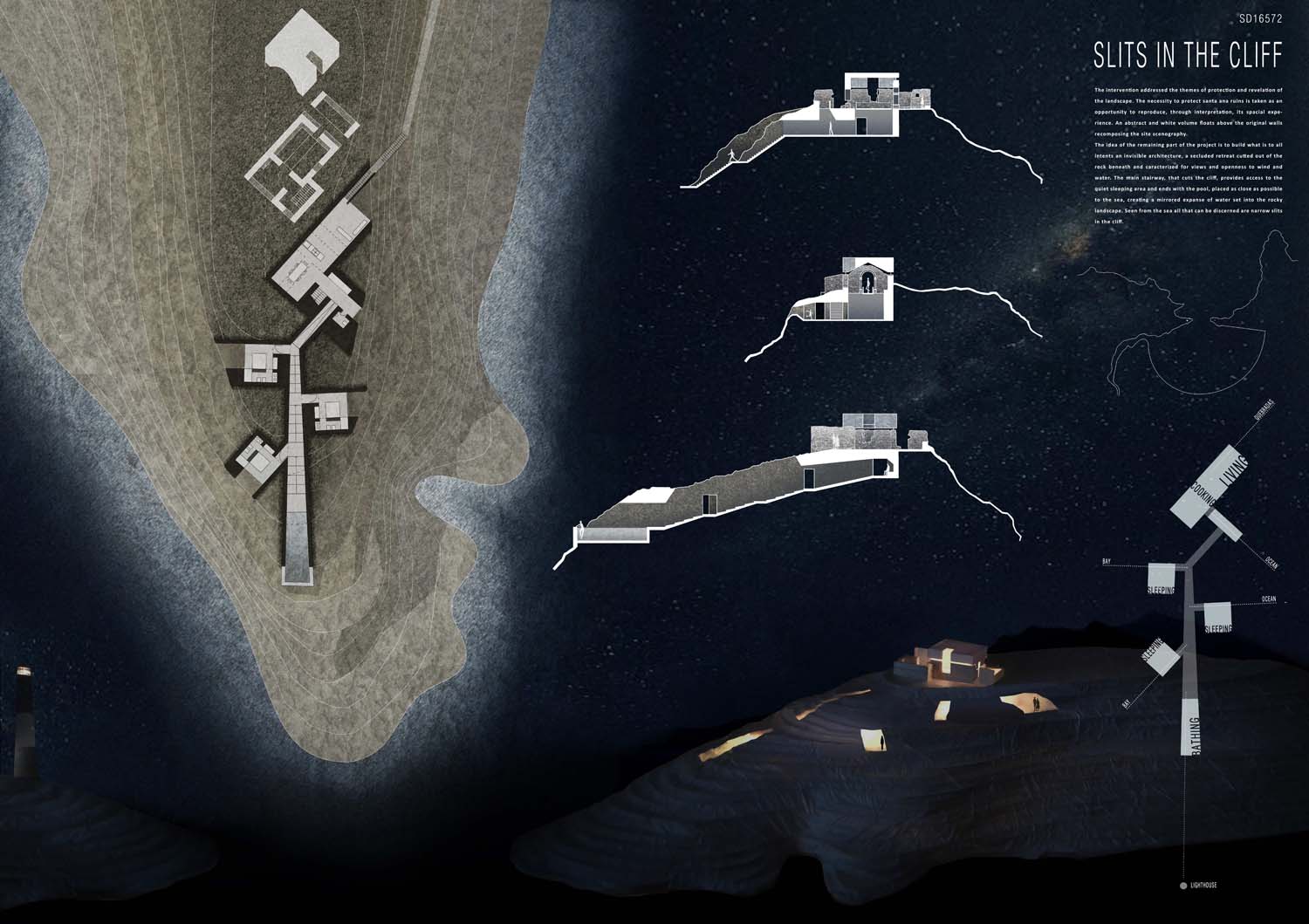 The proposal is both functional and sculptural. Its strongest feature is the changing expression of the structure depending on where the spectator is placed. From the town and beach the structure is perceived as a great wall, yet it almost disappears when seen from the ruins. The program is easily solved, leaving the ruins untouched. The project provides a new access from the sea and expands the program in a natural and convincing manner.