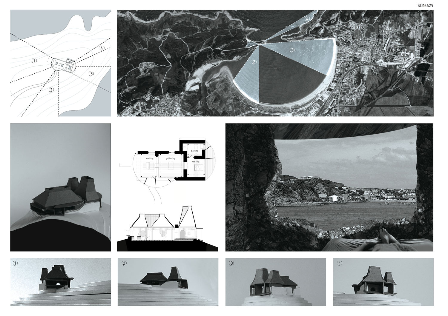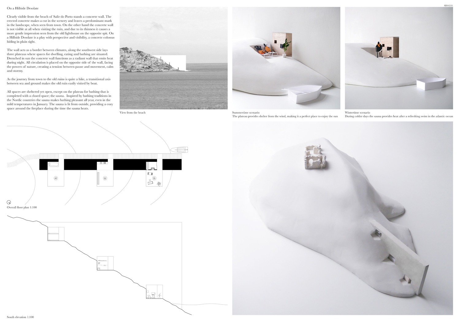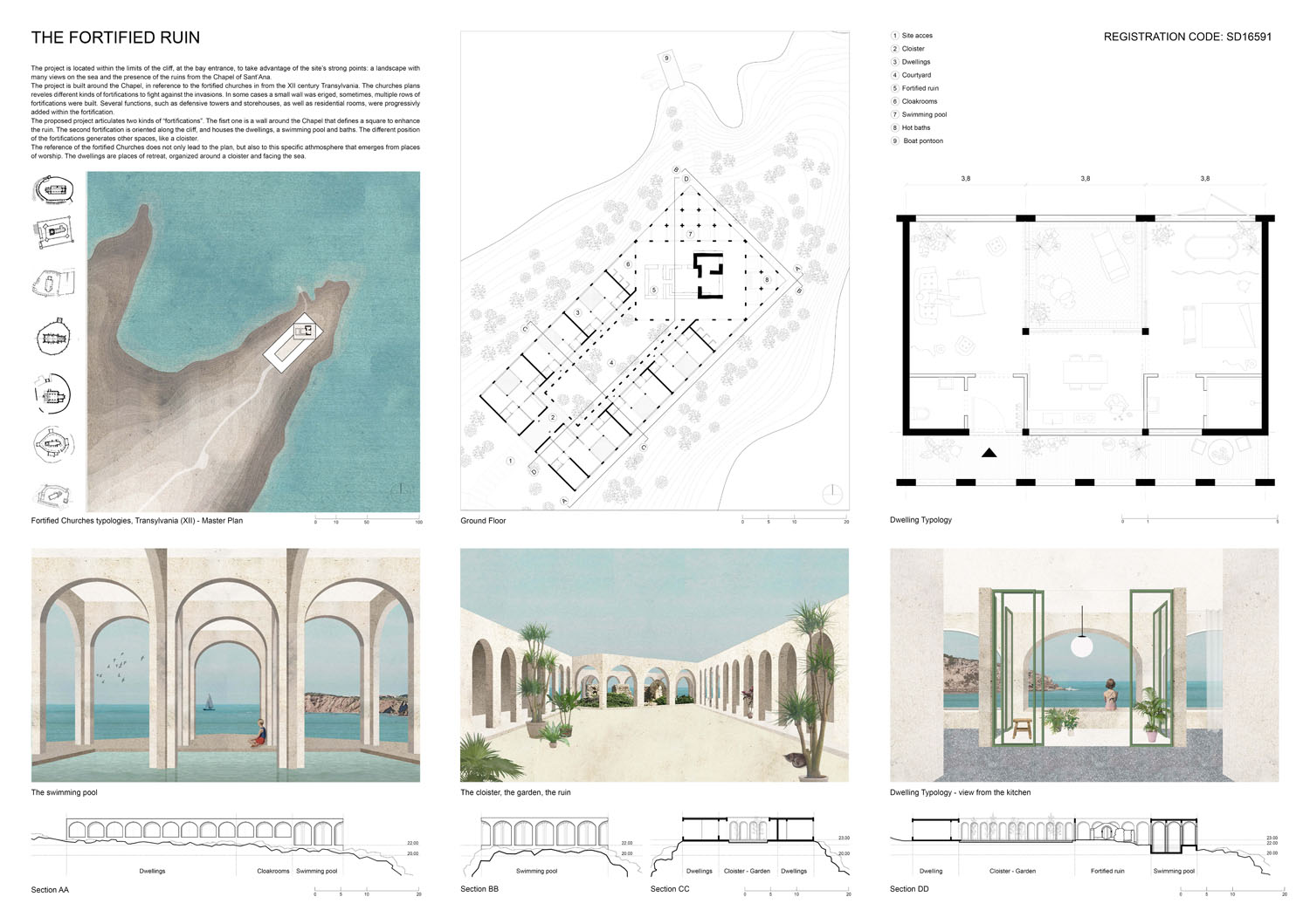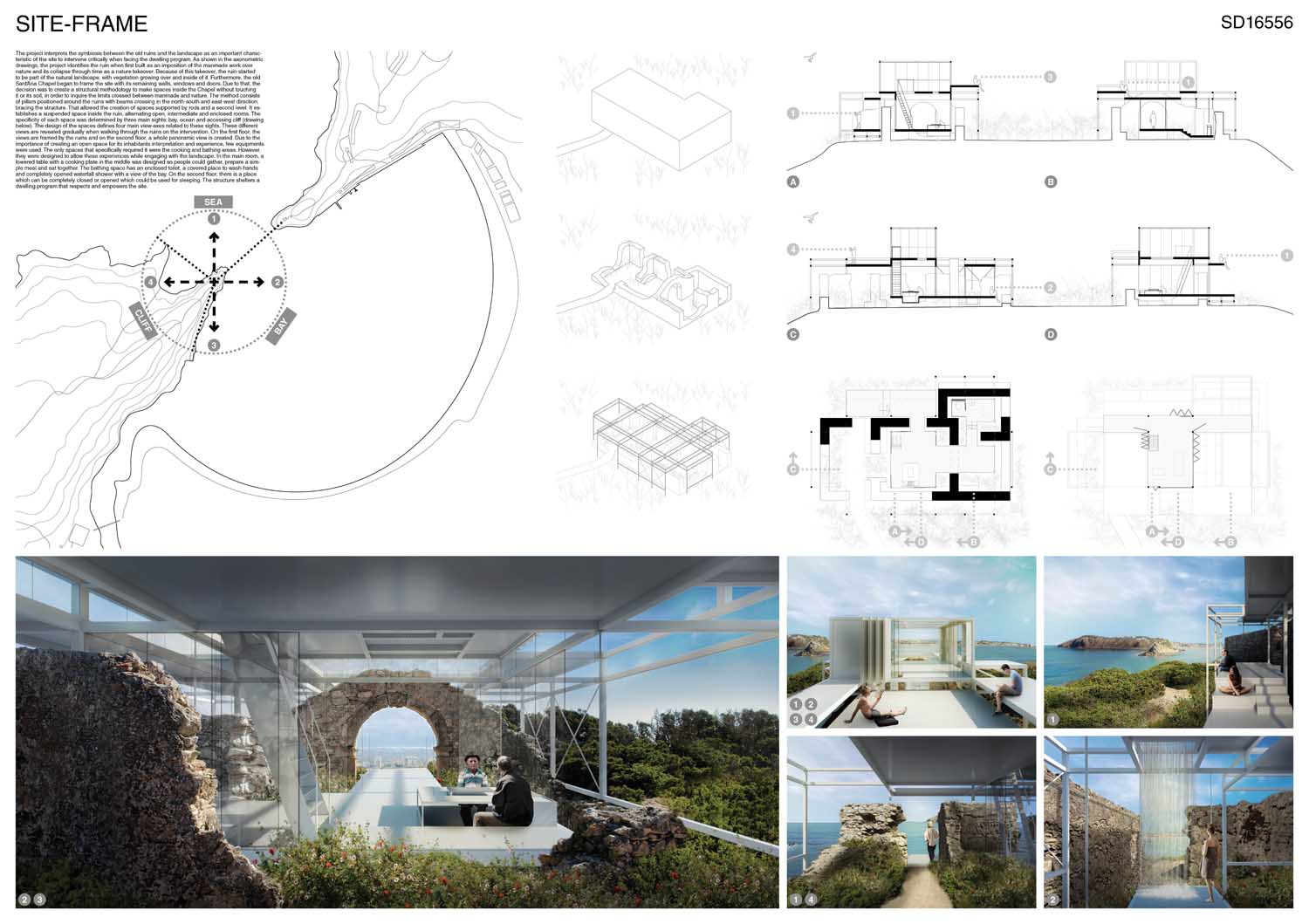 The proposal is both functional and sculptural. Its strongest feature is the changing expression of the structure depending on where the spectator is placed. From the town and beach the structure is perceived as a great wall, yet it almost disappears when seen from the ruins. The program is easily solved, leaving the ruins untouched. The project provides a new access from the sea and expands the program in a natural and convincing manner.