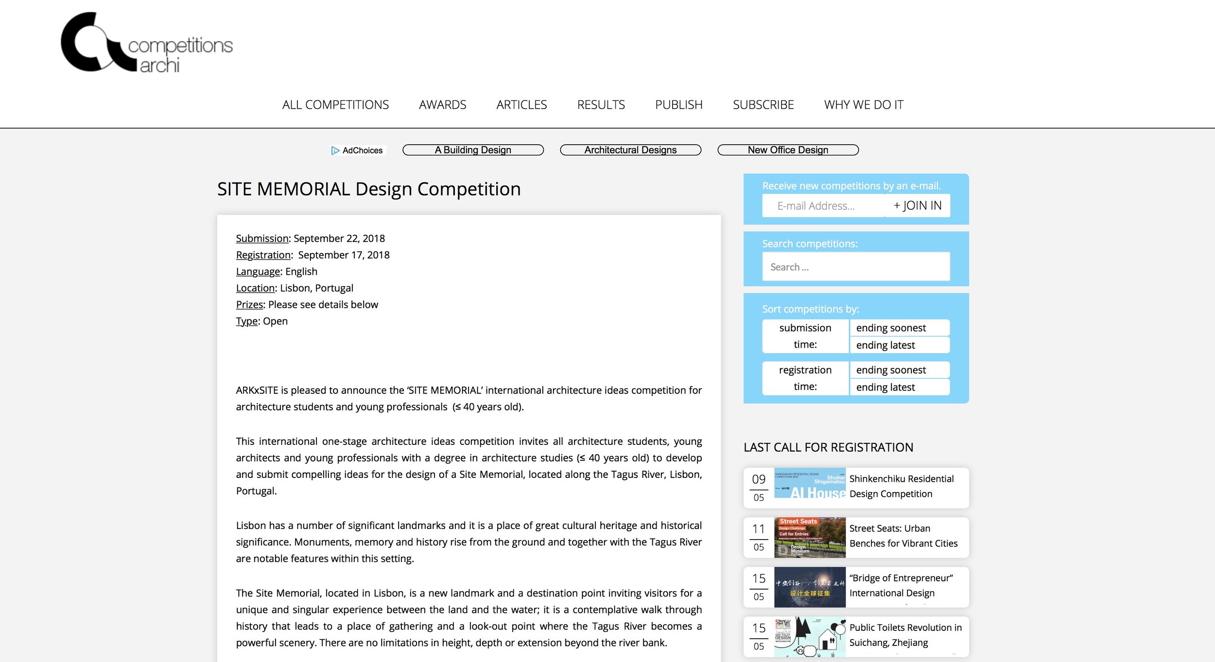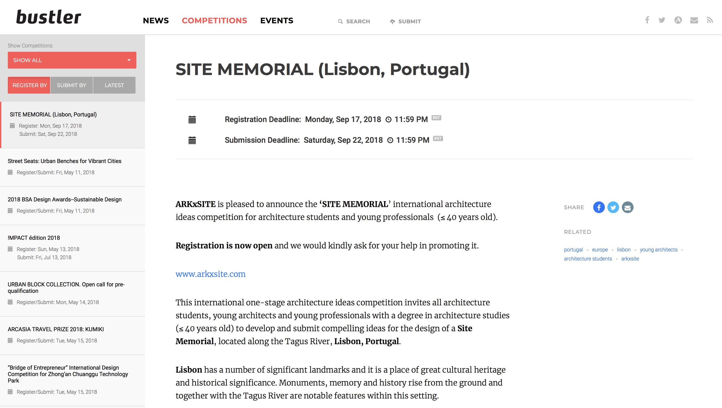 This international one-stage architecture ideas competition invites all architecture students, young architects and young professionals with a degree in architecture studies (≤ 40 years old) to develop and submit compelling ideas for the design of a Site Memorial located along the Tagus River, Lisbon, Portugal.