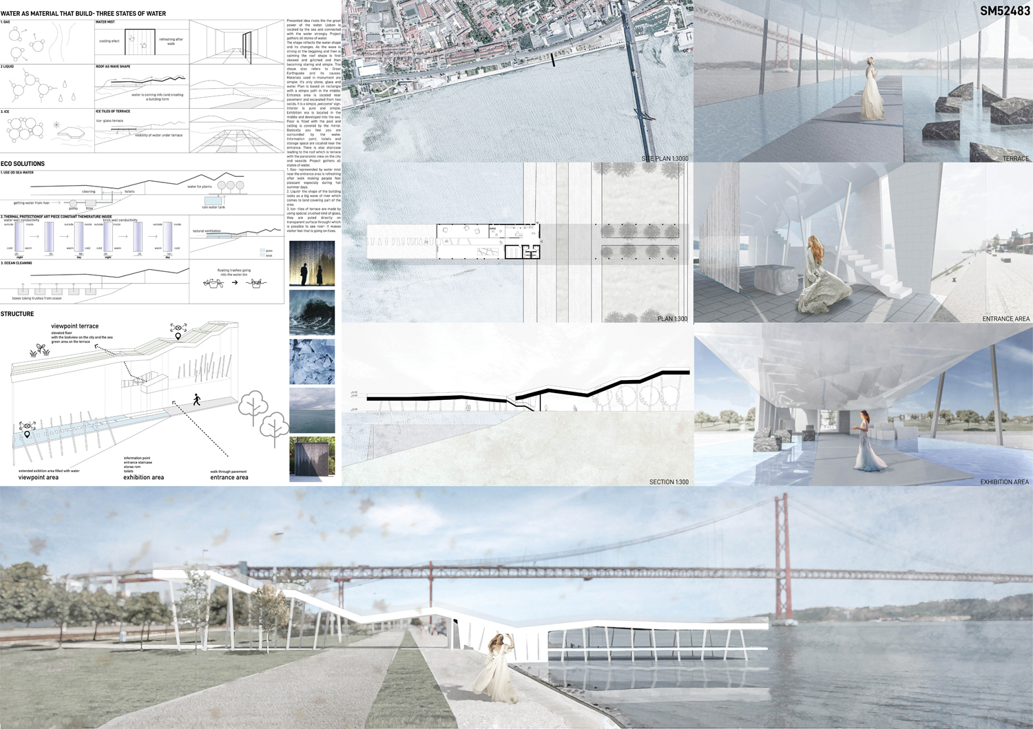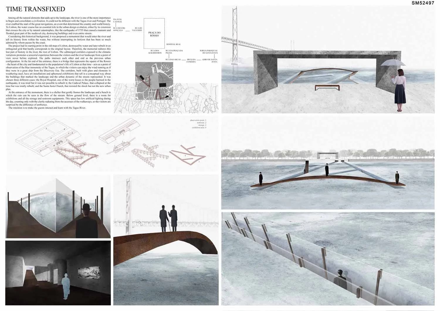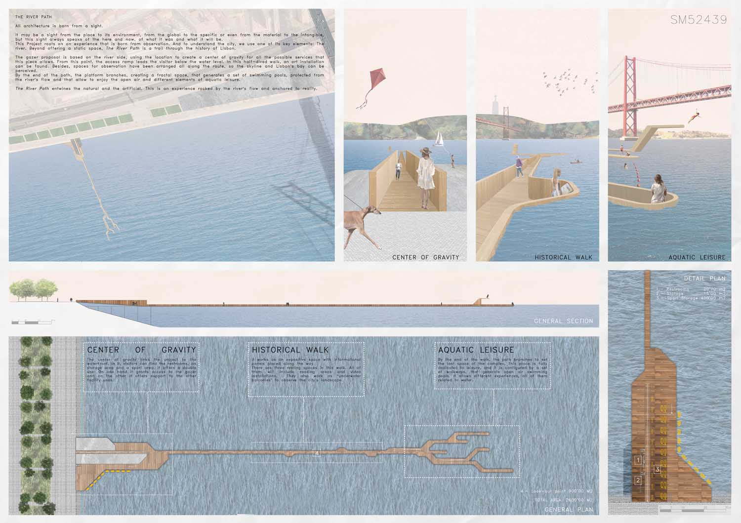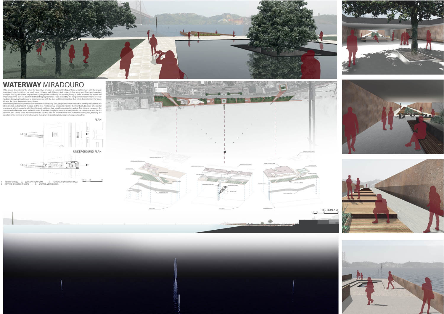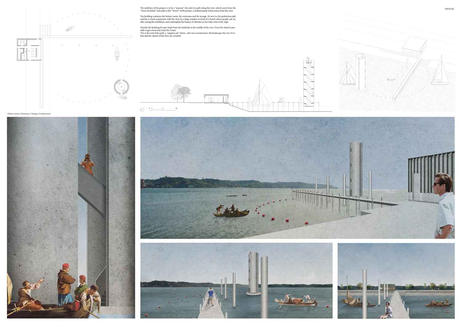 This proposal makes very clever use of the dramatic tidal changes on the Tagus river, creating an inhabitable and ever changing sculptural space. It is Illustrated idiosyncratically but extremely effectively with a beautifully collaged perspective and clear, cohesive diagrams.