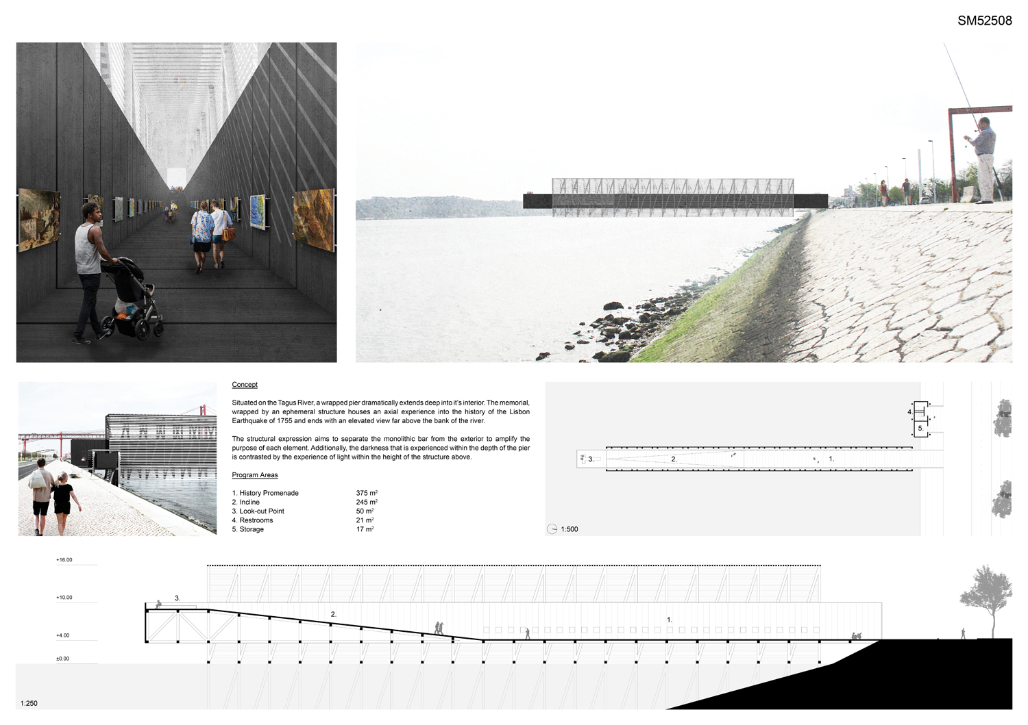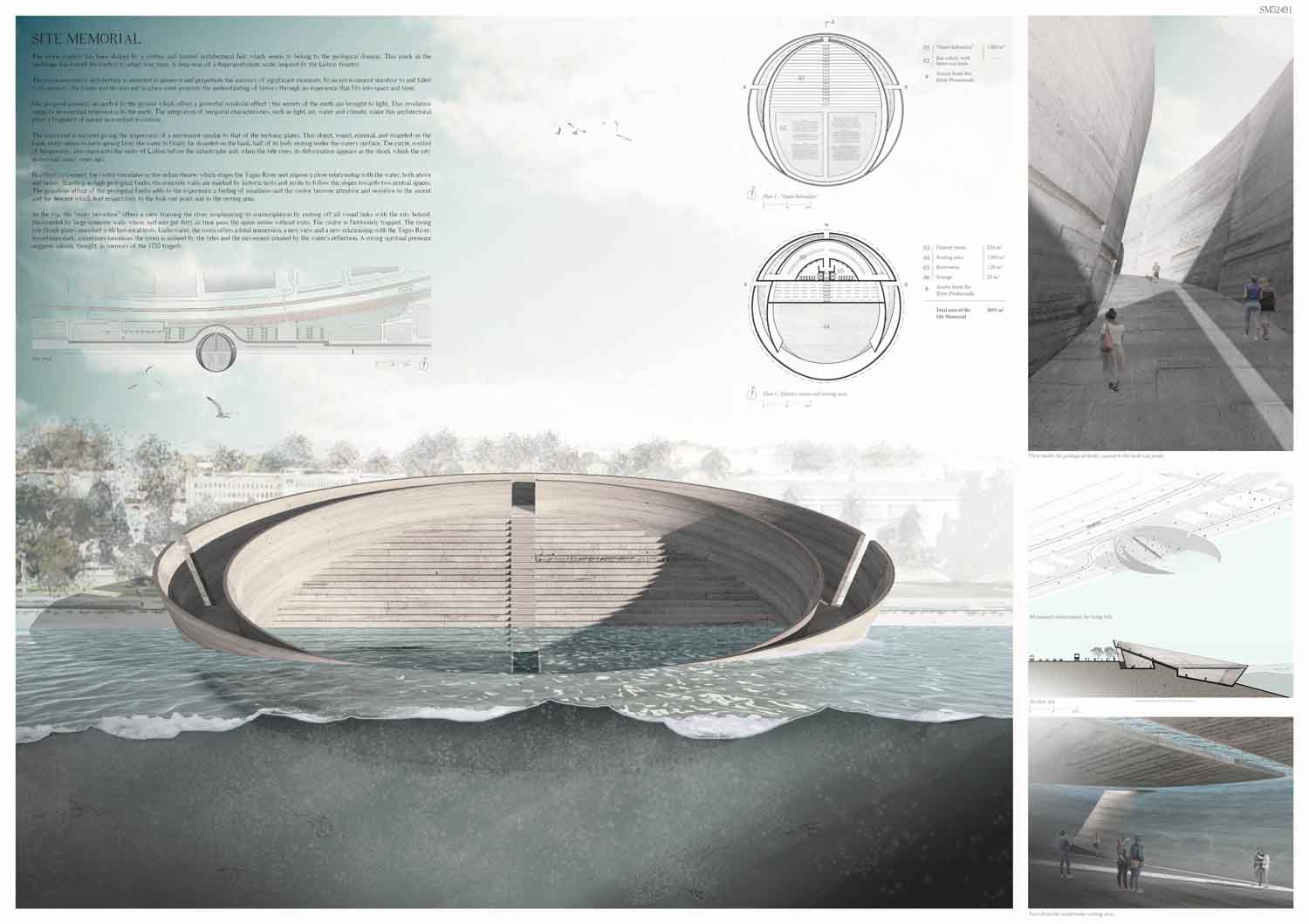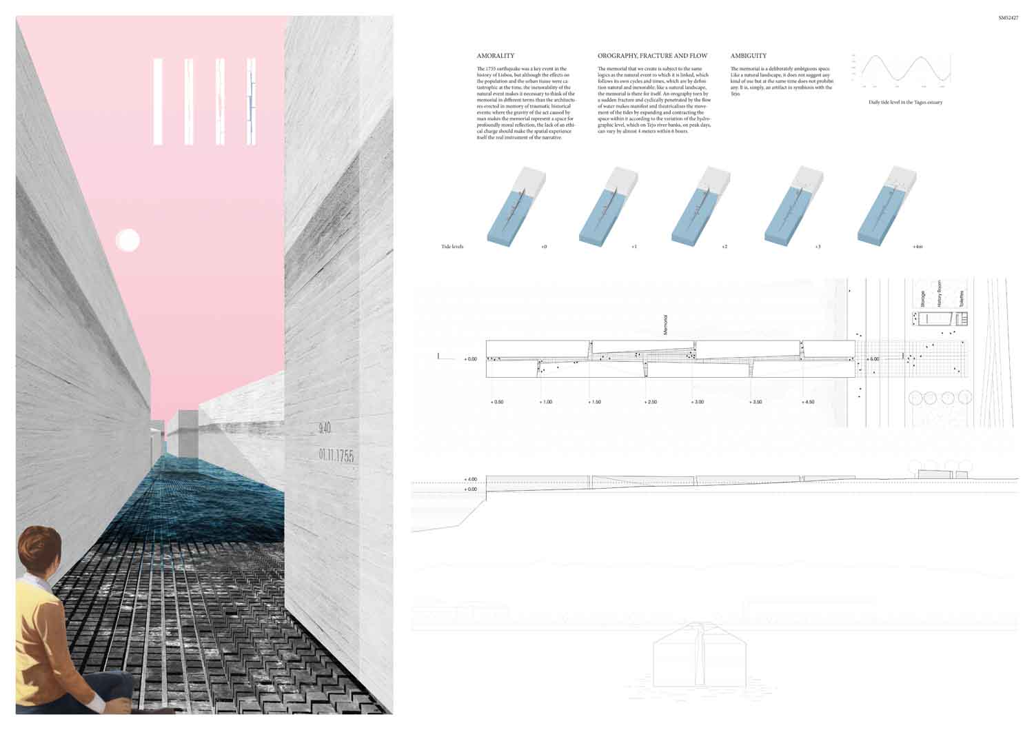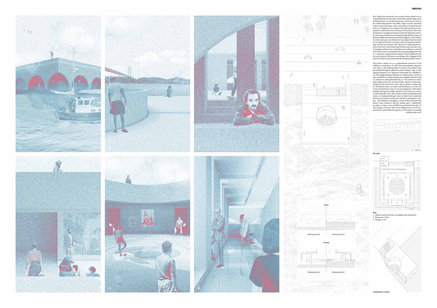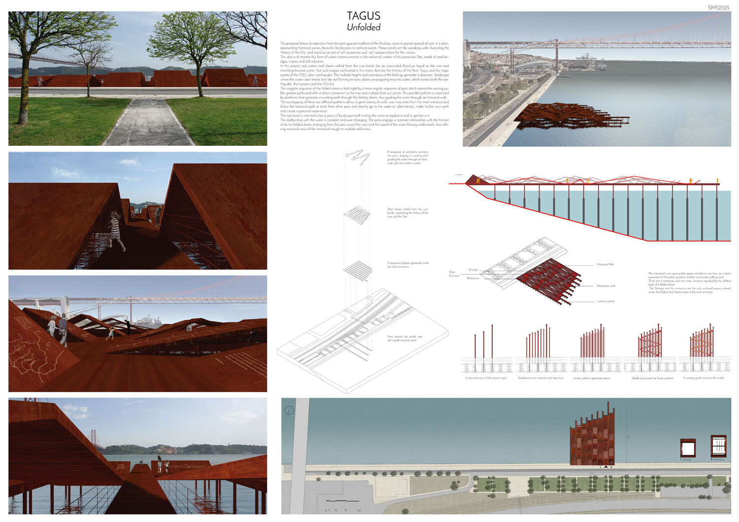This proposal makes very clever use of the dramatic tidal changes on the Tagus river, creating an inhabitable and ever changing sculptural space. It is Illustrated idiosyncratically but extremely effectively with a beautifully collaged perspective and clear, cohesive diagrams.