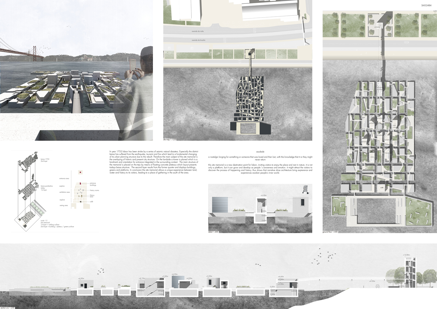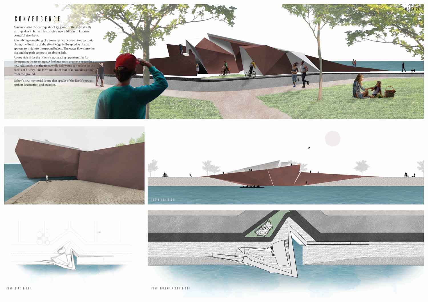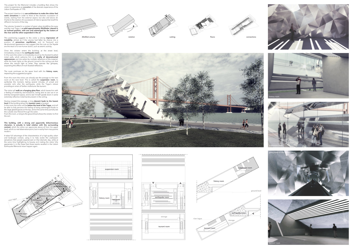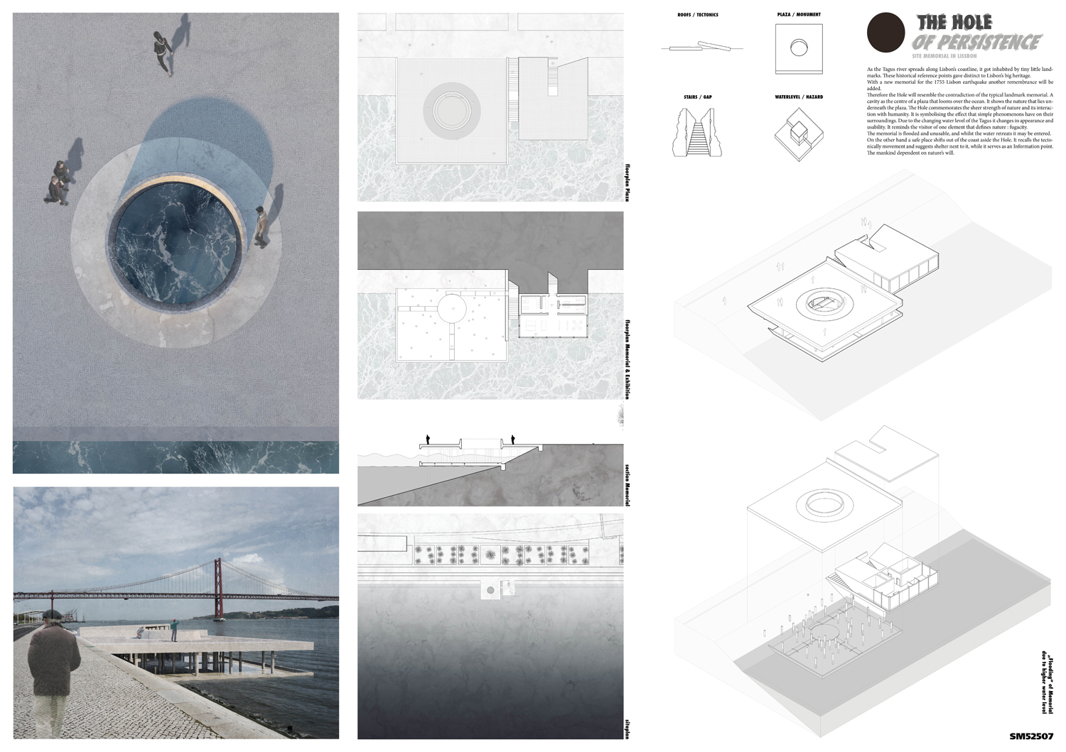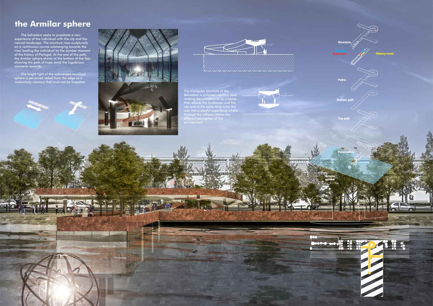 This proposal makes very clever use of the dramatic tidal changes on the Tagus river, creating an inhabitable and ever changing sculptural space. It is Illustrated idiosyncratically but extremely effectively with a beautifully collaged perspective and clear, cohesive diagrams.