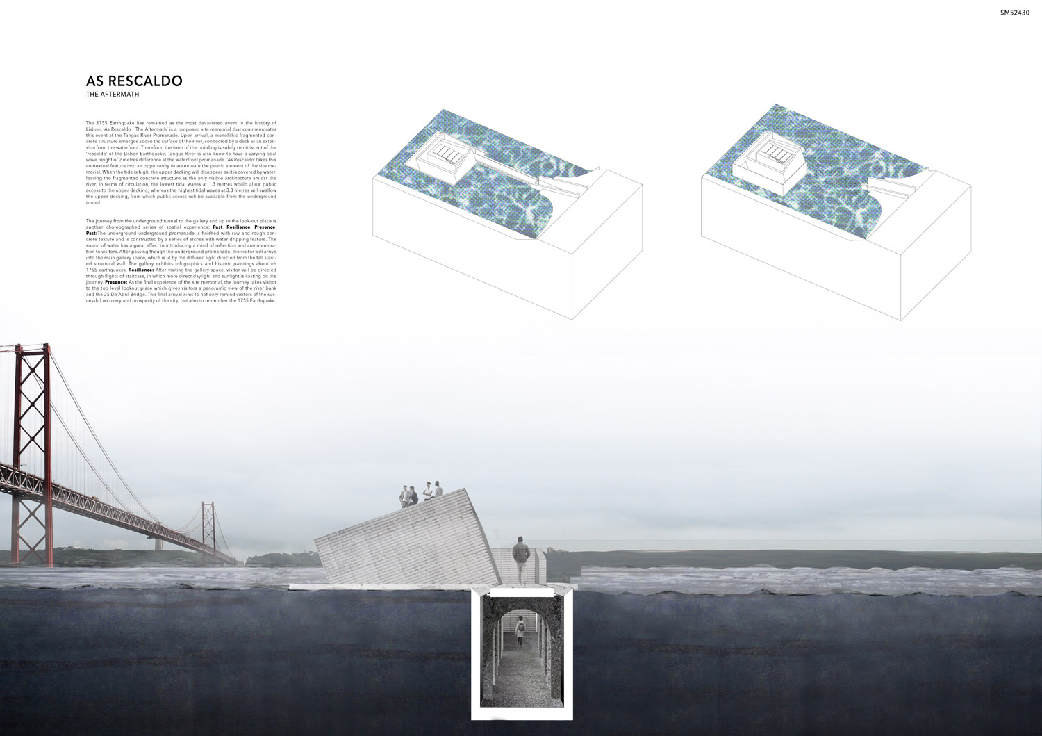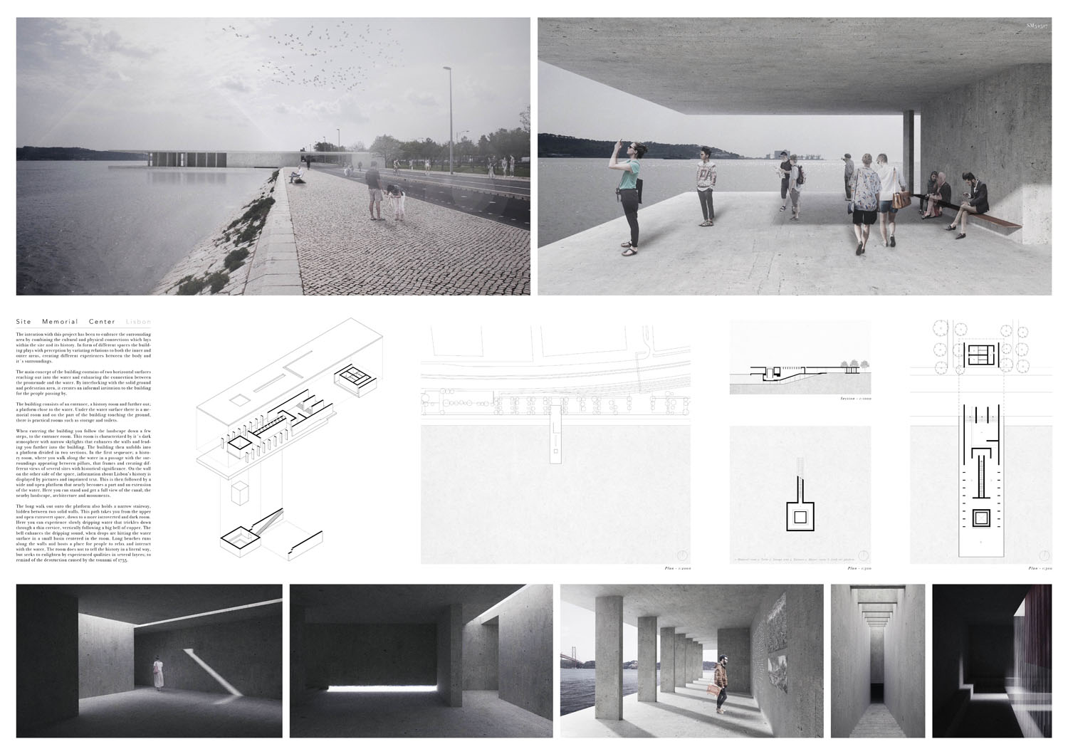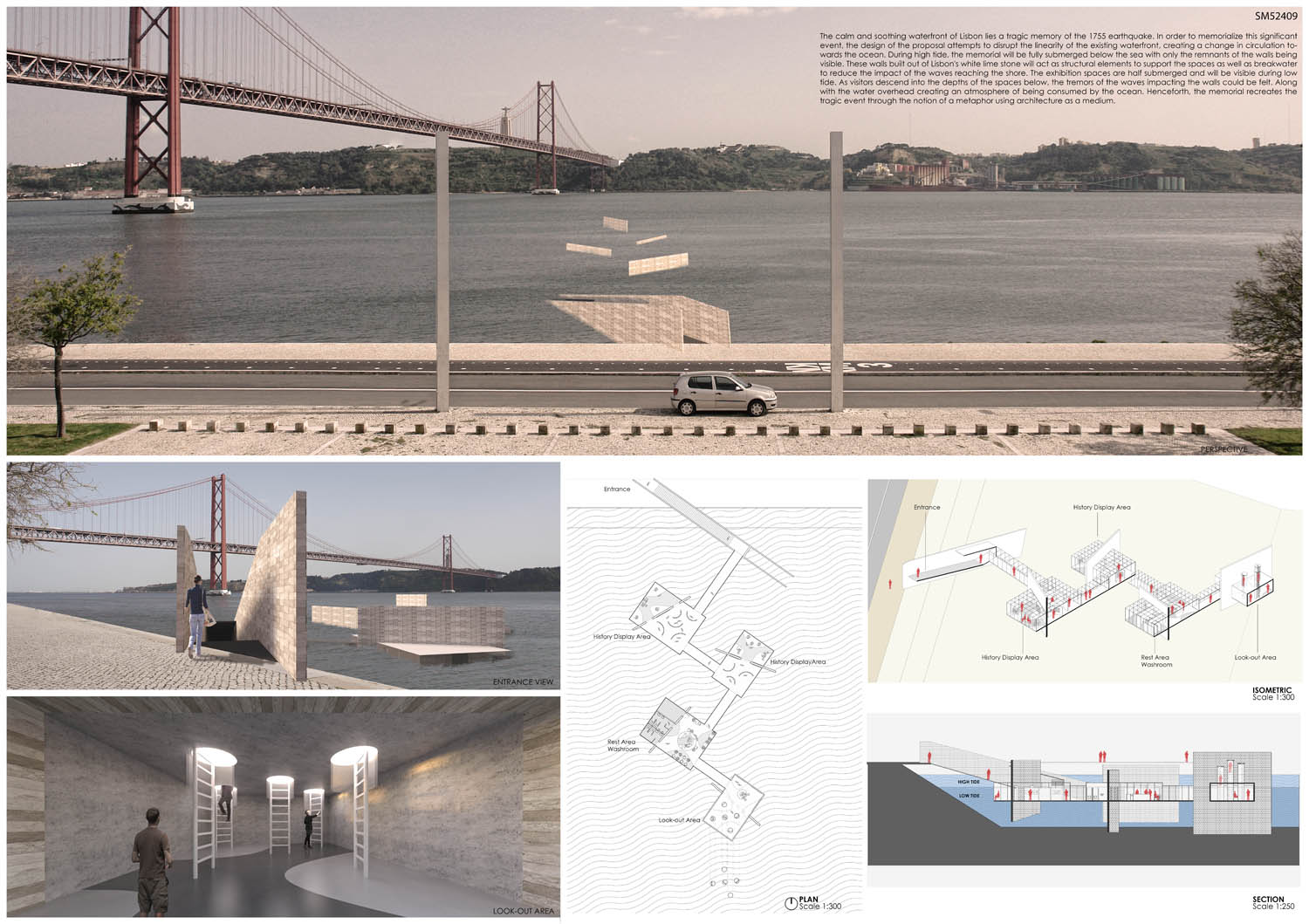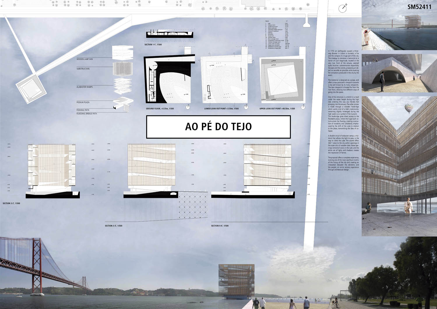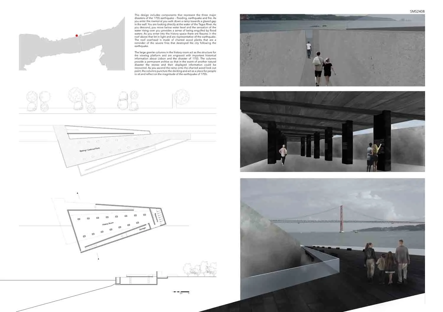 This proposal makes very clever use of the dramatic tidal changes on the Tagus river, creating an inhabitable and ever changing sculptural space. It is Illustrated idiosyncratically but extremely effectively with a beautifully collaged perspective and clear, cohesive diagrams.
