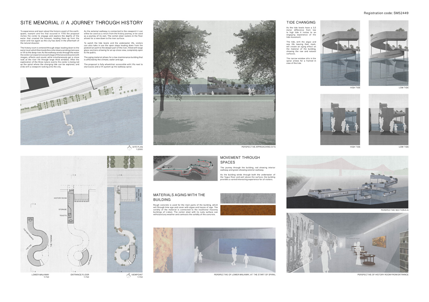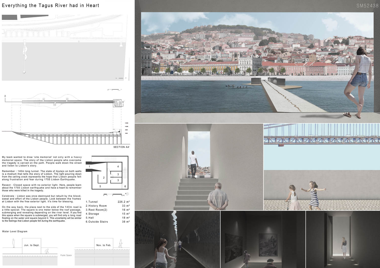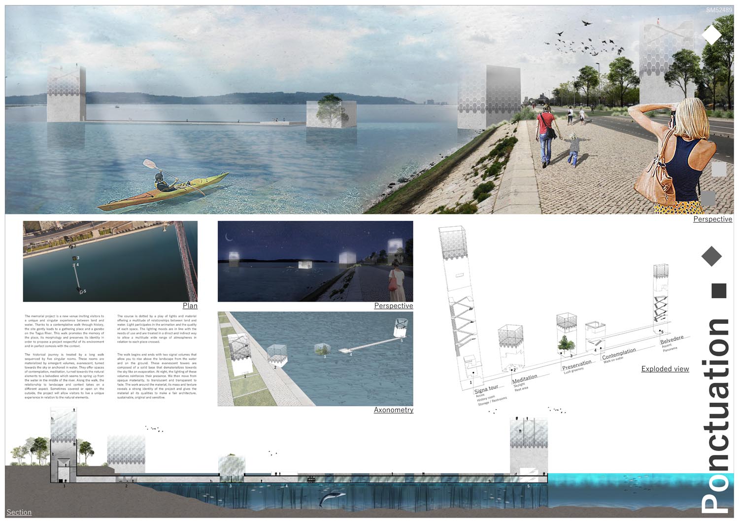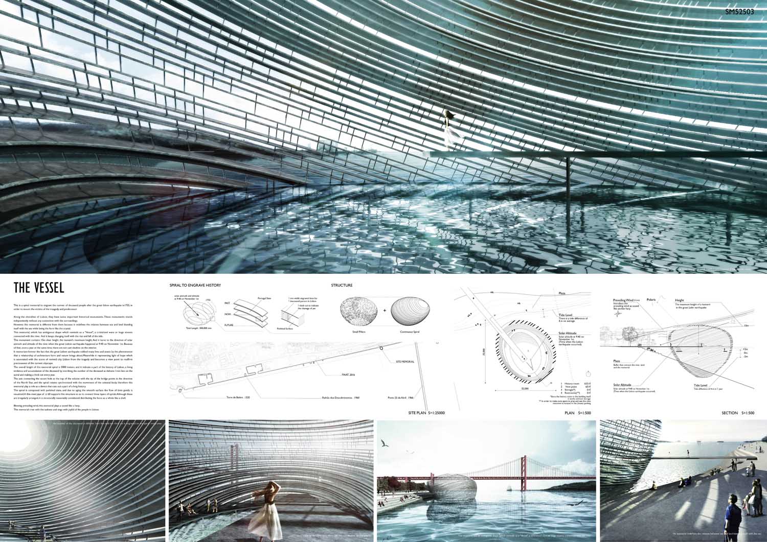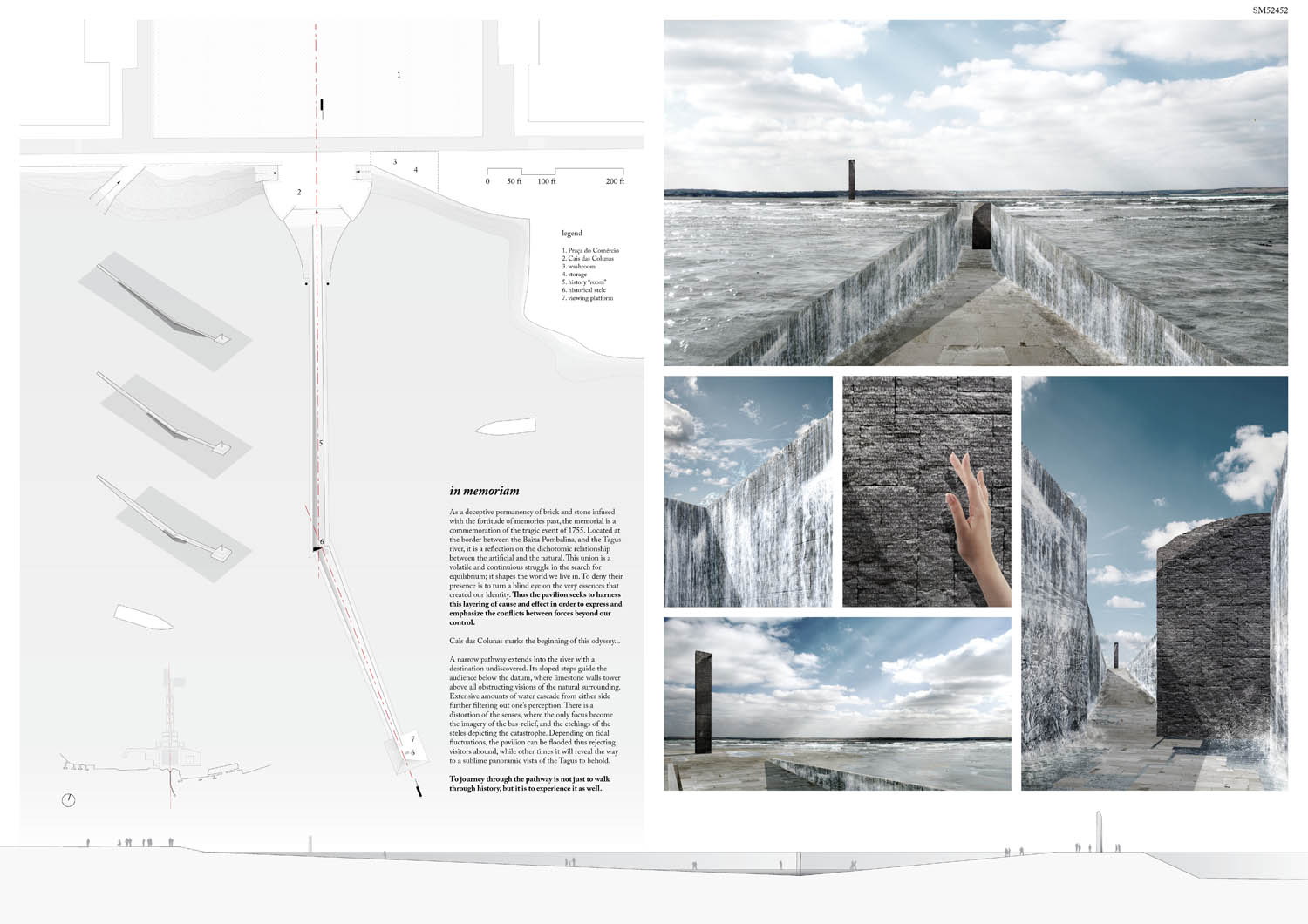 This proposal makes very clever use of the dramatic tidal changes on the Tagus river, creating an inhabitable and ever changing sculptural space. It is Illustrated idiosyncratically but extremely effectively with a beautifully collaged perspective and clear, cohesive diagrams.