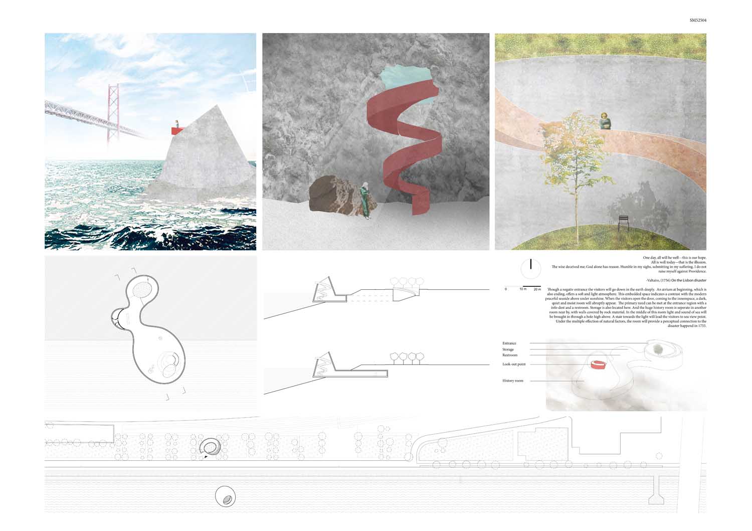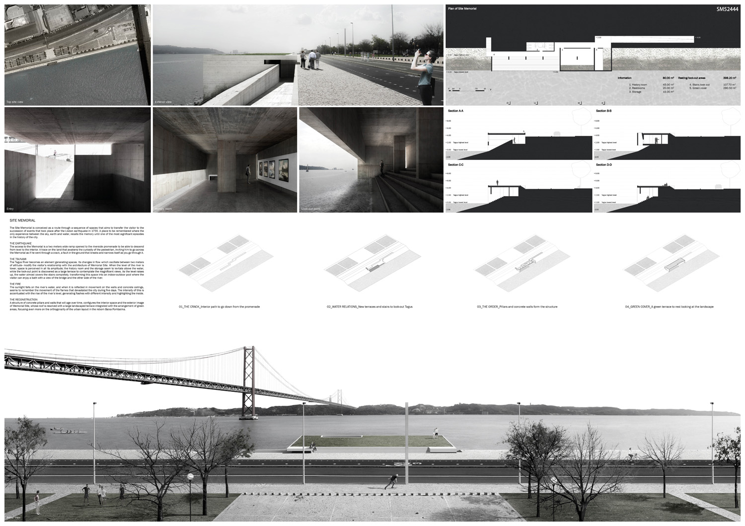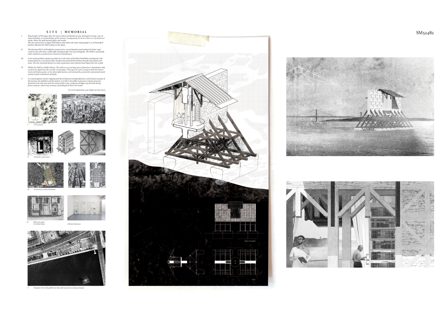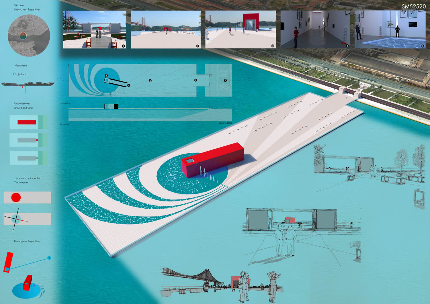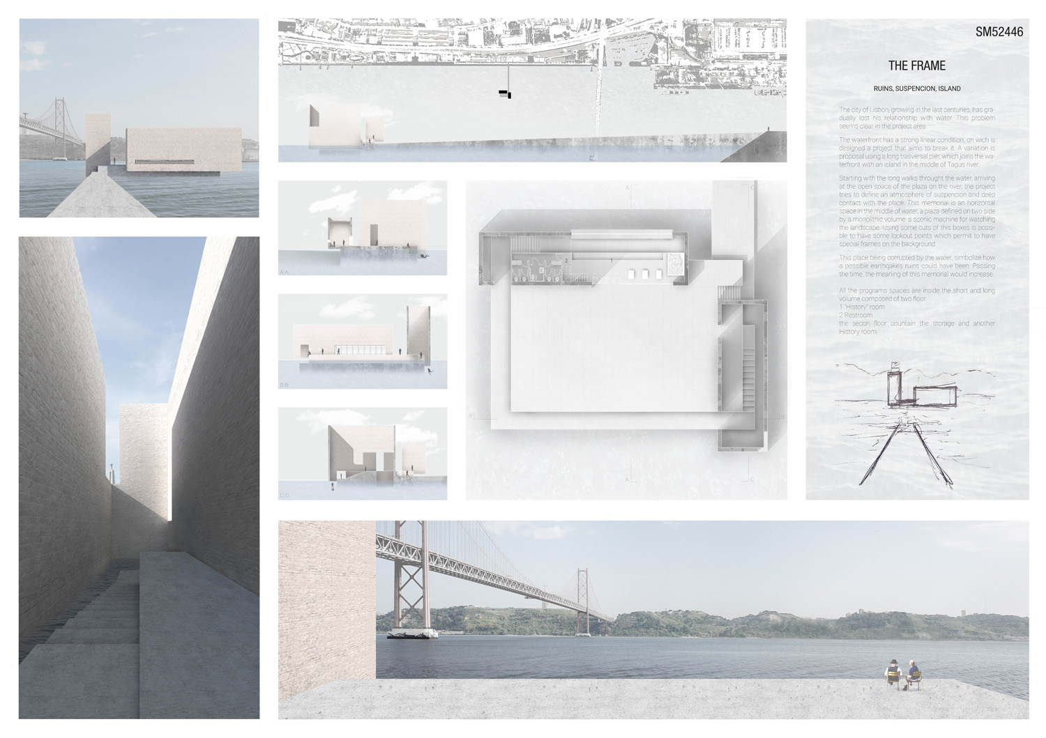This proposal makes very clever use of the dramatic tidal changes on the Tagus river, creating an inhabitable and ever changing sculptural space. It is Illustrated idiosyncratically but extremely effectively with a beautifully collaged perspective and clear, cohesive diagrams.