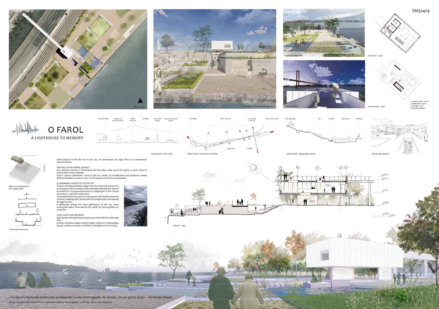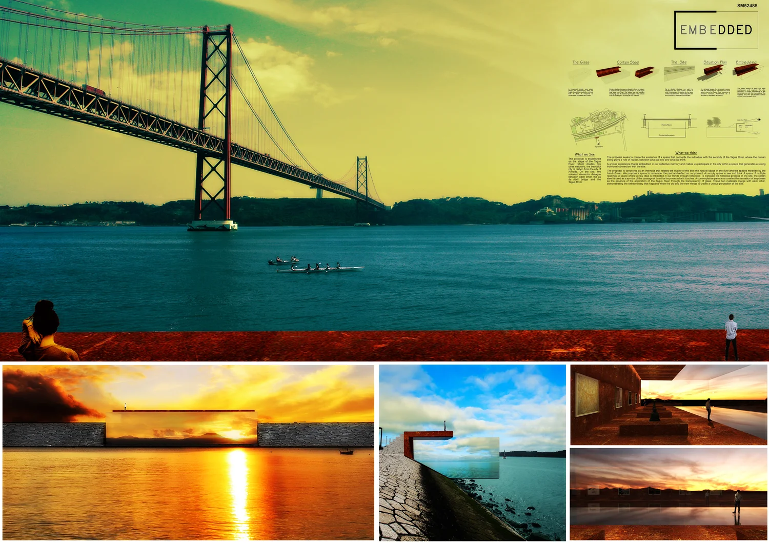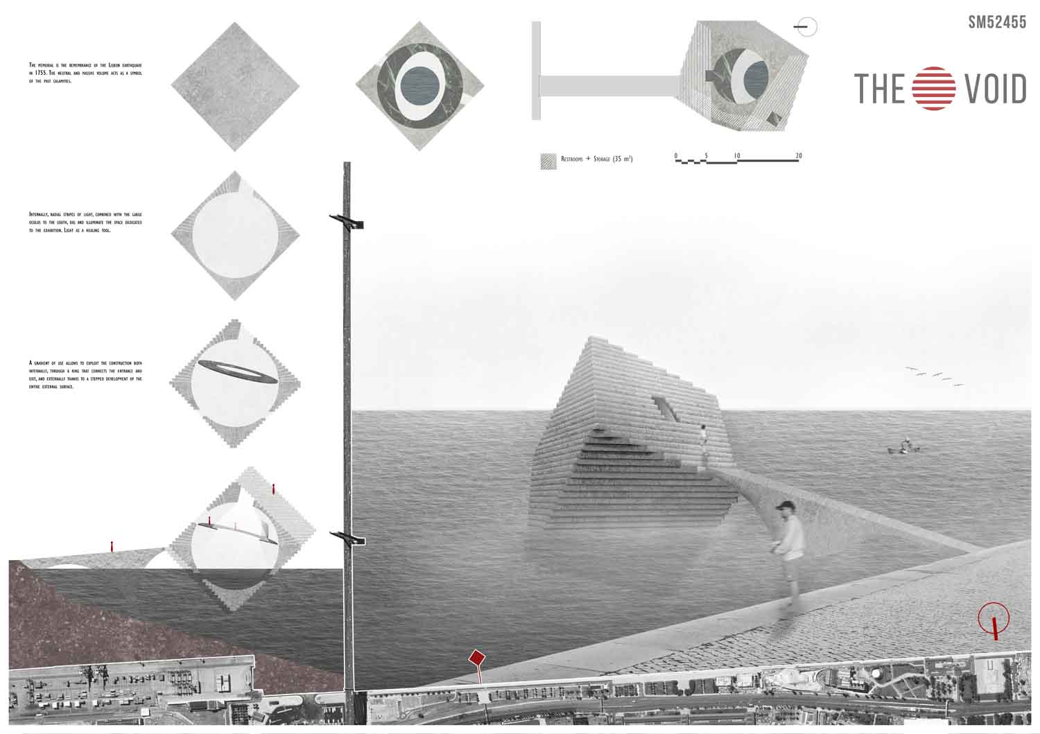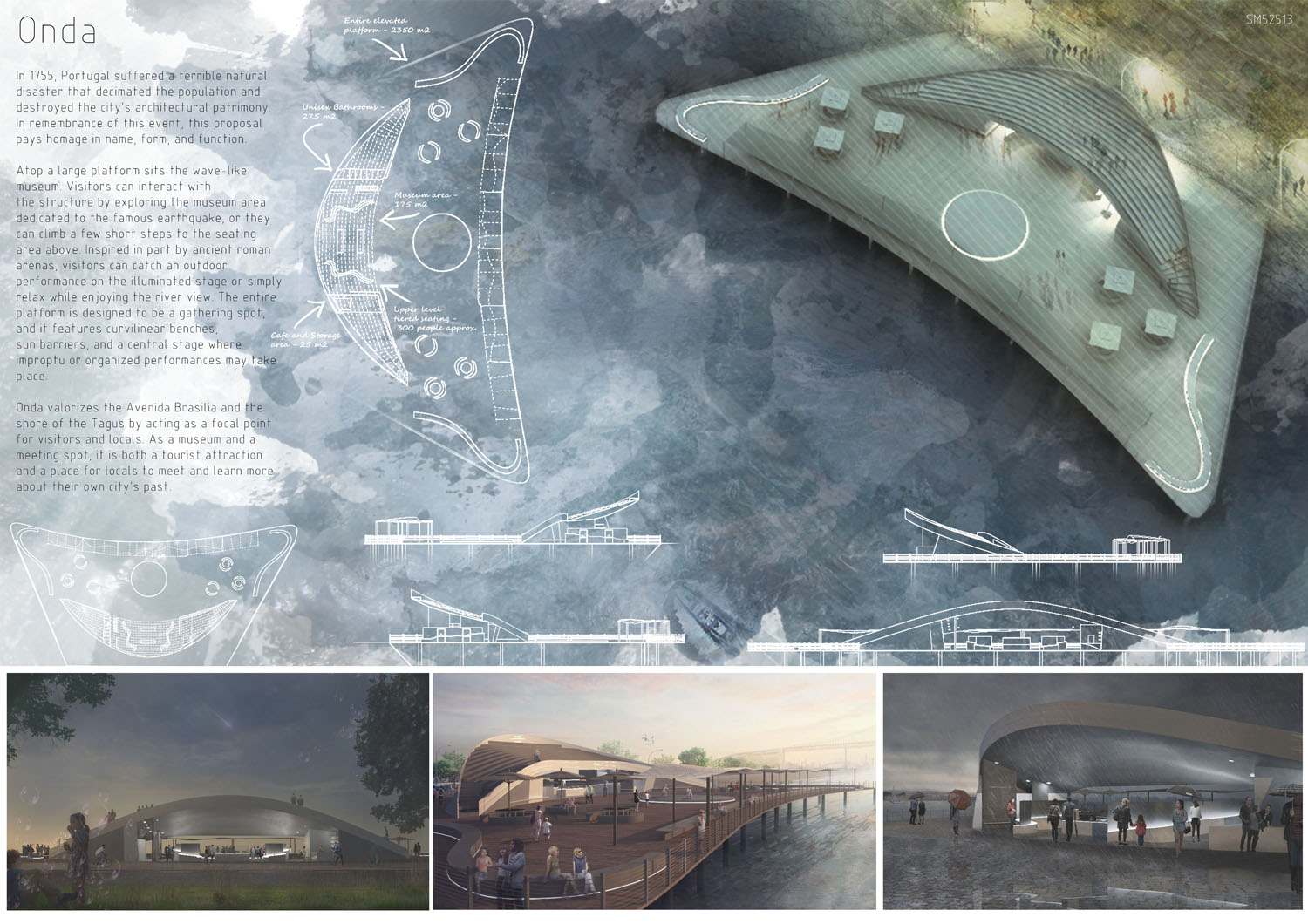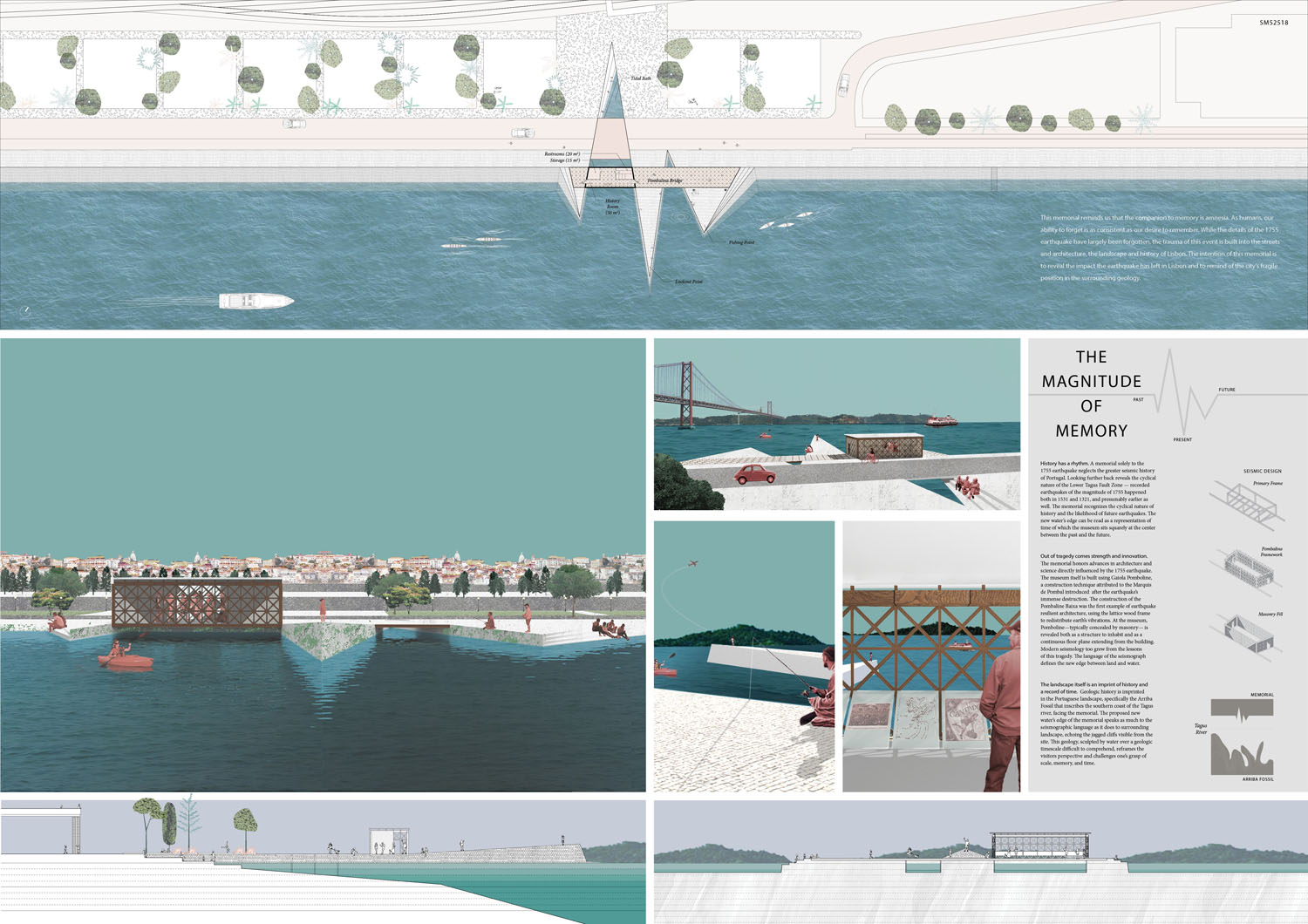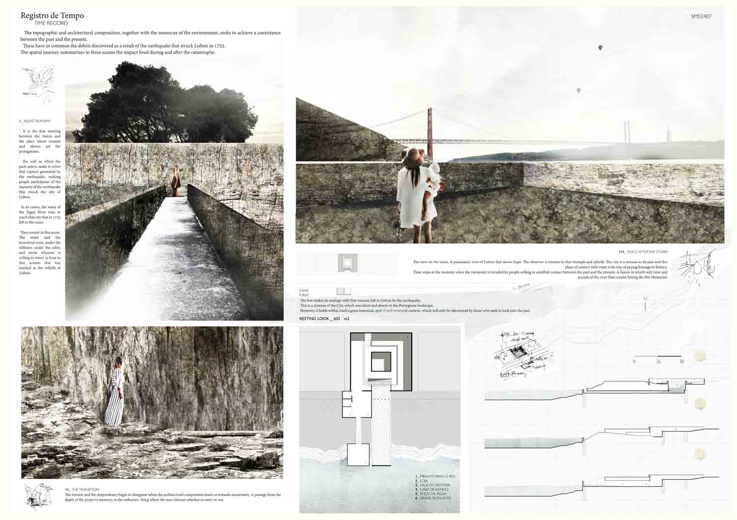 This proposal makes very clever use of the dramatic tidal changes on the Tagus river, creating an inhabitable and ever changing sculptural space. It is Illustrated idiosyncratically but extremely effectively with a beautifully collaged perspective and clear, cohesive diagrams.