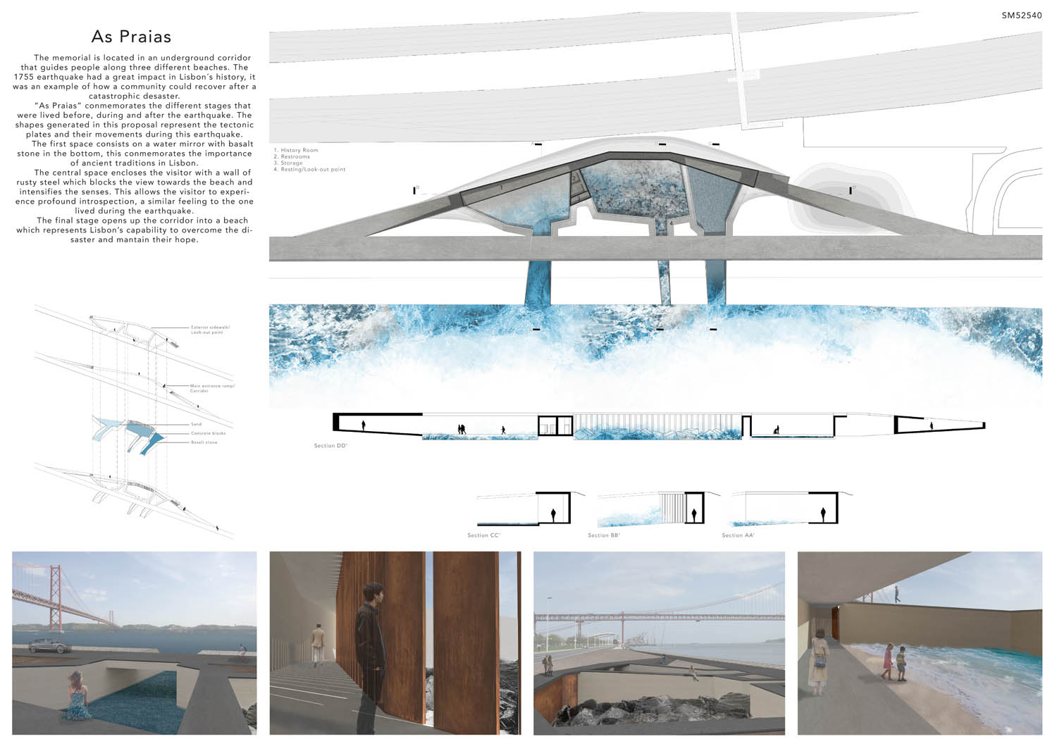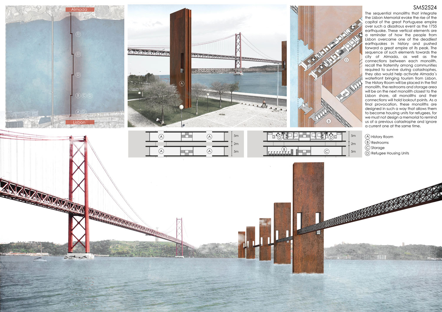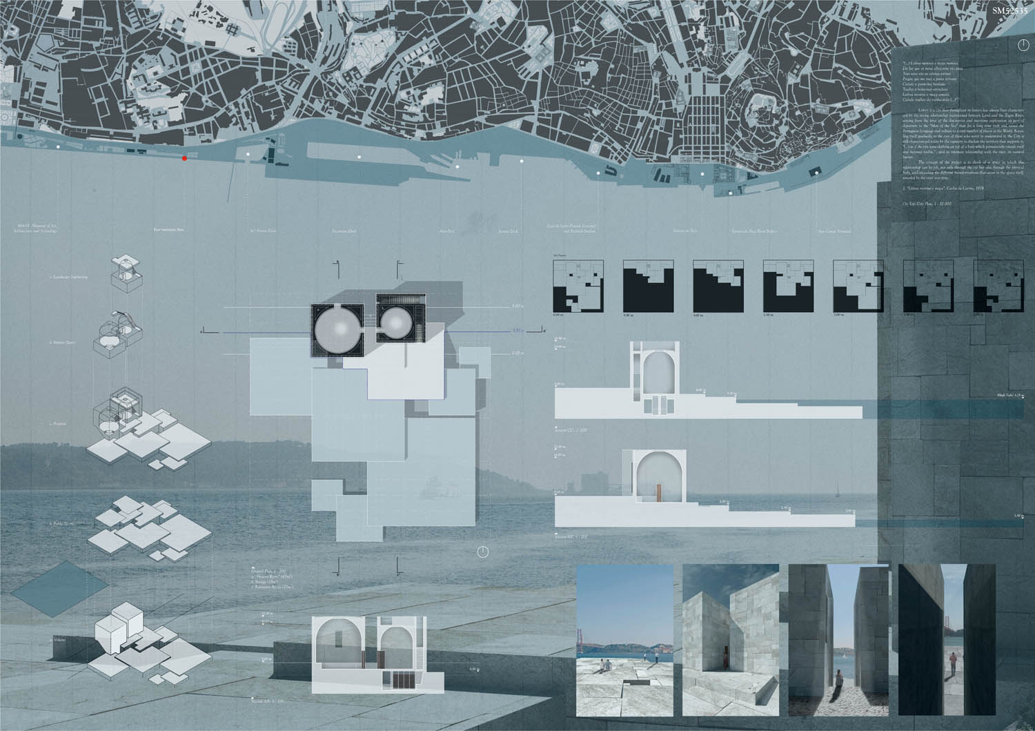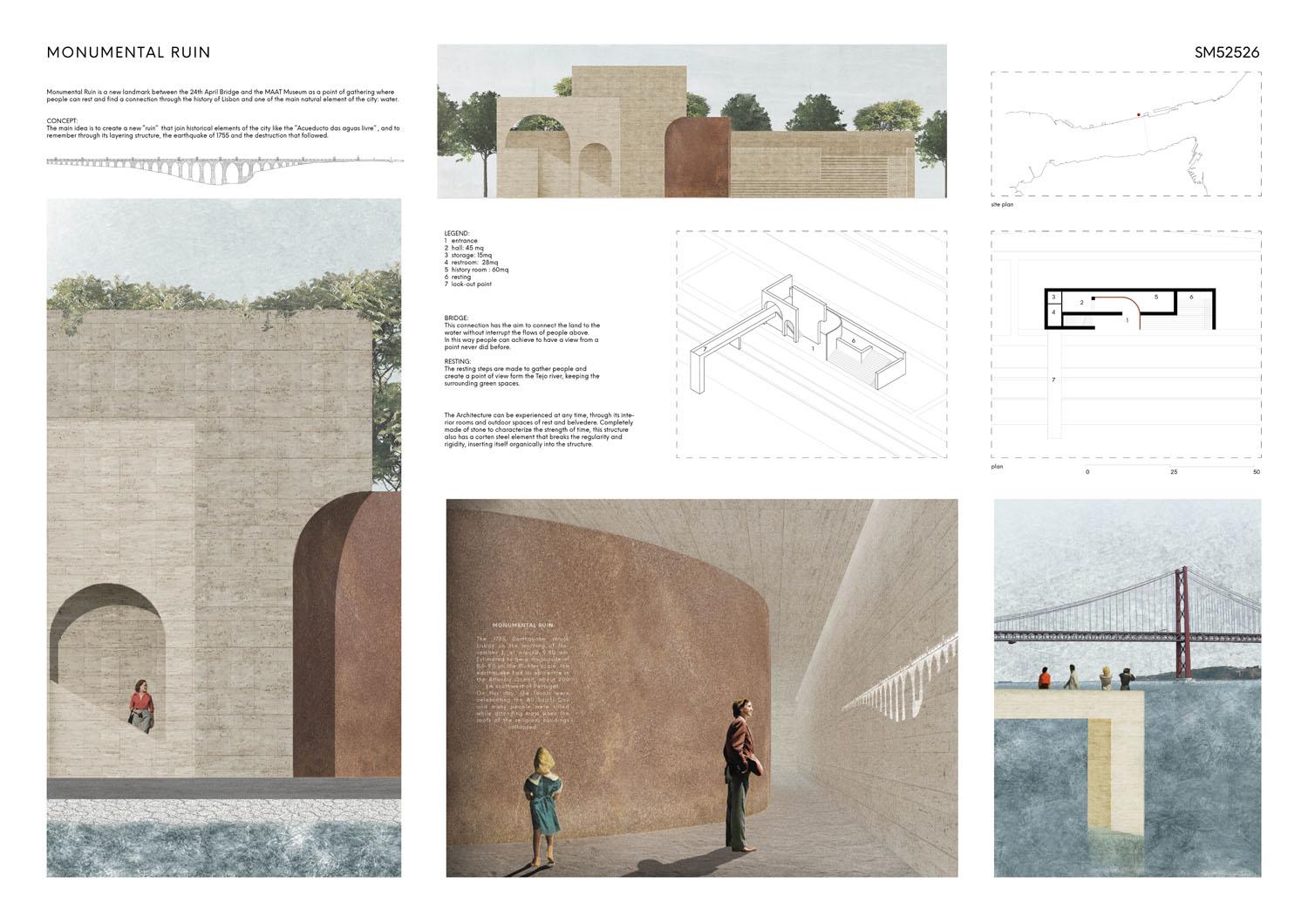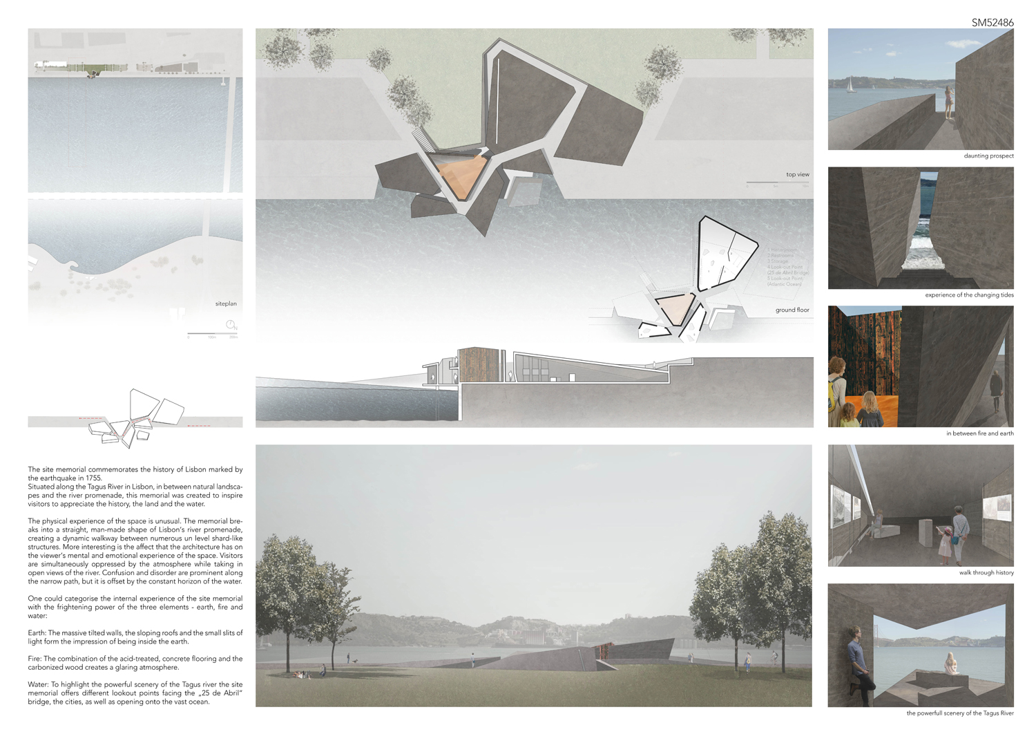 This proposal makes very clever use of the dramatic tidal changes on the Tagus river, creating an inhabitable and ever changing sculptural space. It is Illustrated idiosyncratically but extremely effectively with a beautifully collaged perspective and clear, cohesive diagrams.