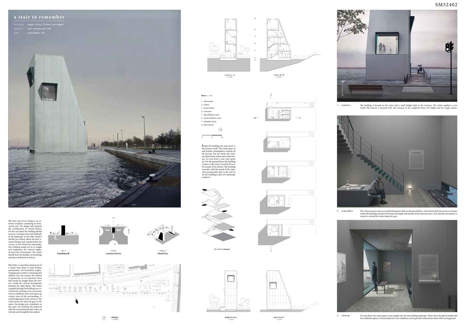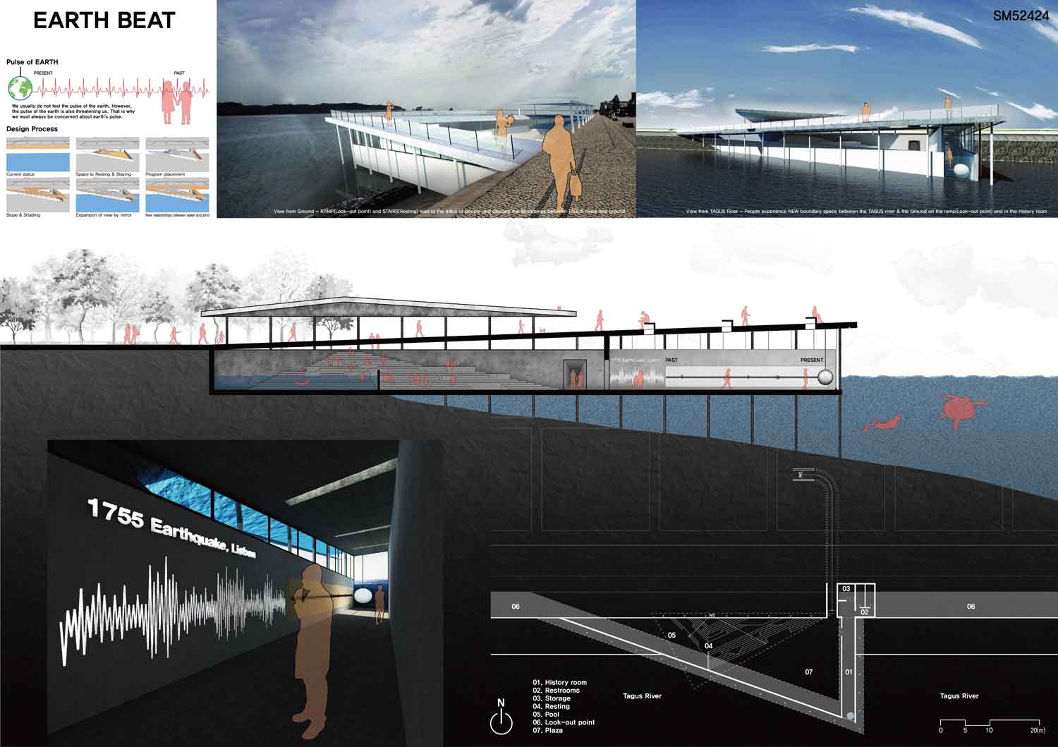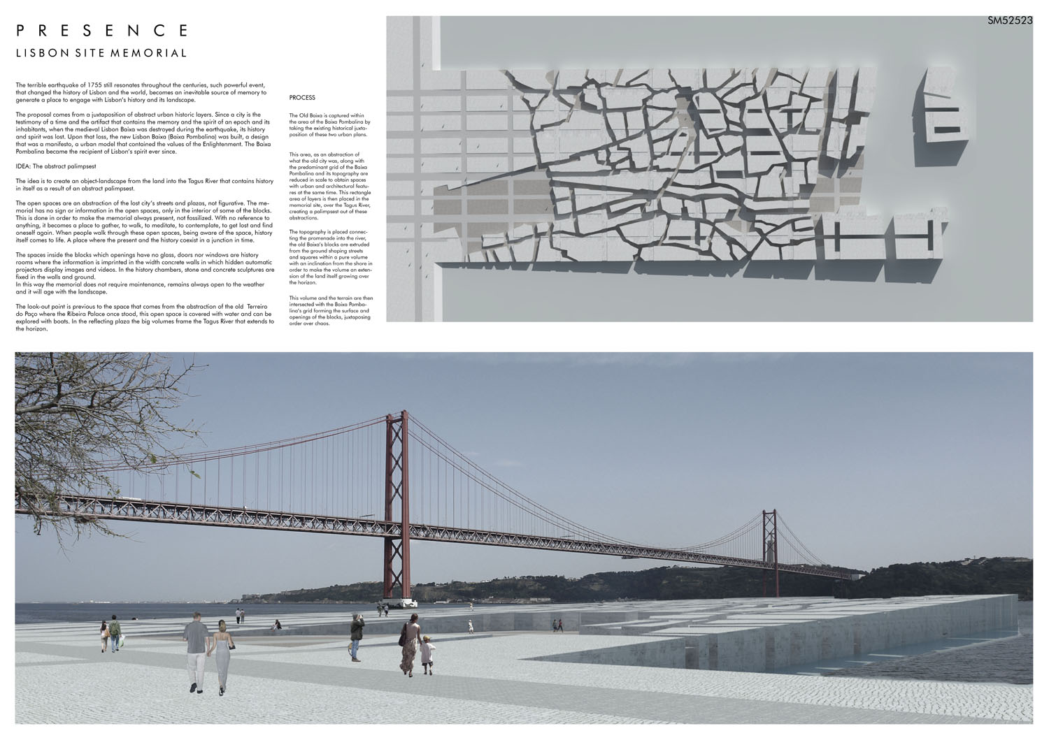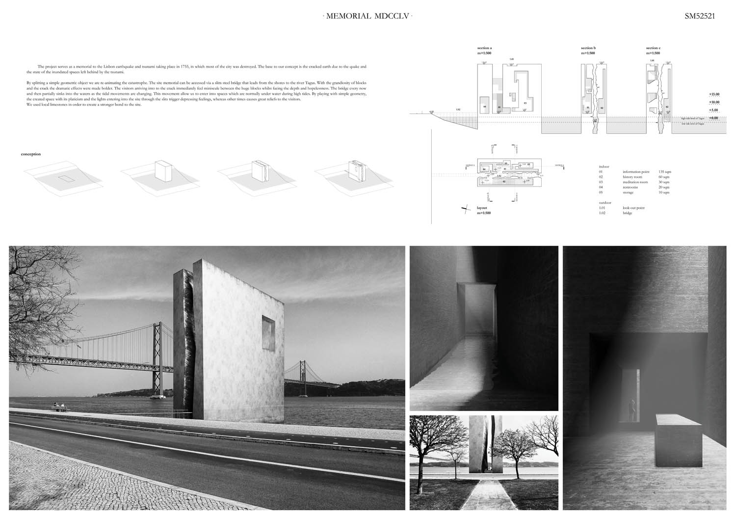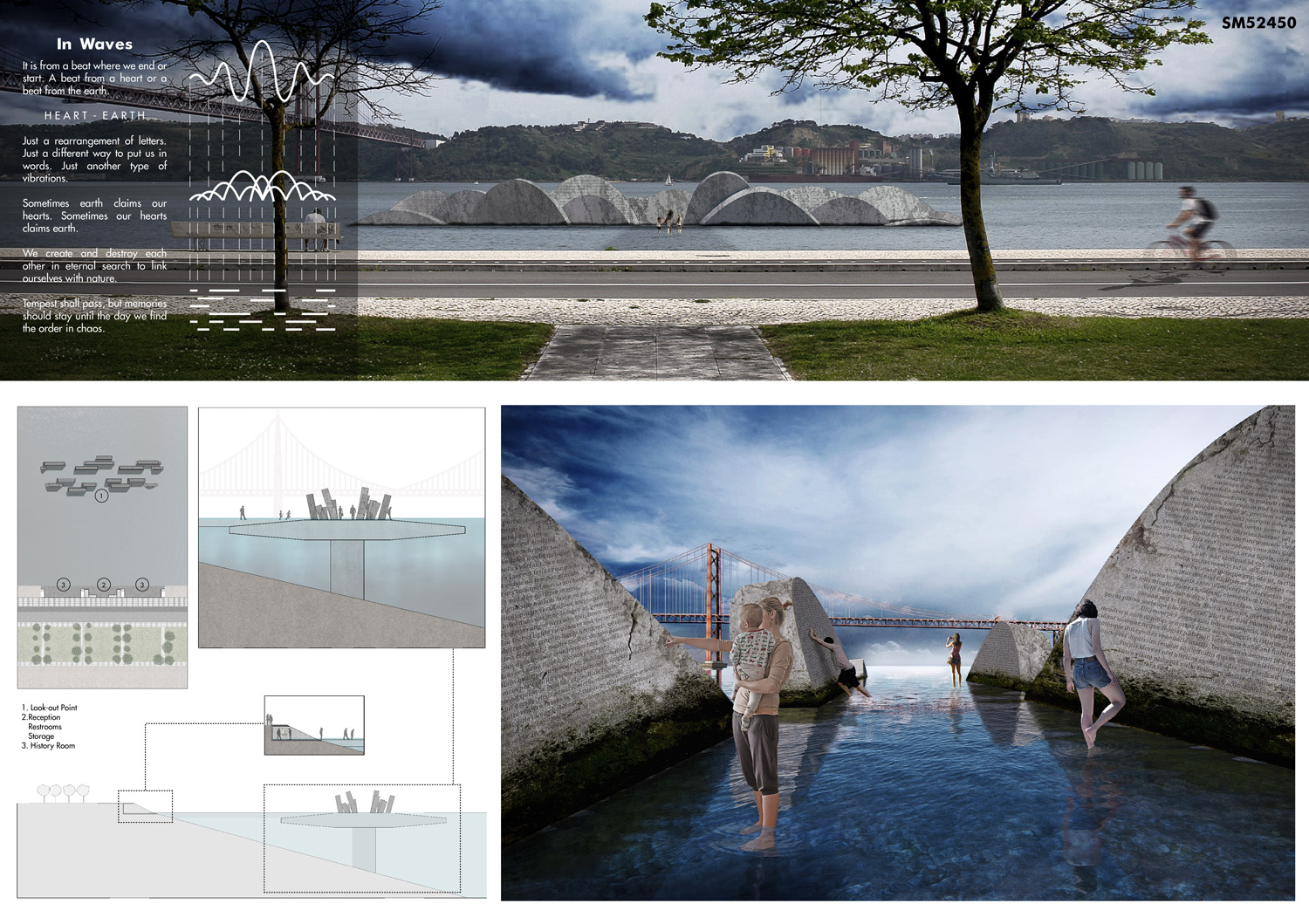 This proposal makes very clever use of the dramatic tidal changes on the Tagus river, creating an inhabitable and ever changing sculptural space. It is Illustrated idiosyncratically but extremely effectively with a beautifully collaged perspective and clear, cohesive diagrams.