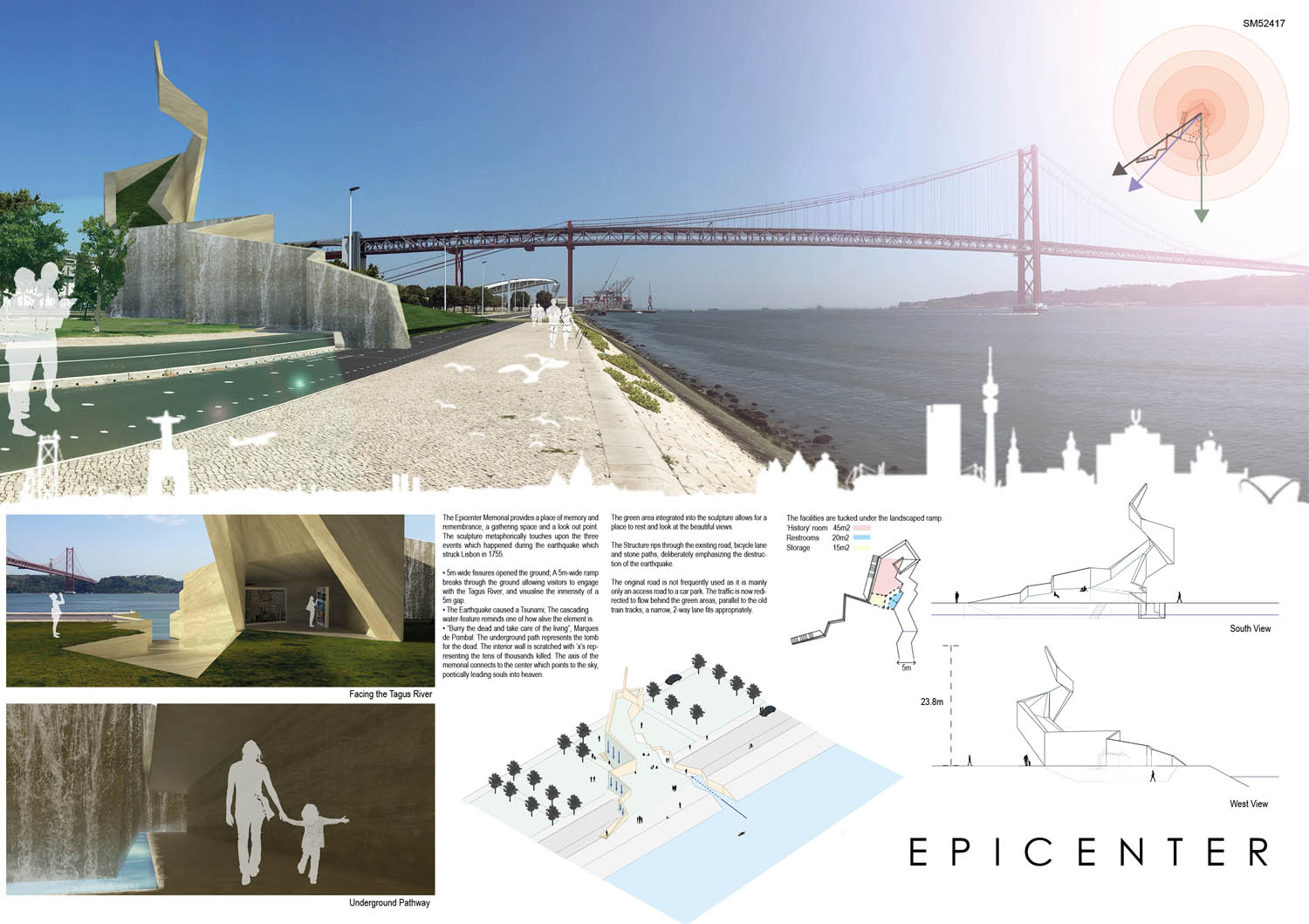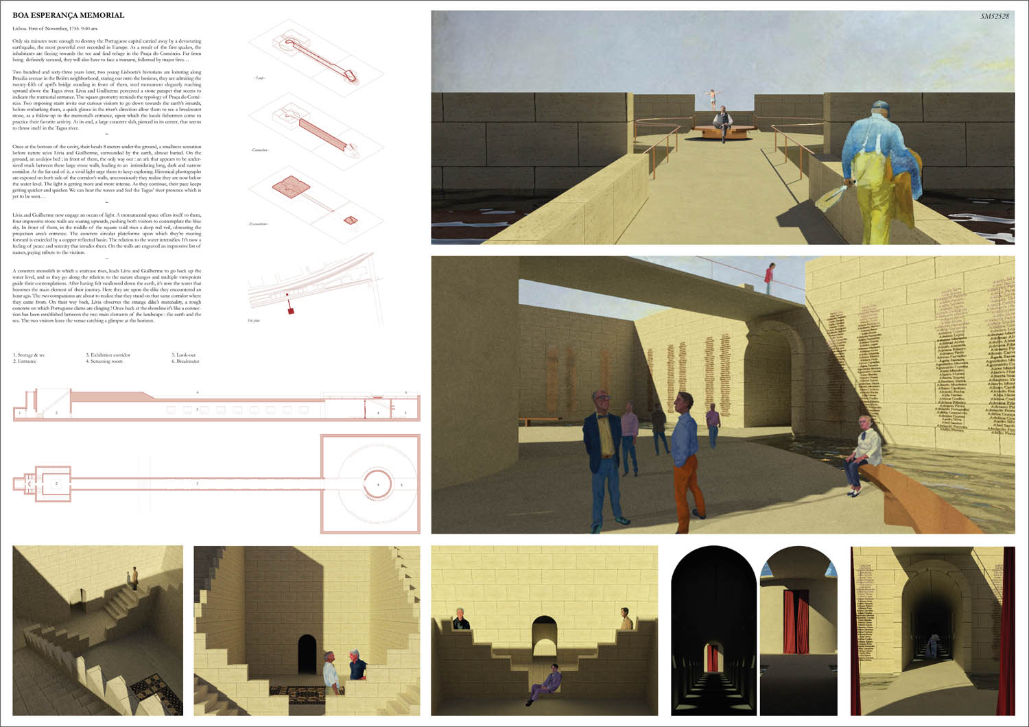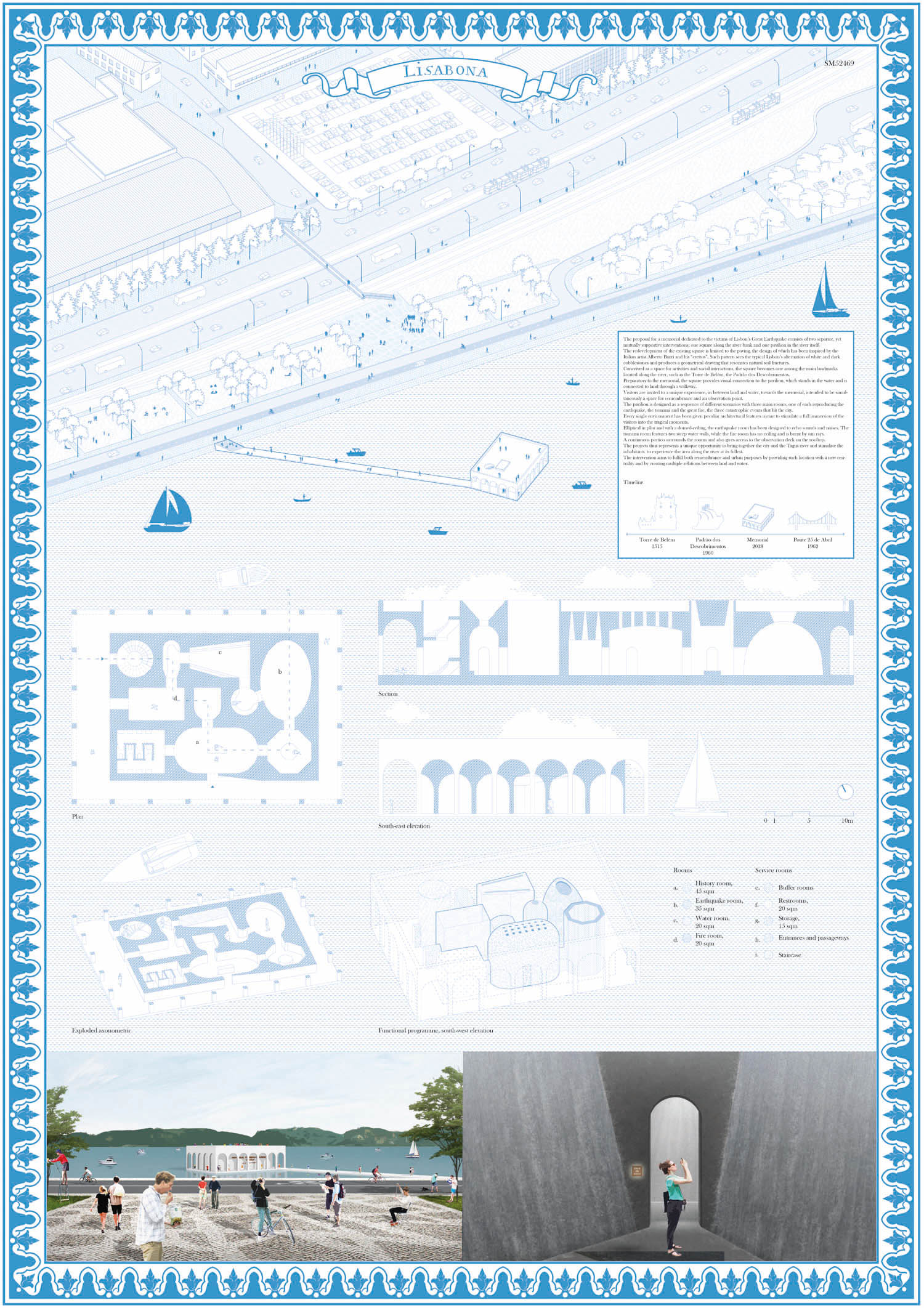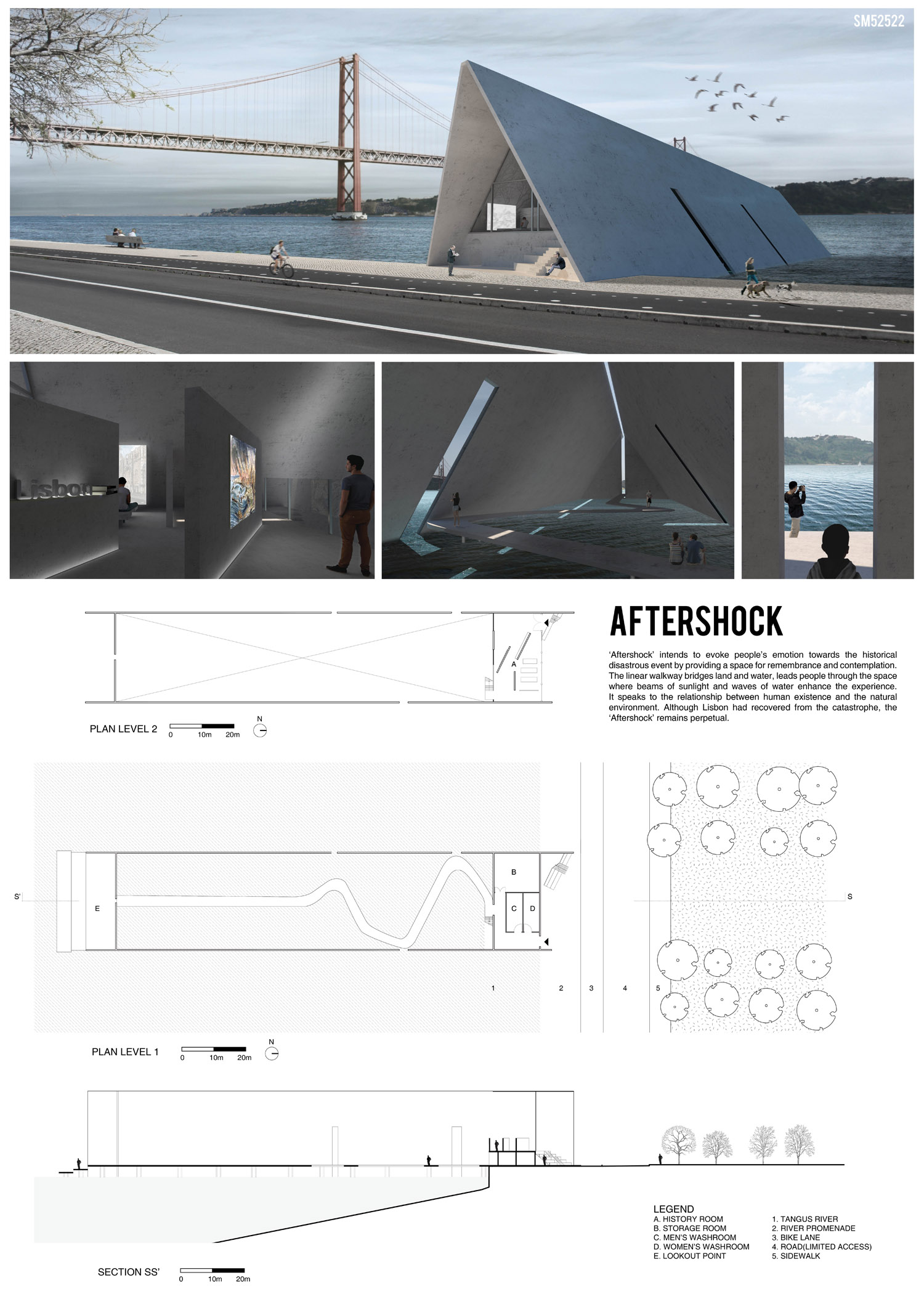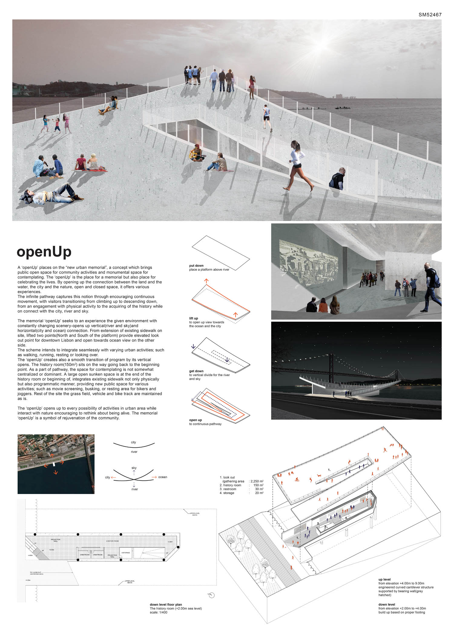 This proposal makes very clever use of the dramatic tidal changes on the Tagus river, creating an inhabitable and ever changing sculptural space. It is Illustrated idiosyncratically but extremely effectively with a beautifully collaged perspective and clear, cohesive diagrams.
