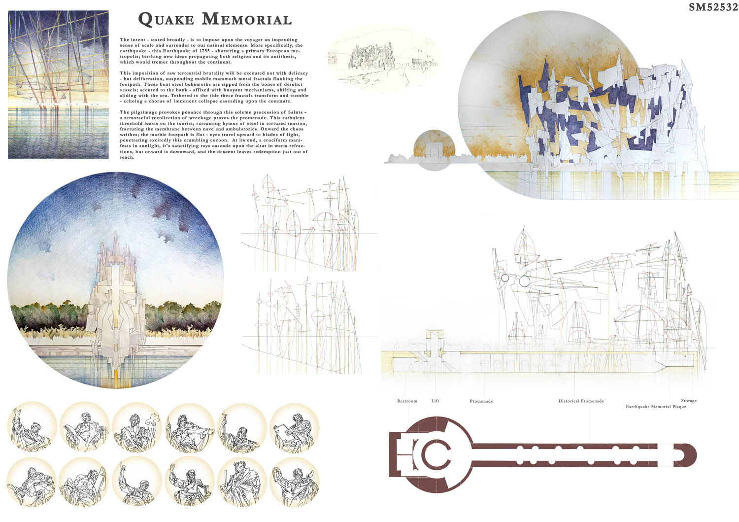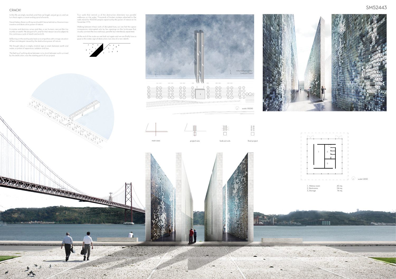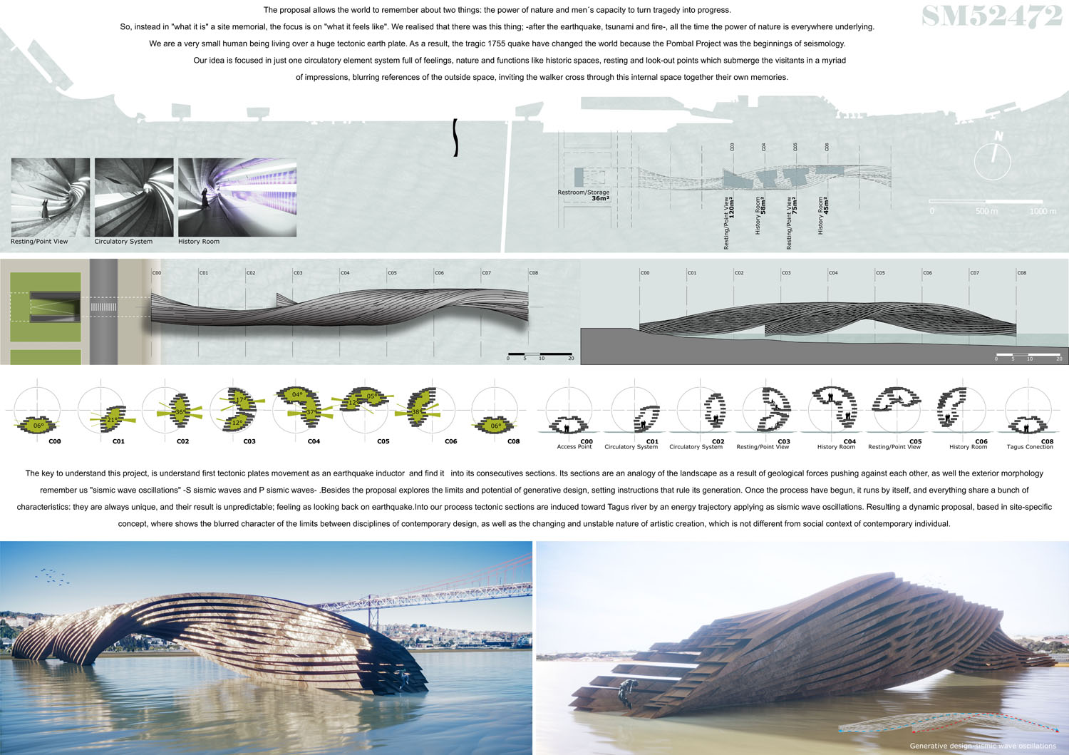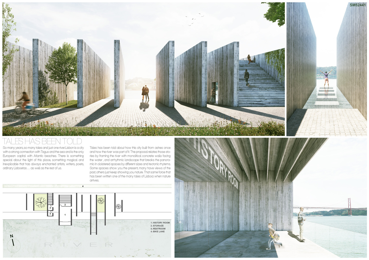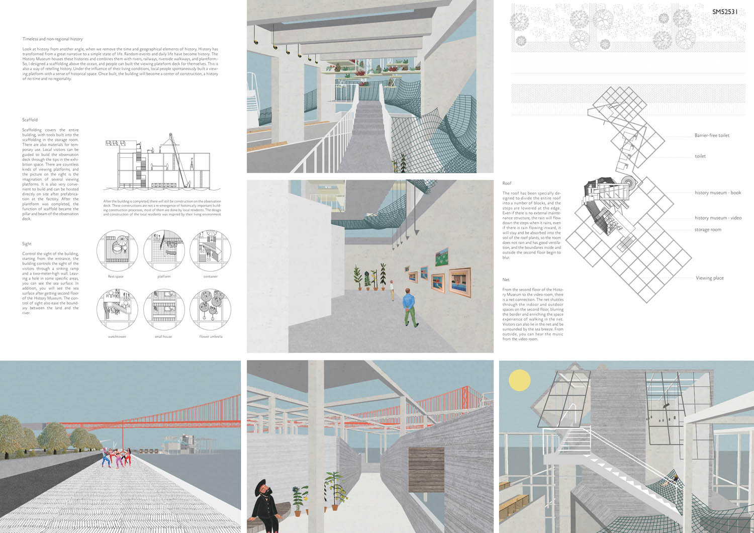 This proposal makes very clever use of the dramatic tidal changes on the Tagus river, creating an inhabitable and ever changing sculptural space. It is Illustrated idiosyncratically but extremely effectively with a beautifully collaged perspective and clear, cohesive diagrams.