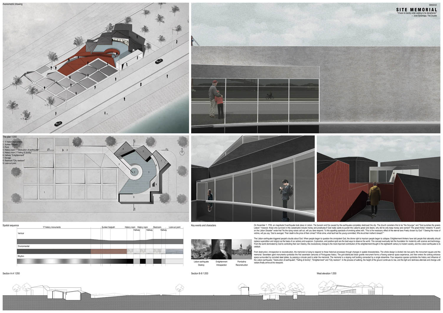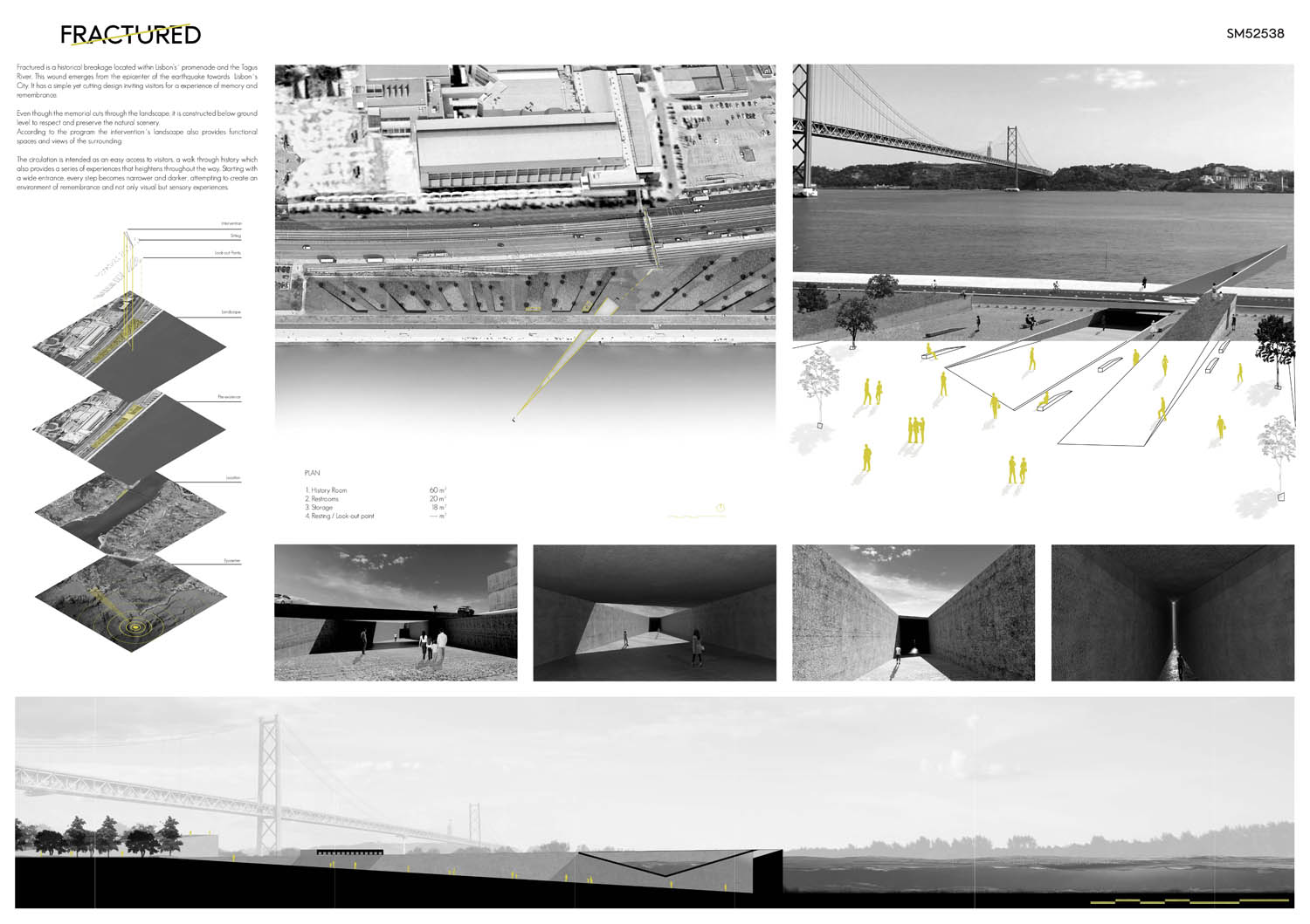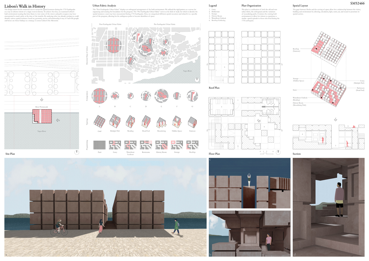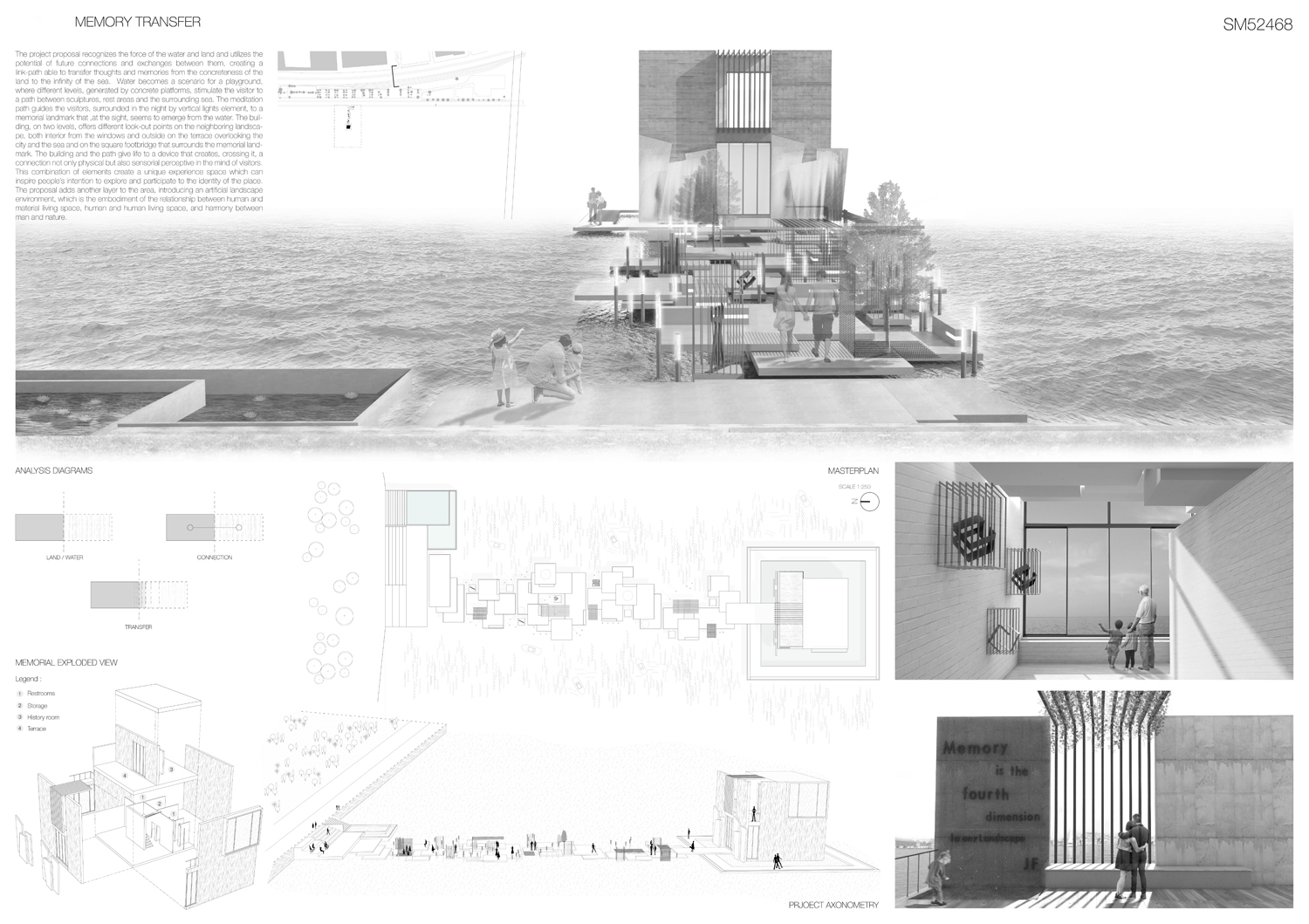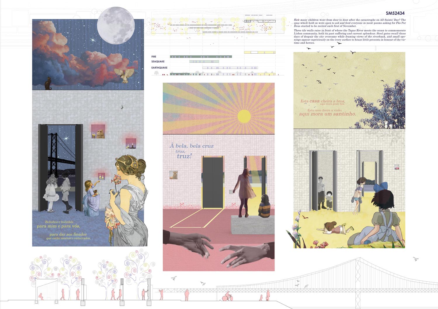 This proposal makes very clever use of the dramatic tidal changes on the Tagus river, creating an inhabitable and ever changing sculptural space. It is Illustrated idiosyncratically but extremely effectively with a beautifully collaged perspective and clear, cohesive diagrams.