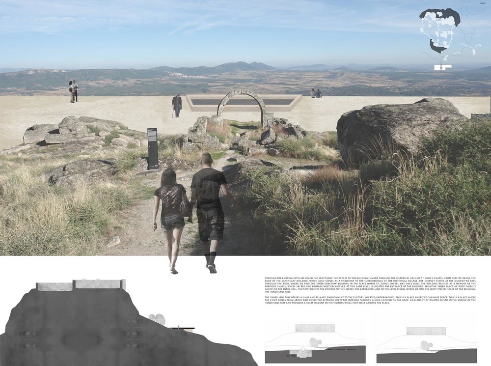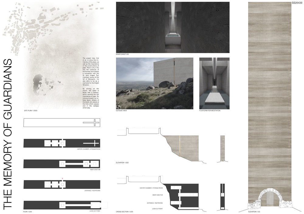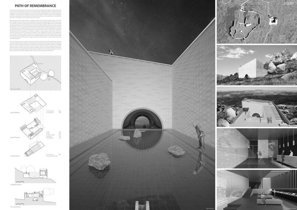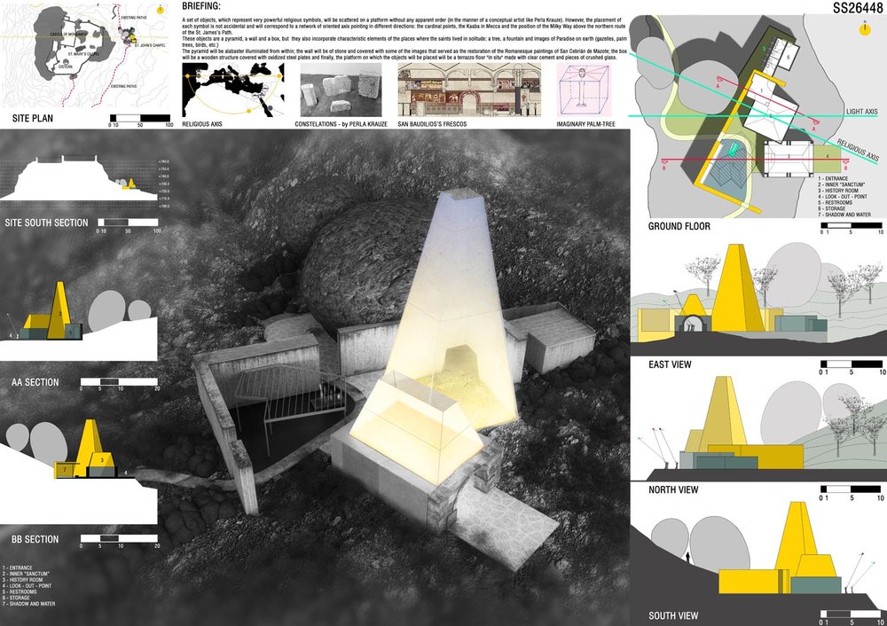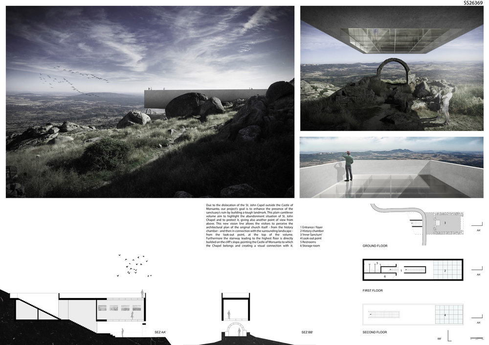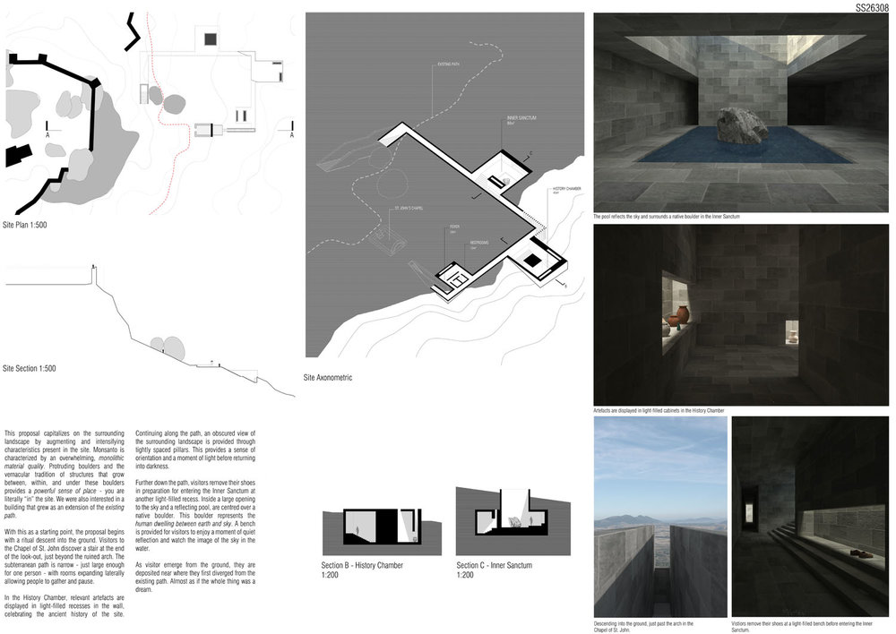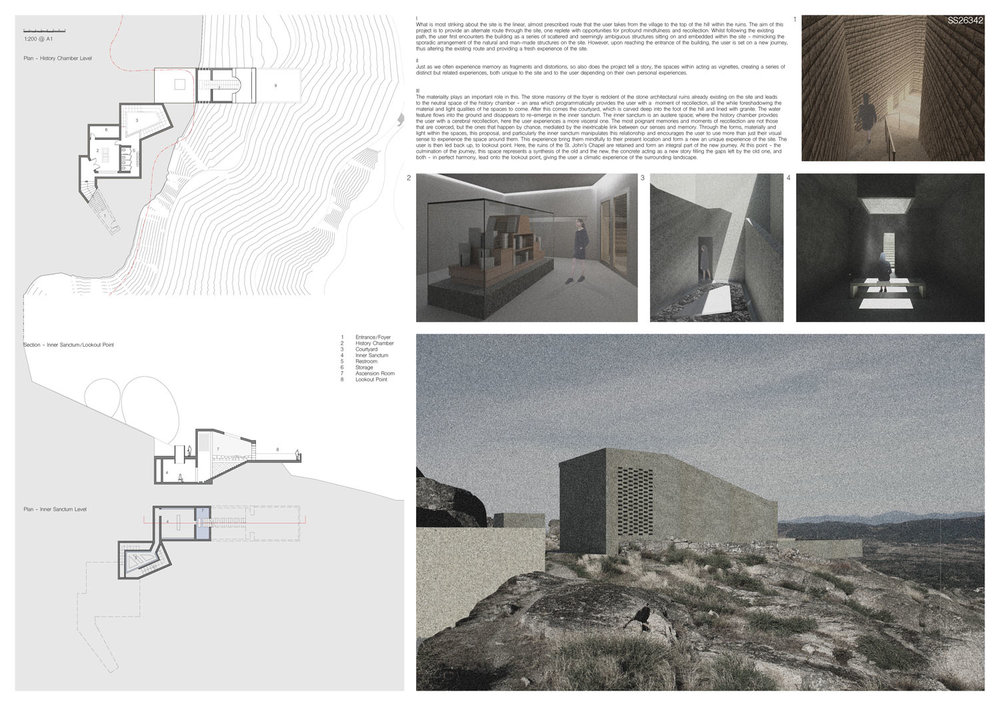 The approach is simple and elegant. The intervention is carefully placed next to St. John’s Chapel. The project defines an abstract spatial unit that contains pure geometric spaces formally linked to the site without mimicking it. The spirituality and transcendence of the proposed space is a result of this tension between the natural and the artificial, between the reflection and the abstraction. The proposal does not seek to disappear or melt into the site but it looks for a strategic position vis-à-vis the ruin, thus establishing a continuing multilateral dialogue. The inner spaces are well articulated through a sequence of scale, light, height and view changes. Also, the narrative strategy is clear, powerful and suggestive.
