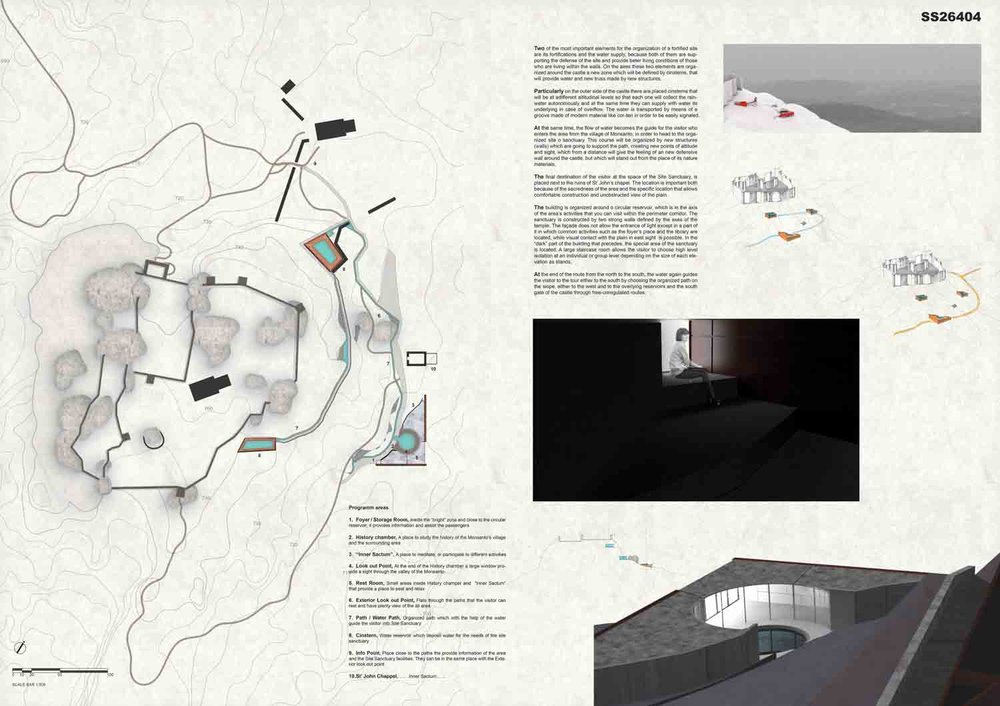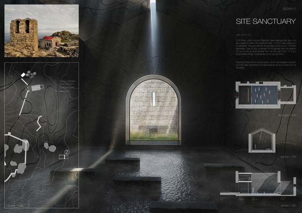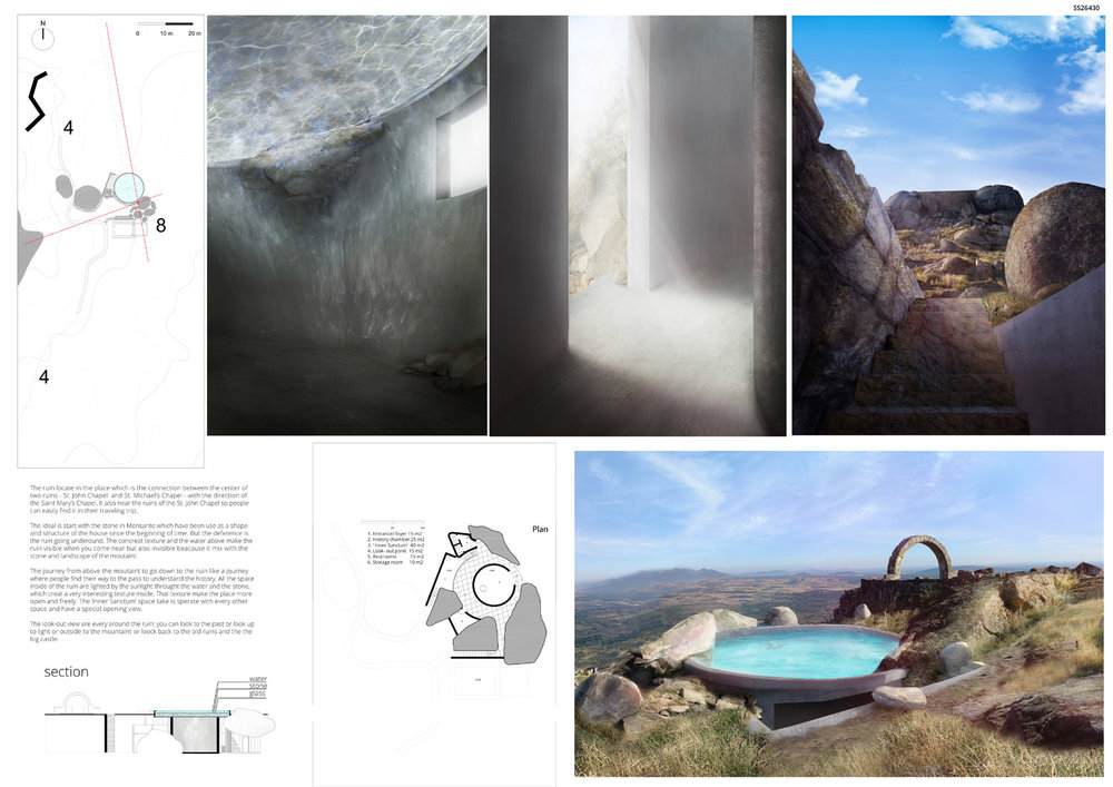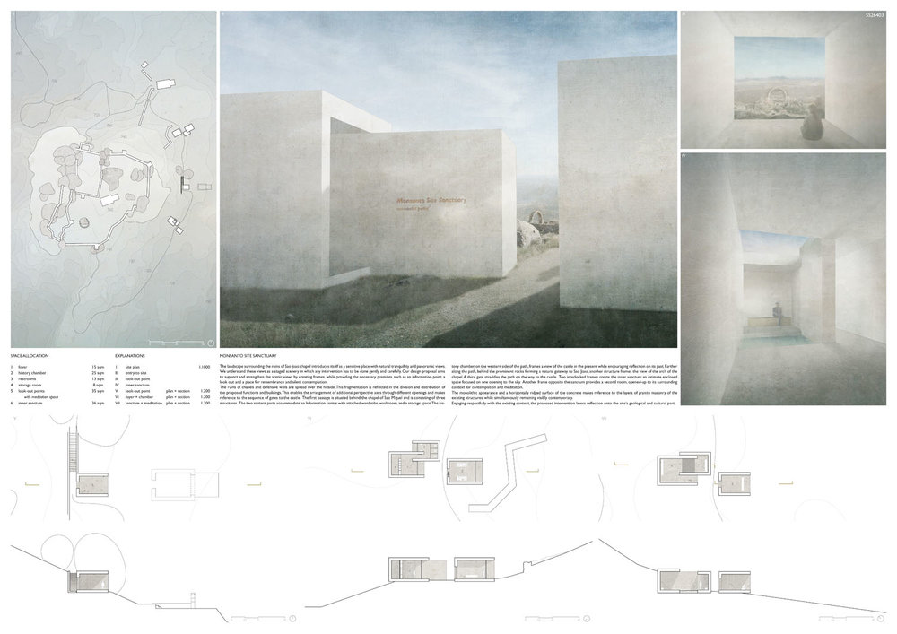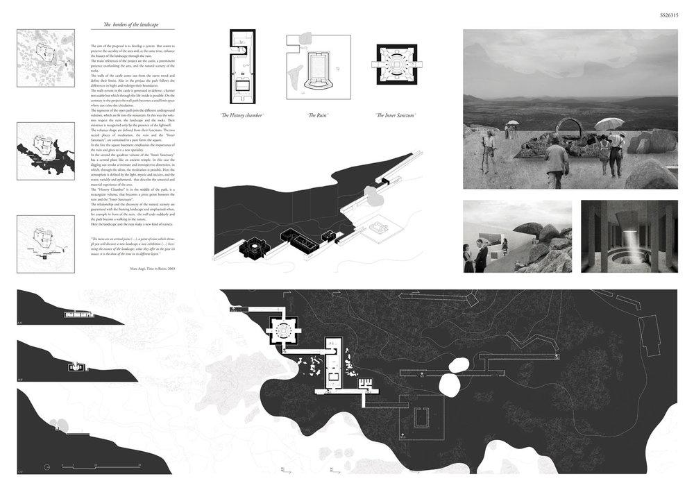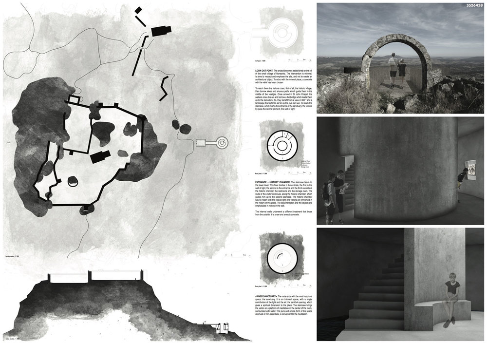 The approach is simple and elegant. The intervention is carefully placed next to St. John’s Chapel. The project defines an abstract spatial unit that contains pure geometric spaces formally linked to the site without mimicking it. The spirituality and transcendence of the proposed space is a result of this tension between the natural and the artificial, between the reflection and the abstraction. The proposal does not seek to disappear or melt into the site but it looks for a strategic position vis-à-vis the ruin, thus establishing a continuing multilateral dialogue. The inner spaces are well articulated through a sequence of scale, light, height and view changes. Also, the narrative strategy is clear, powerful and suggestive.