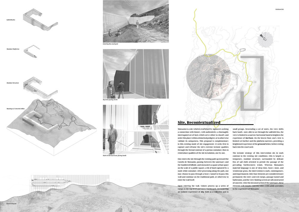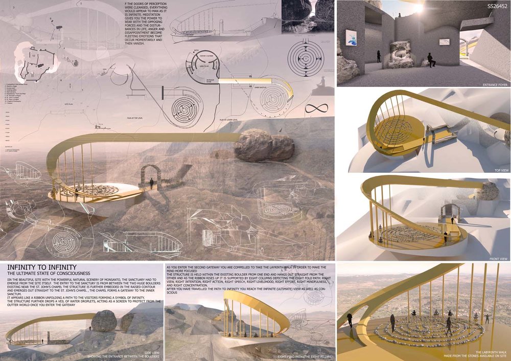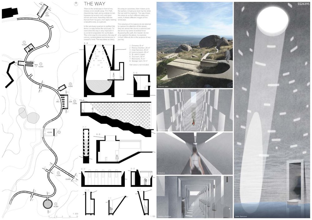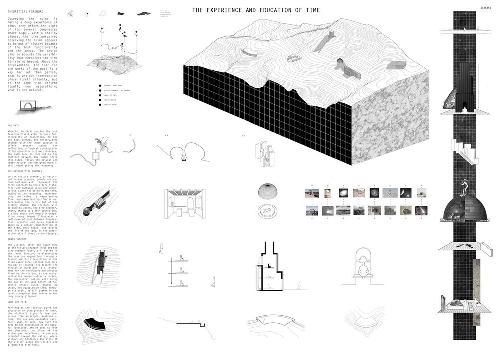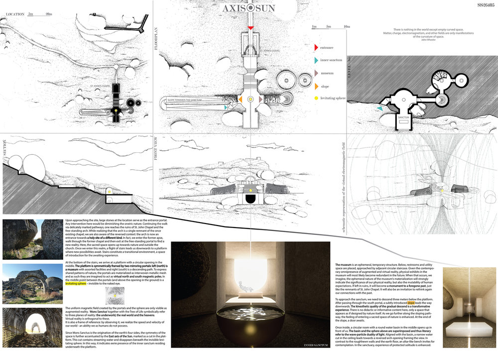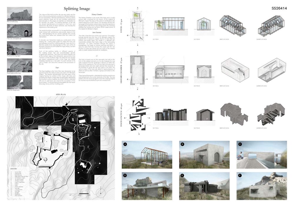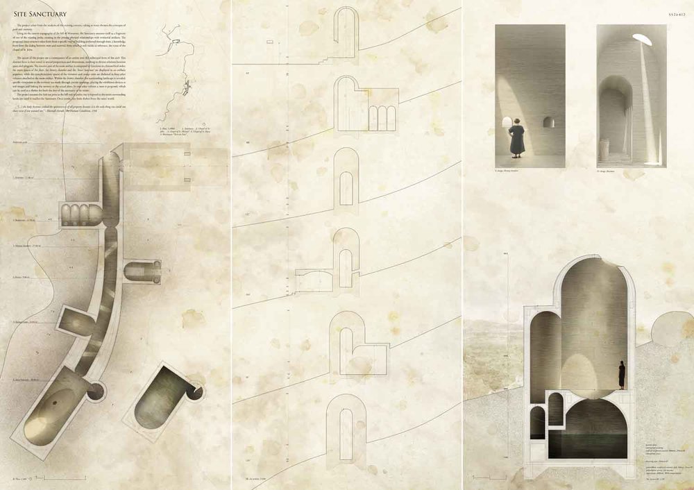 The approach is simple and elegant. The intervention is carefully placed next to St. John’s Chapel. The project defines an abstract spatial unit that contains pure geometric spaces formally linked to the site without mimicking it. The spirituality and transcendence of the proposed space is a result of this tension between the natural and the artificial, between the reflection and the abstraction. The proposal does not seek to disappear or melt into the site but it looks for a strategic position vis-à-vis the ruin, thus establishing a continuing multilateral dialogue. The inner spaces are well articulated through a sequence of scale, light, height and view changes. Also, the narrative strategy is clear, powerful and suggestive.