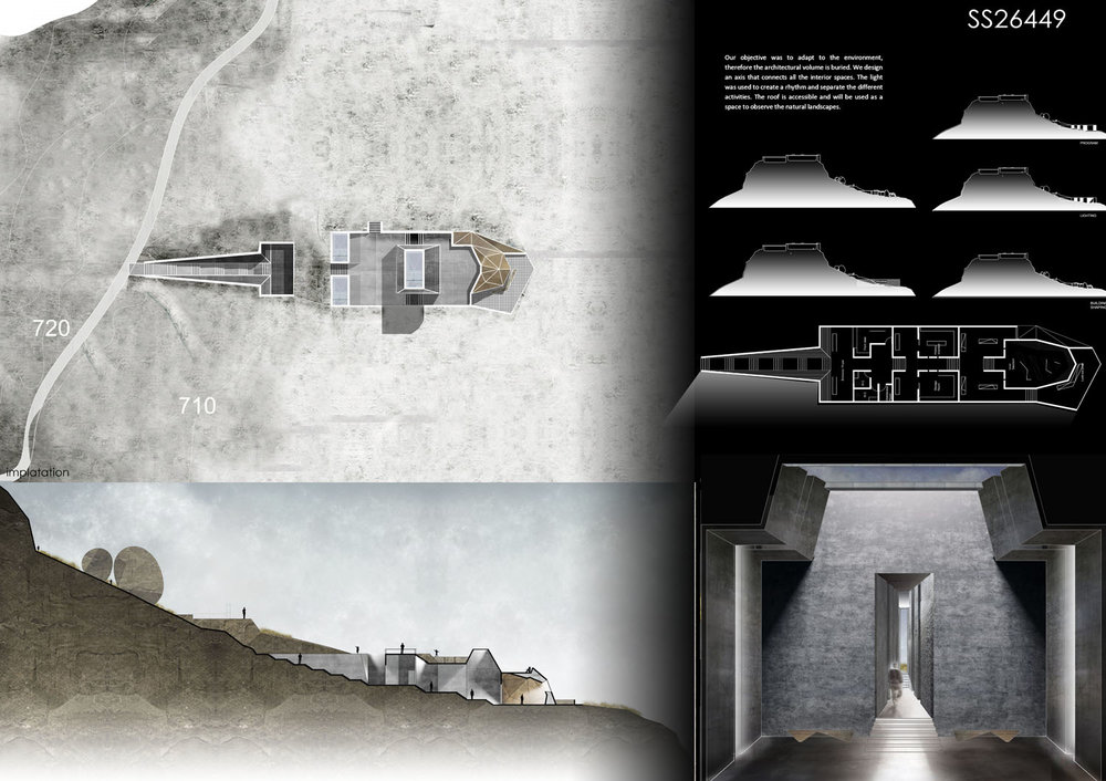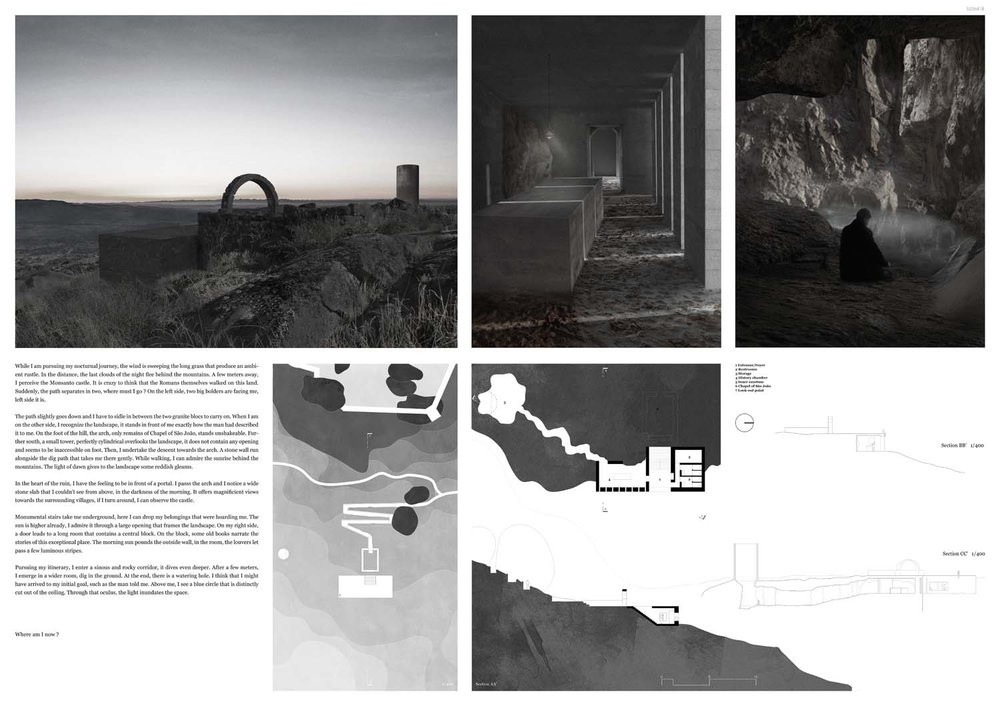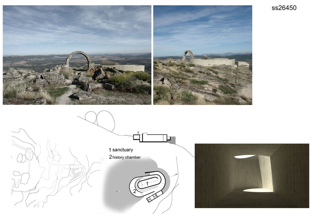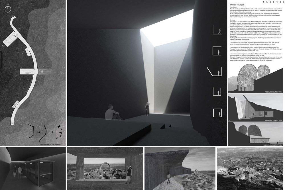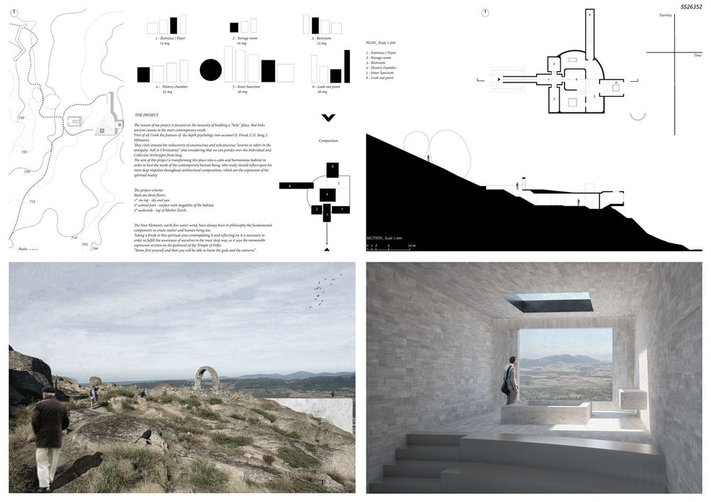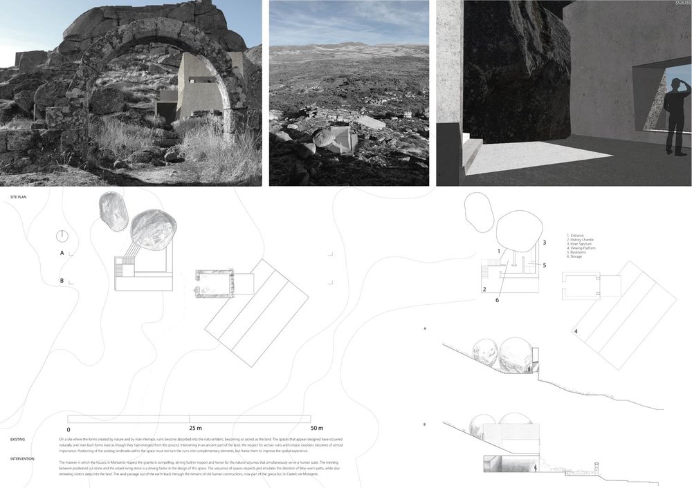 This project designs a building with a sensuous connection to life that goes far beyond form and construction. The space evokes a sombre and reflective character. A mystical and intimate interior that invites reflection is masked by a very rigid rectangular exterior. The building has a beautiful silence that is associated with attributes such as composure, self-evidence, durability, presence, and integrity, and with warmth and sensuality as well. The project has the ability to condense in one single object the site geological qualities inside the volume and the ruins monumental qualities outside it.