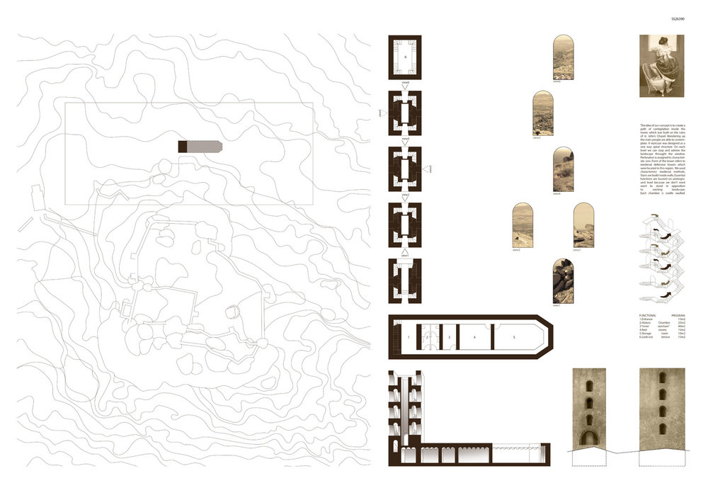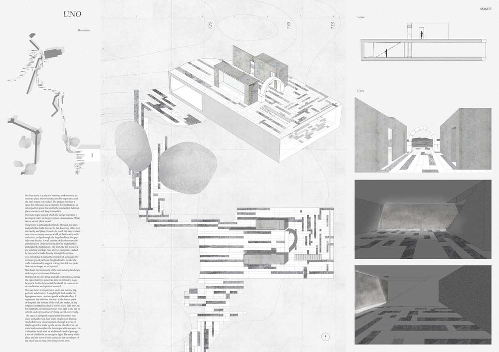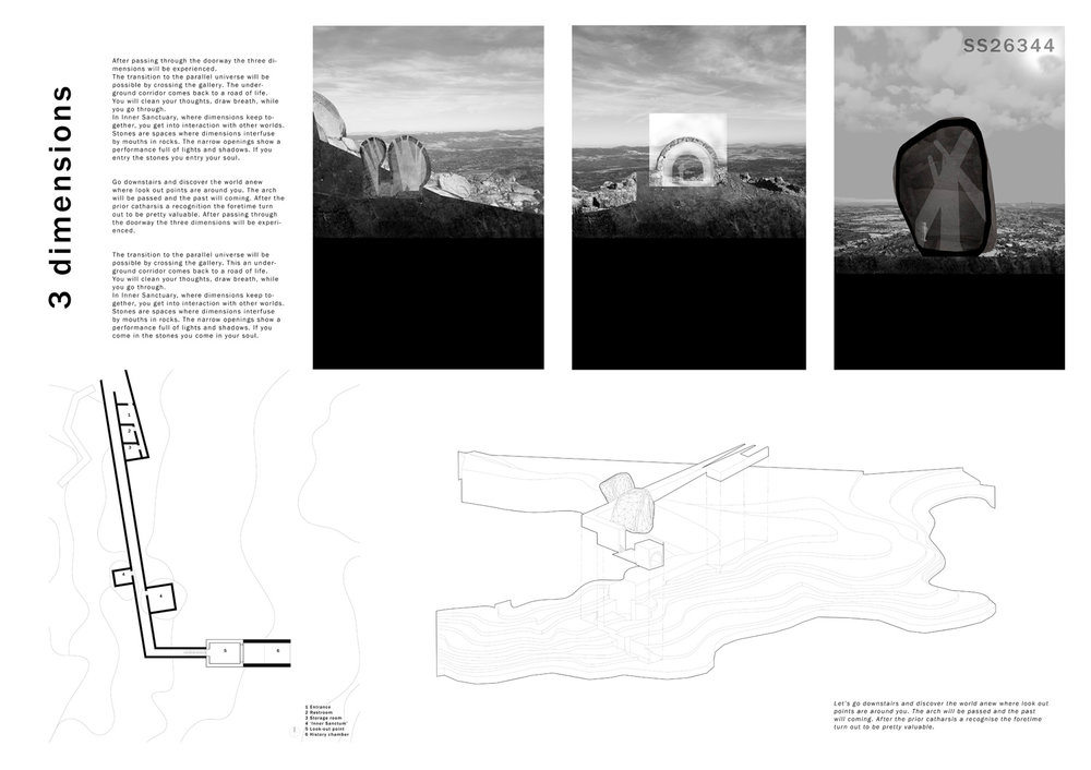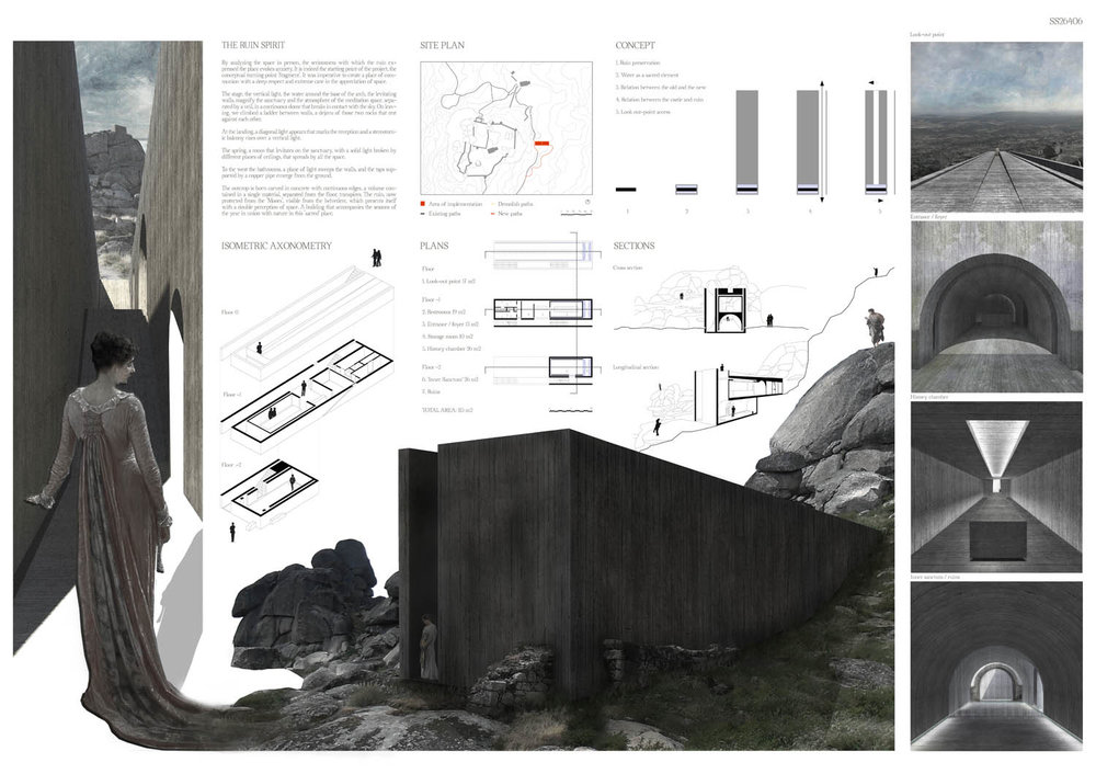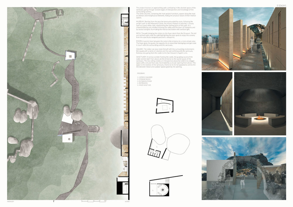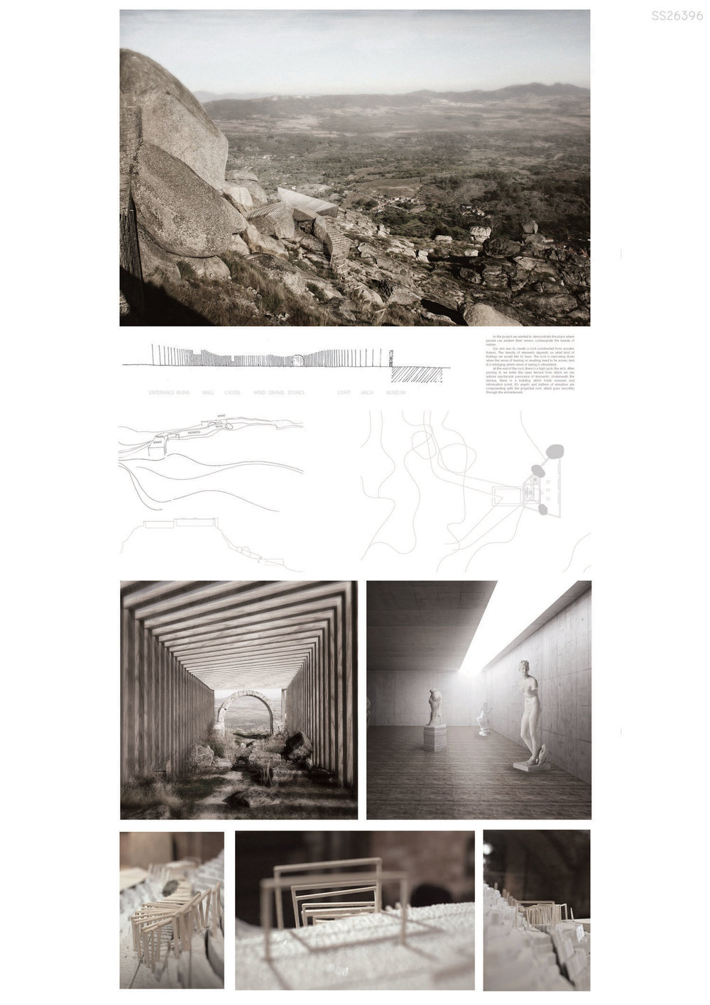 This project designs a building with a sensuous connection to life that goes far beyond form and construction. The space evokes a sombre and reflective character. A mystical and intimate interior that invites reflection is masked by a very rigid rectangular exterior. The building has a beautiful silence that is associated with attributes such as composure, self-evidence, durability, presence, and integrity, and with warmth and sensuality as well. The project has the ability to condense in one single object the site geological qualities inside the volume and the ruins monumental qualities outside it.