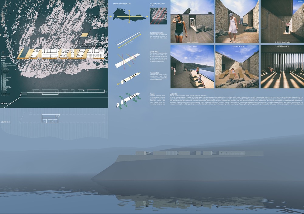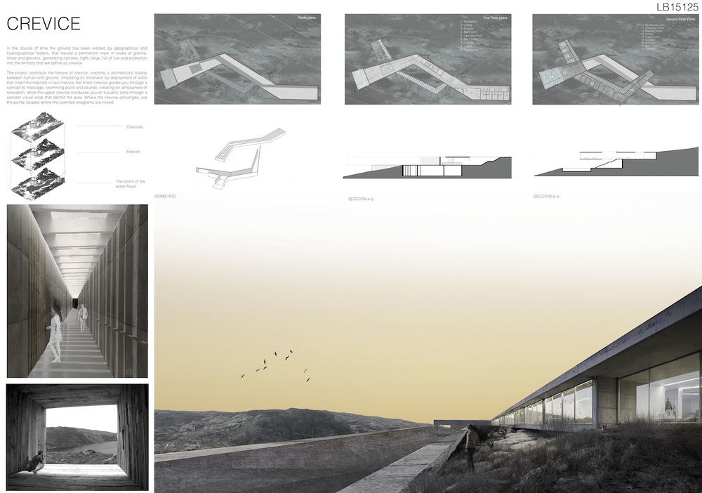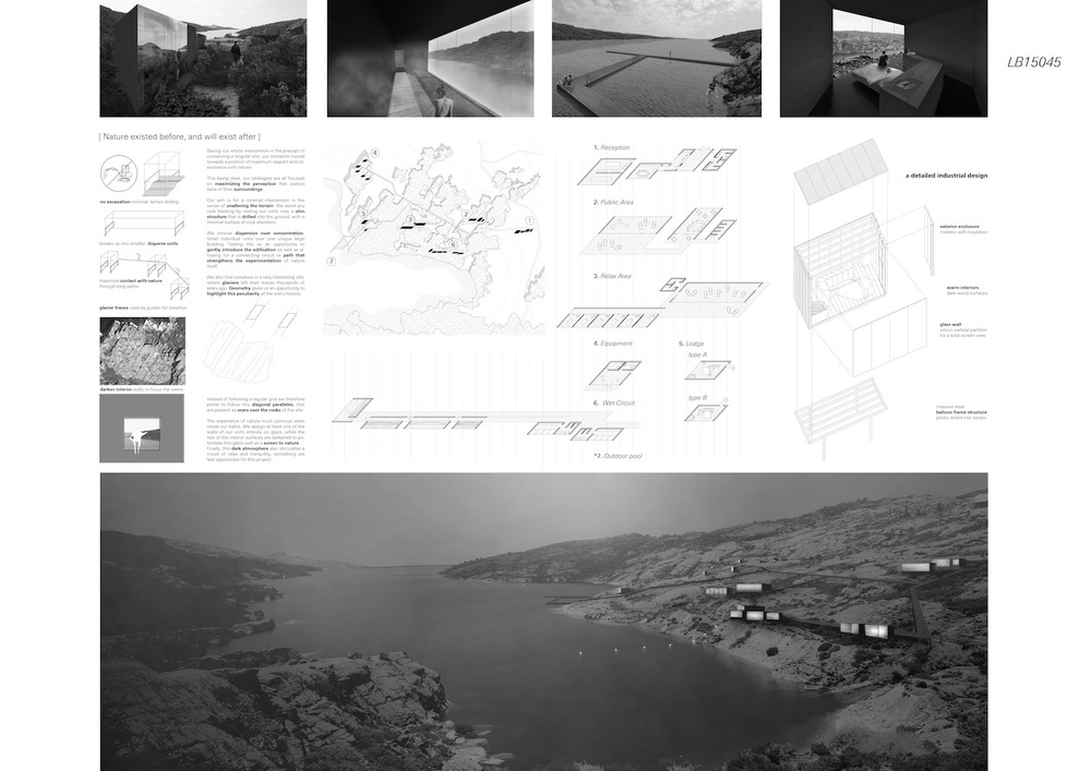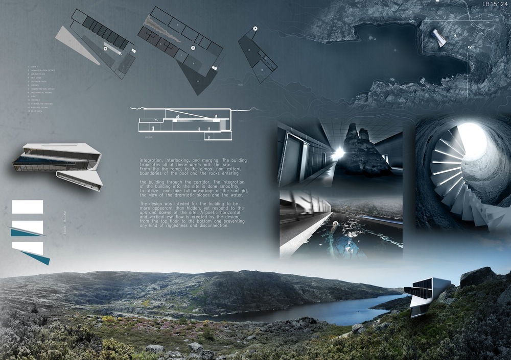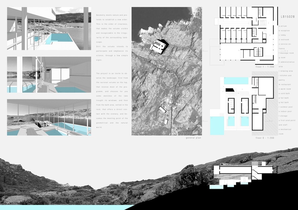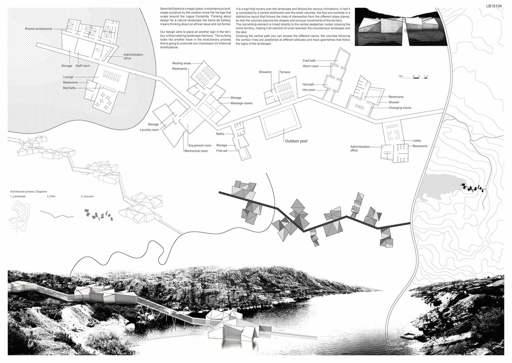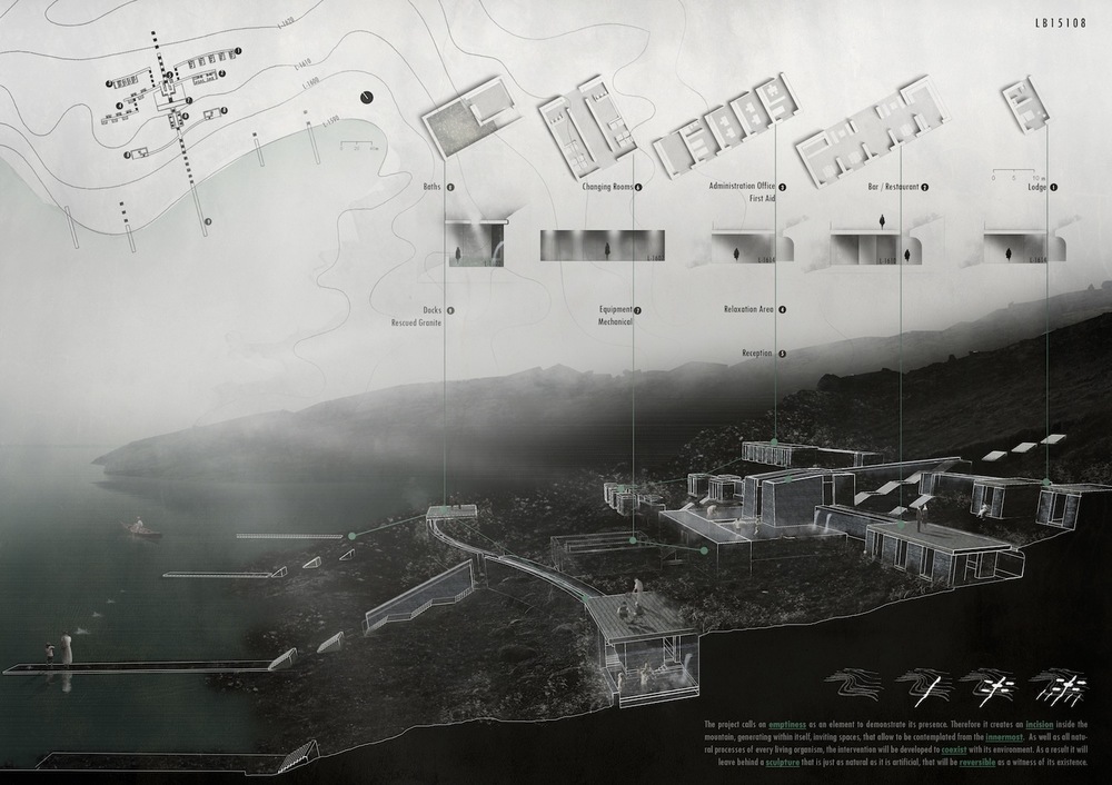 The project assumes a distance of the nature and a search of formal affirmation over the landscape at the territorial scale. On the contrary, at the scale of uses it seeks to approach nature by withdrawing into itself leaving place to the preeminence of the natural. This ambiguity added to a strict and clear functional definition, produces an object of great conceptual force.
